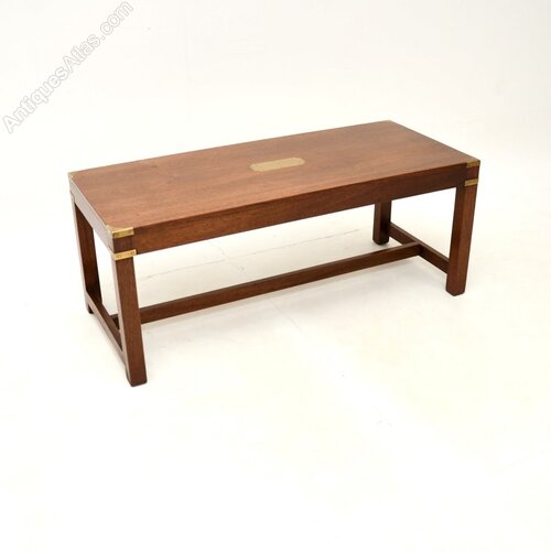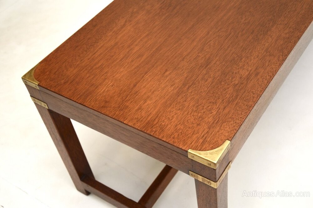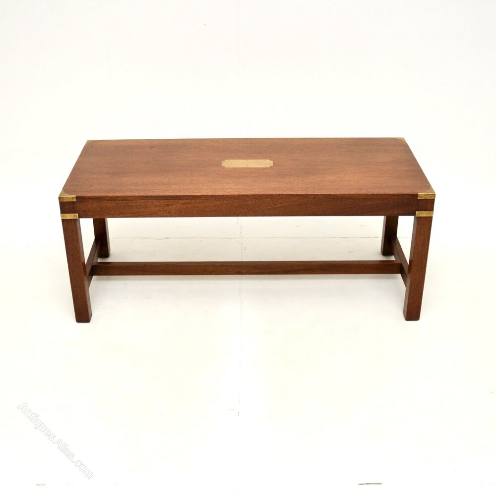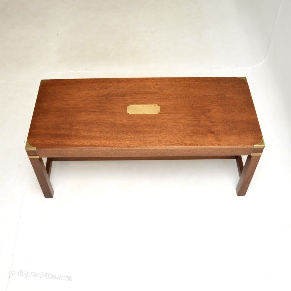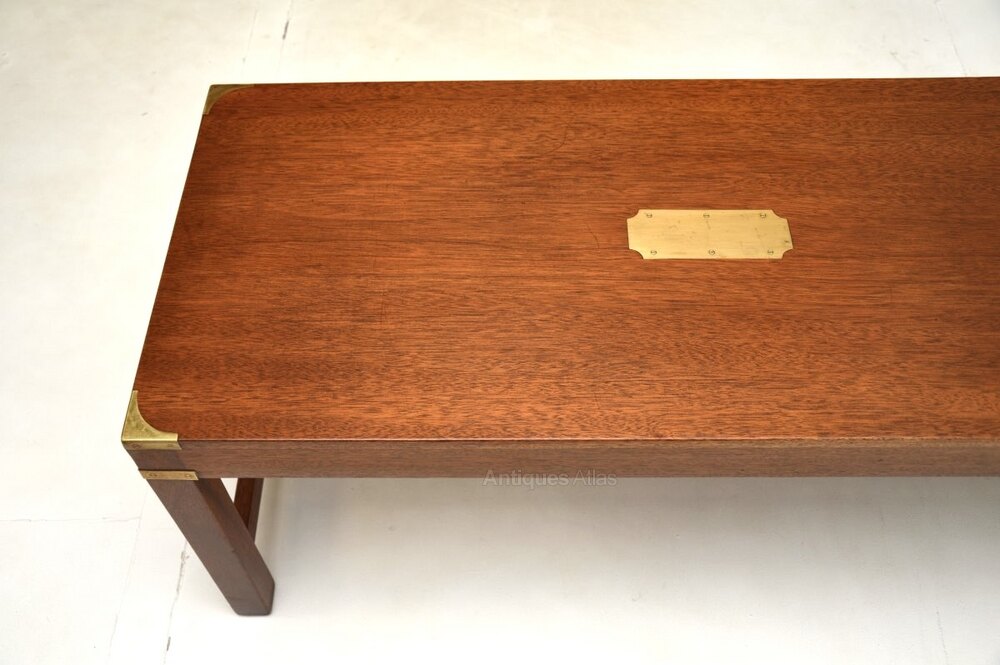 A superb antique mahogany and brass military campaign style coffee table. This was made in England, it dates from around the 1930’s.The quality is outstanding, this is very well built and has a very smart design. The mahogany has a beautiful colour tone, it is offset nicely by the brass hardware.