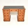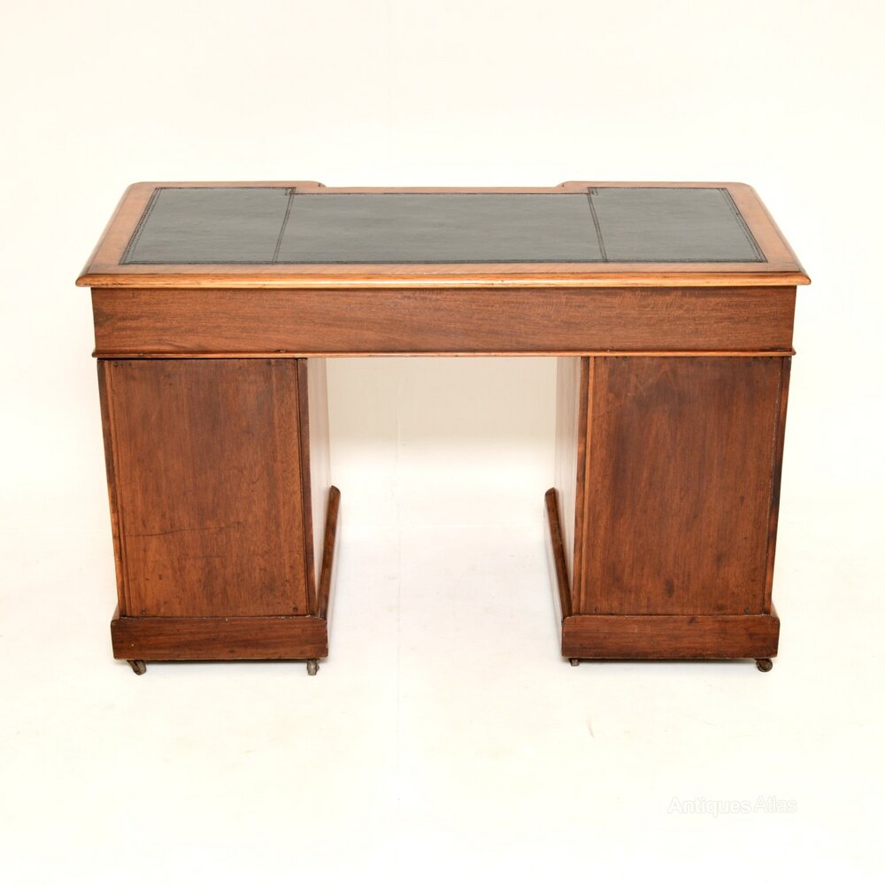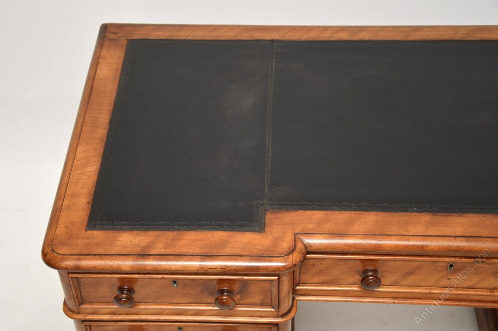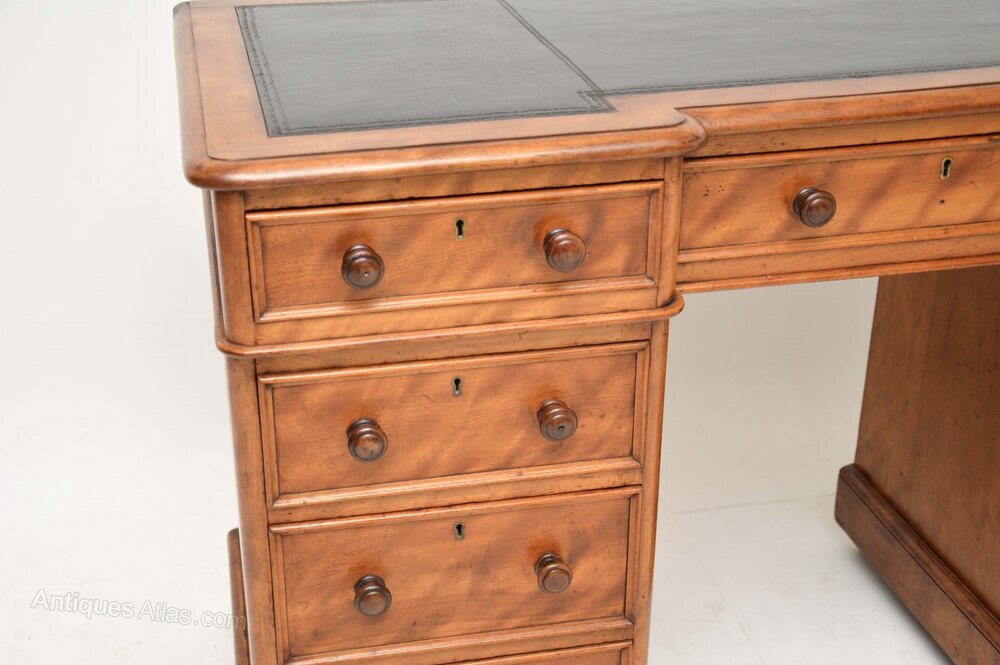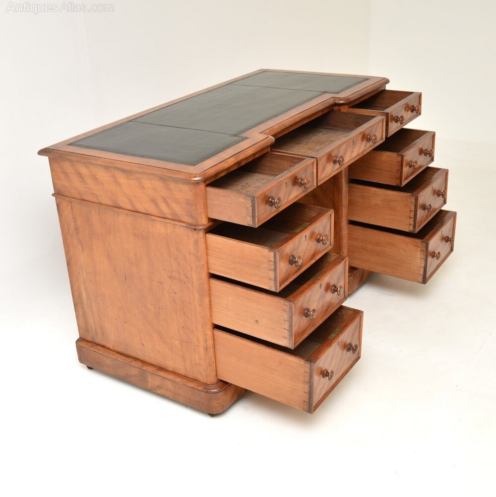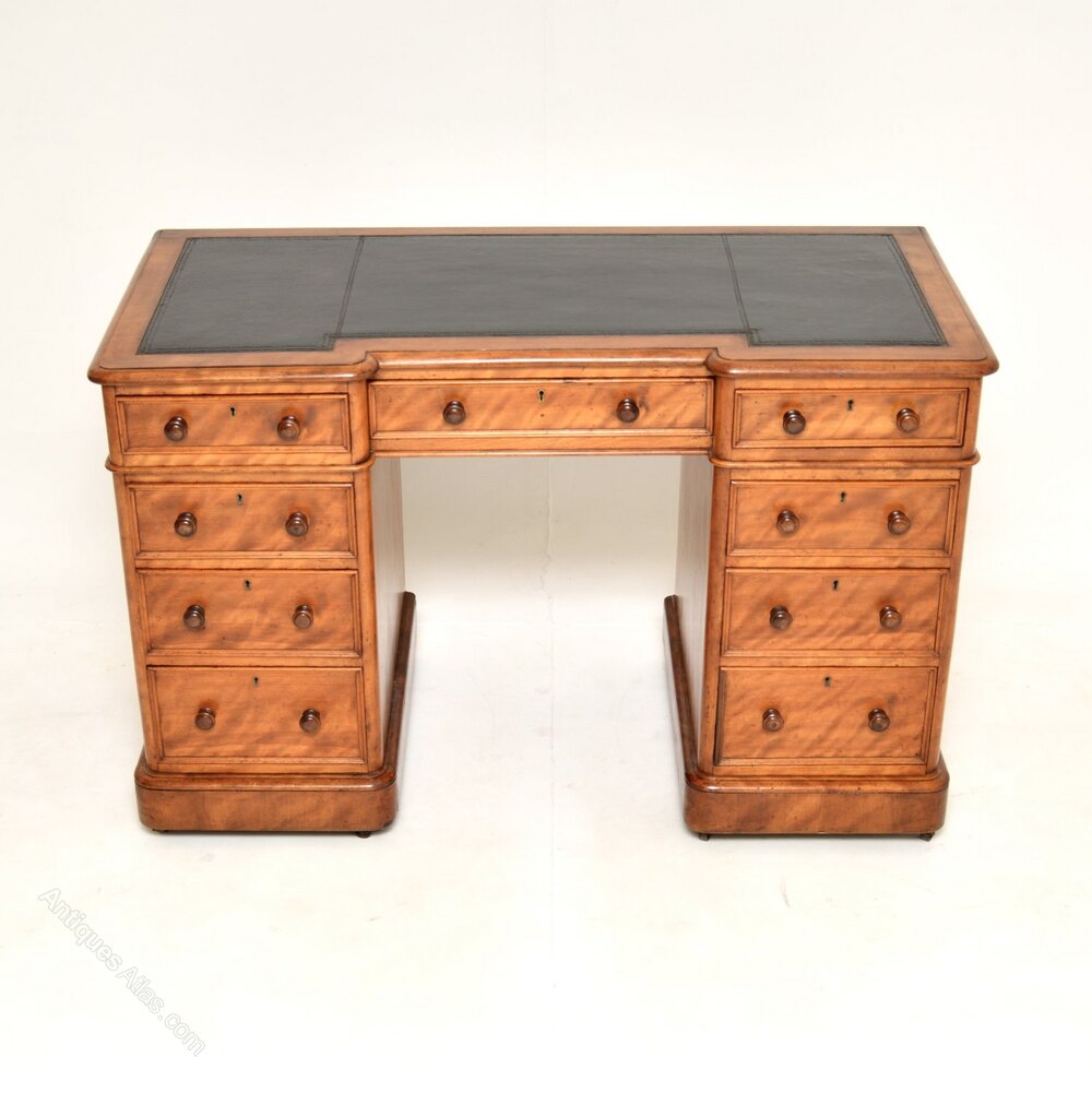 A superb antique Victorian satinwood leather top pedestal desk, beautifully made in England, it dates from around the 1860-1880 period.It is of very fine quality, with a lovely inverted breakfront design. It sits on plinth bases with concealed casters, the handles are nicely turned from solid satin wood and the back is nicely finished as well, so it can be used as a free standing item. The inset tooled leather top is a beautifully patinated black, which contrasts beautifully with the wood.