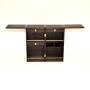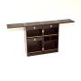 When unlocked and opened out, there are two rails that pop out and support the top when that is unfolded. The top has an inset black formica serving area. Inside there are several drawers and compartments for storing glasses and bottles, there are also two removable steel ice trays (not seen in the images but they come with this). This rolls smoothly on casters and looks amazing from all angles when opened and closed.
