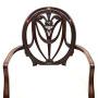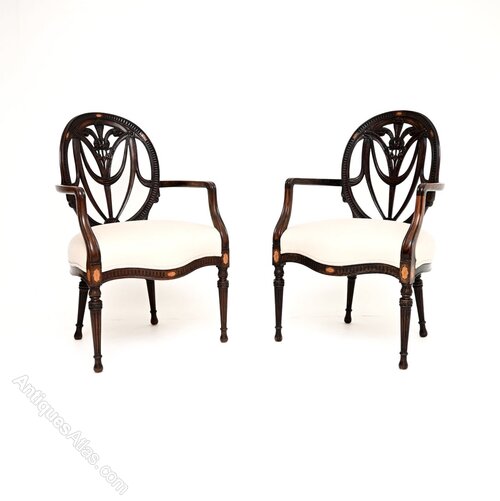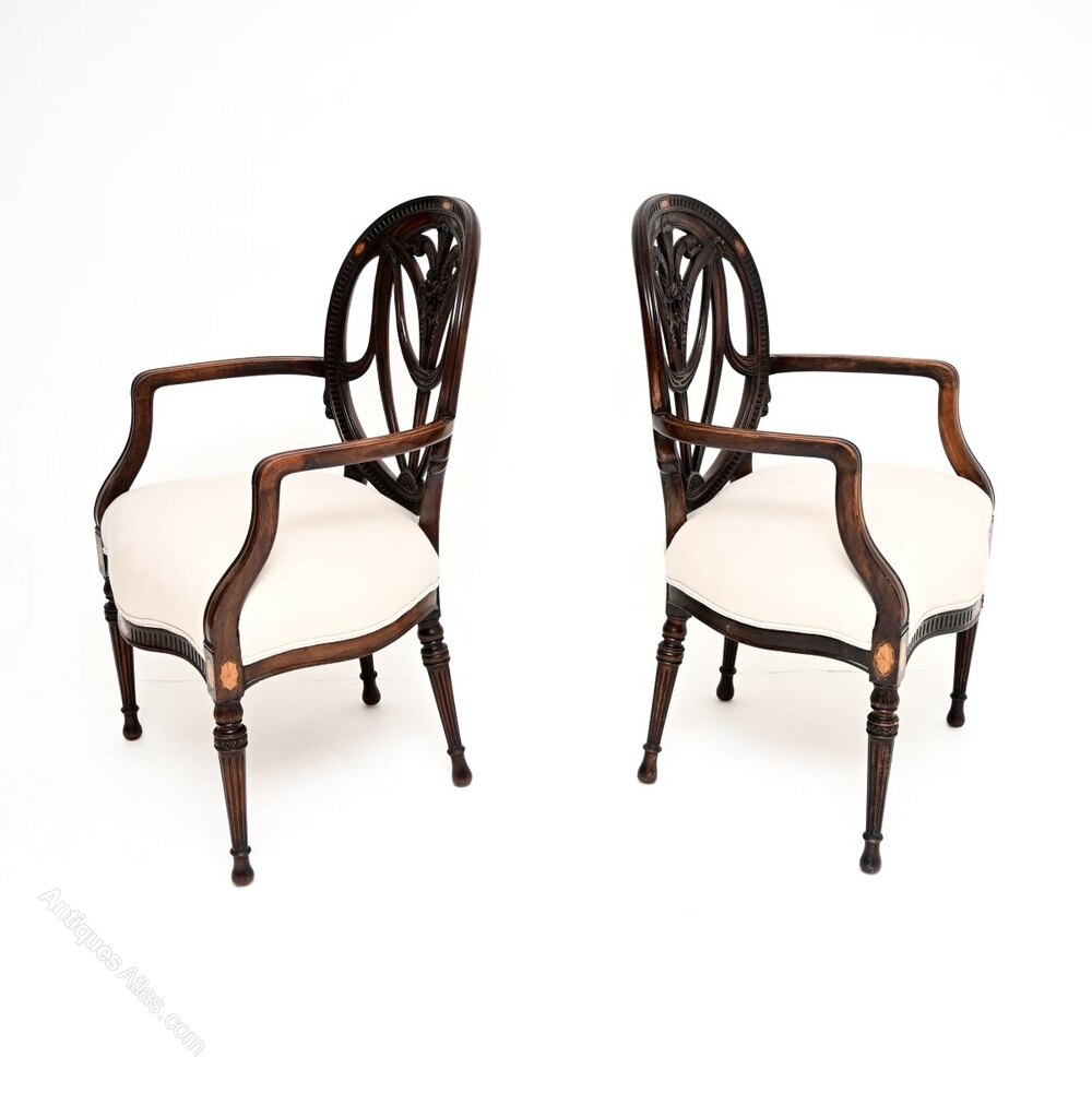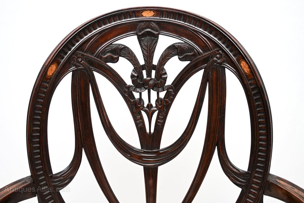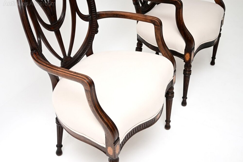 Prince of Wales feathers, swags and rosettes. They stand on fluted legs and have inlaid satin wood designs on the back rests and under the seats.