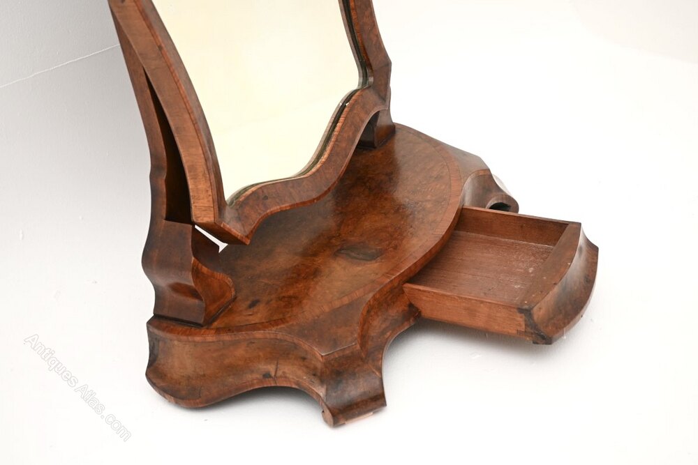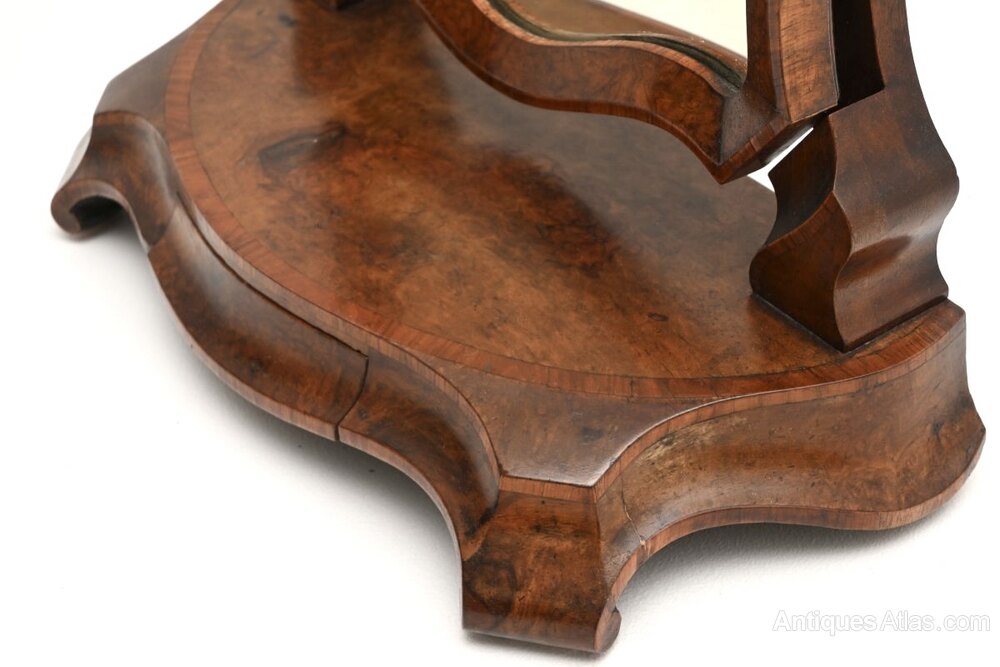 A wonderful antique Victorian burr walnut vanity mirror. This was made in England, it dates from around the 1860-1880 period.This is really well made, it is a useful and versatile item. Designed to go on top of a dressing chest or in a toilet, this can be used in a variety of settings around the home. The burr walnut grain patterns are wonderful, this has cross banded edges and sits on a beautifully shaped base. It has a gorgeous overall design and a nice little drawer that comes out of the base.