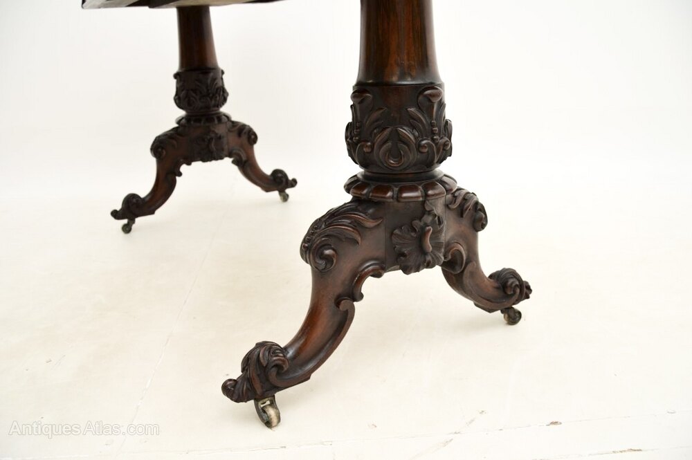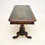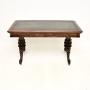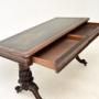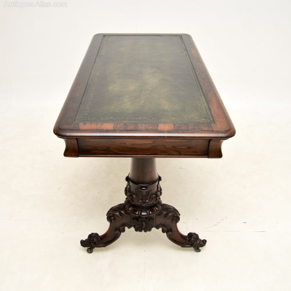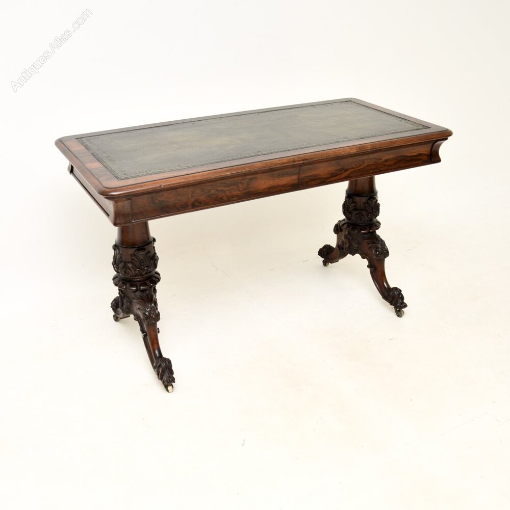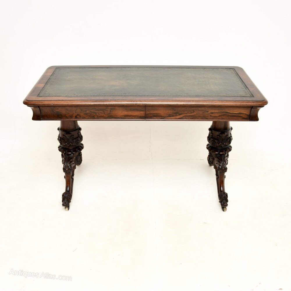 An outstanding antique William IV rosewood writing table / desk. This was made in England, it dates from around the 1830-1840 period.It is of the utmost quality, this stands on bold legs with absolutely stunning carving and brass casters. The top has beautifully moulded sides which are slightly concave, there are drawers on the front and this has a polished back, so can be free standing. The inset green leather top has tooled edges and compliments the rosewood tones beautifully.