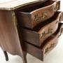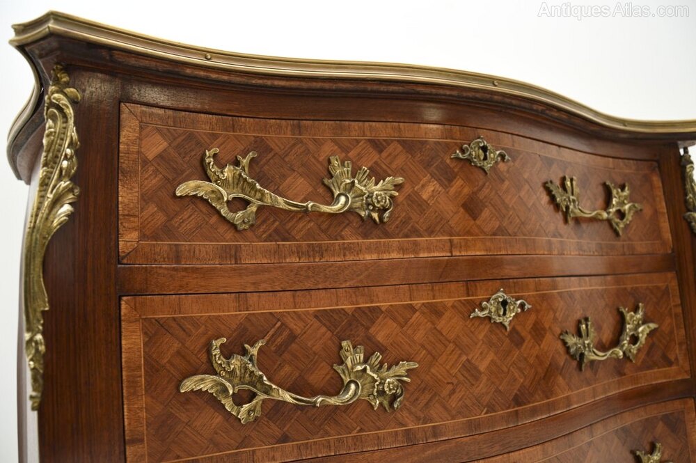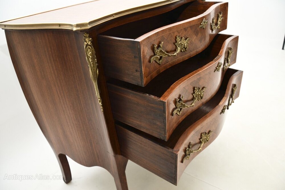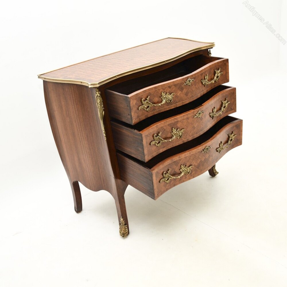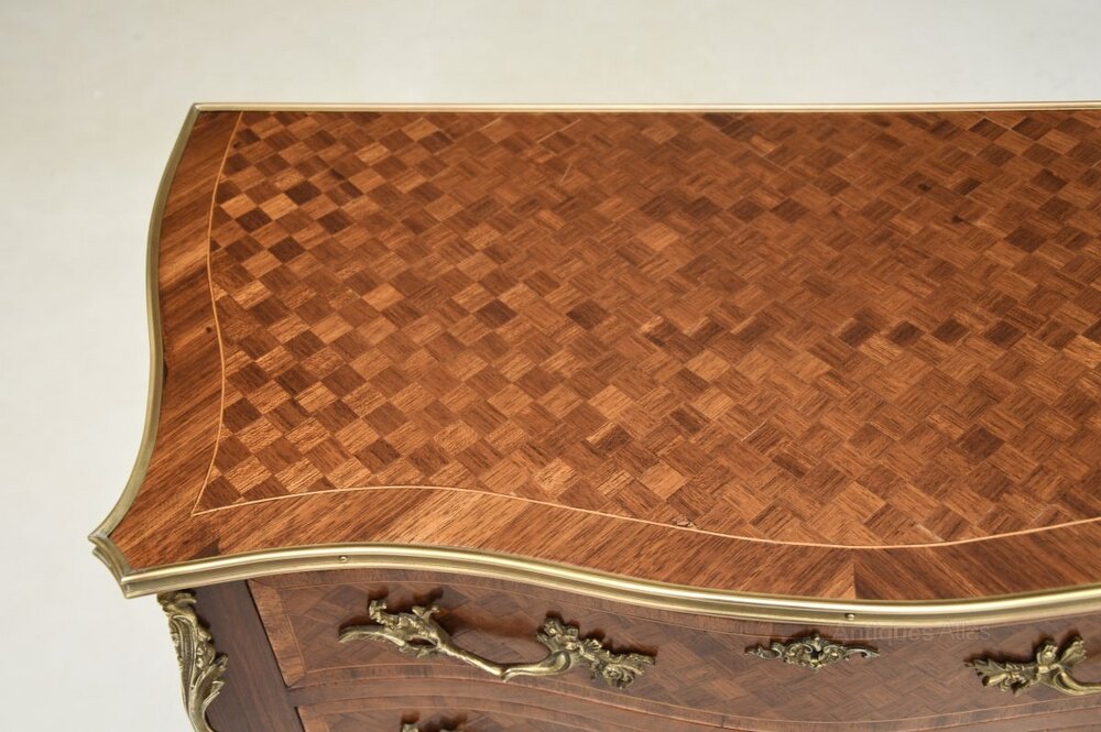 A stunning antique French inlaid parquetry commode, dating from around the 1910-1920 period.This is of outstanding quality, it is a lovely and useful size. There are fabulous inlaid geometric parquetry patterns on the top and drawer fronts, with beautifully cross banded edges. There is a brass rim around the top edge, there are also high quality gilt bronze mounts and handles. There is plenty of storage in the generous drawers, which have fine, hand cut dovetailed joints.