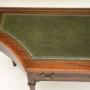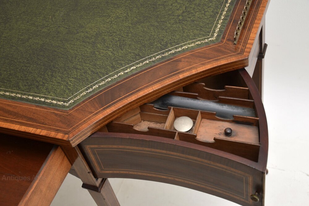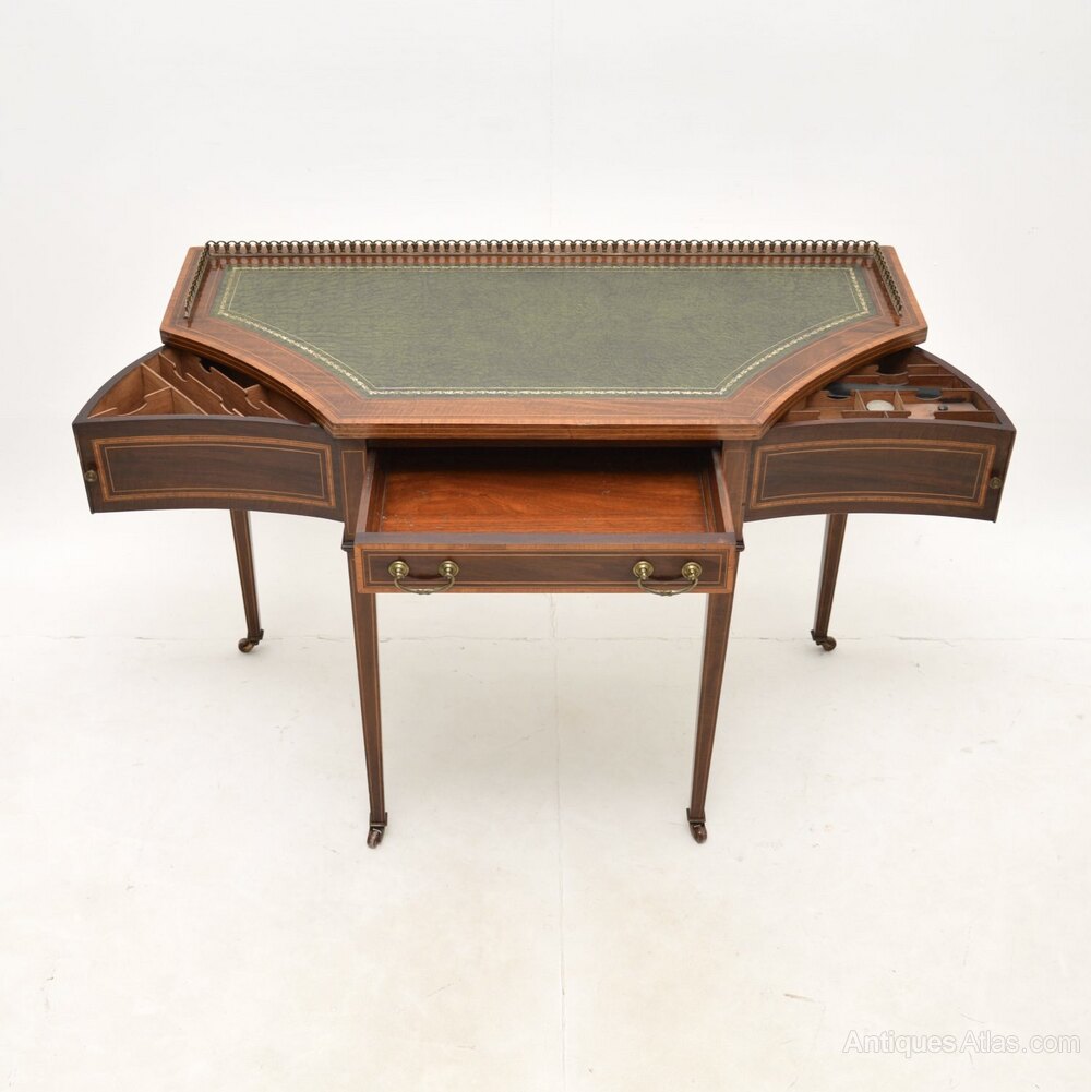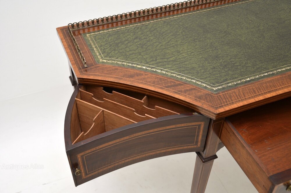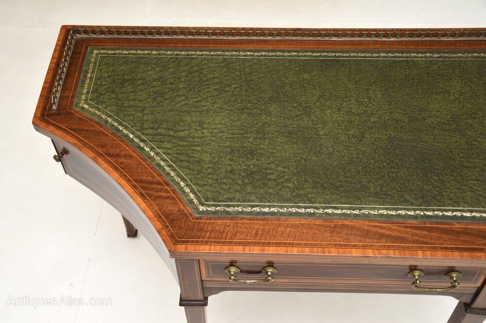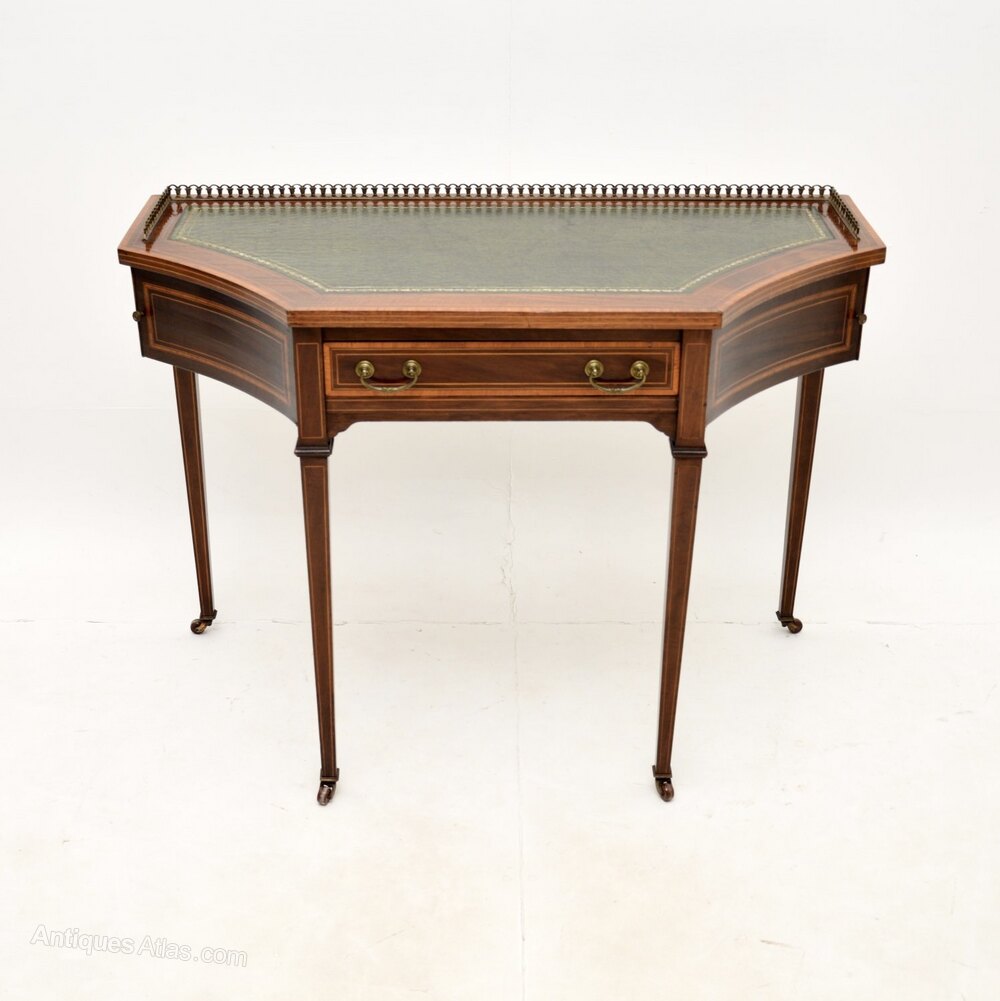 A wonderful antique Edwardian inlaid mahogany writing table / desk. This was made in England, it dates from the 1900-1910 period.It has a fantastic design and is of superb quality. The break fronted top has a pierced brass gallery, it stands on tapered legs terminating in brass casters. The mahogany has beautiful satin wood inlays throughout and top quality brass handles on the drawers. The central drawer opens normally, the two drawers either side open on hinges and contain divided compartments for letters and stationary. There is even an original glass inkwell inside one drawer. There is an inset gold tooled green leather writing surface which compliments the mahogany beautifully.