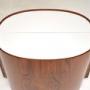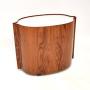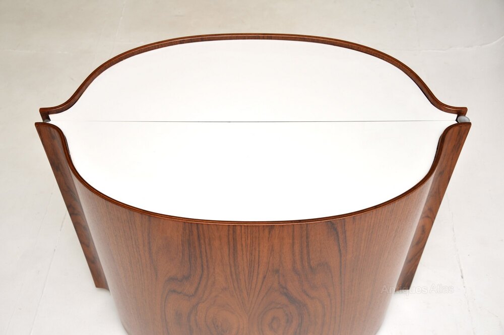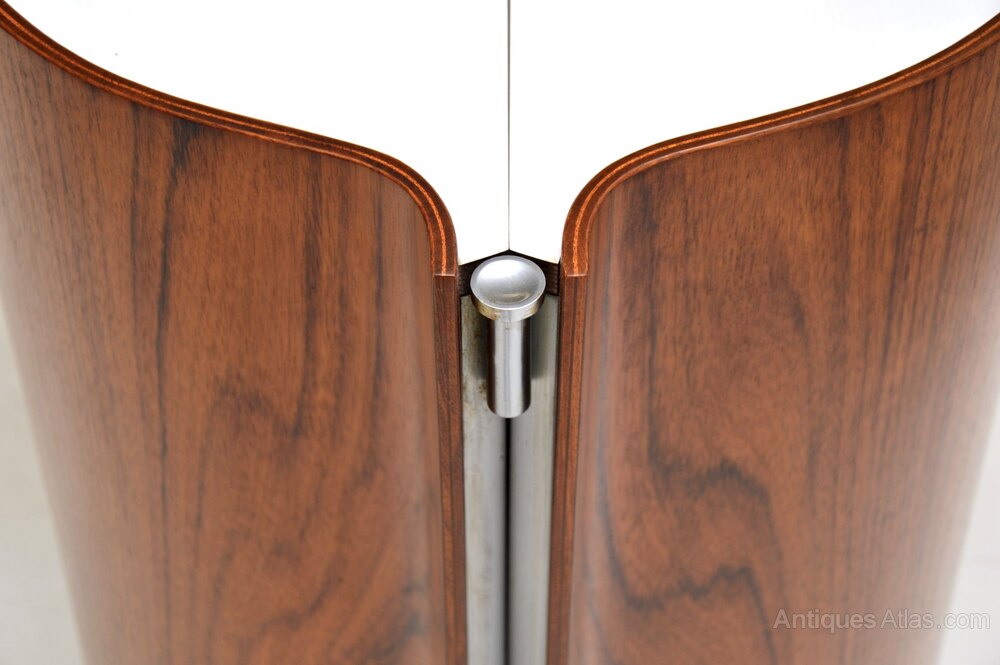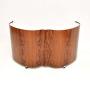A very stylish and extrmely rare vintage Italian rosewood drinks cabinet by Eugenio Gerli for Tecno. It was made in Italy, and dates from the 1960-70’s.The quality is outstanding and this has a fantastic design. When closed it is identical front and back, with beautiful bookmatched rosewood grain patterns and a white formica top. There is a stainless steel catch mechanism that when pushed down, allows the bar to open, revealing white formica topped storage and serving space. This rolls smoothly on chrome casters.