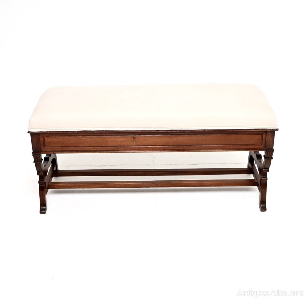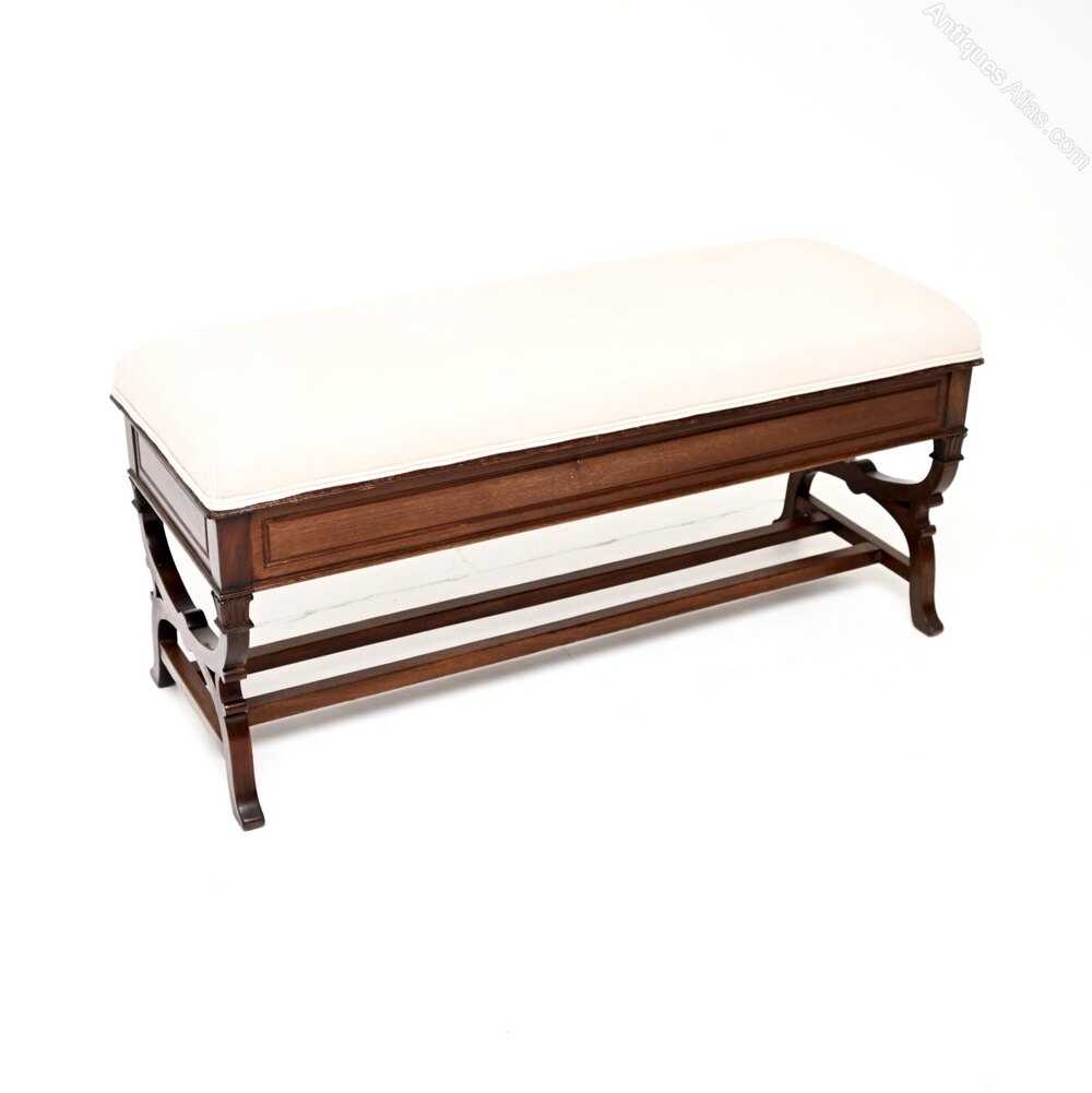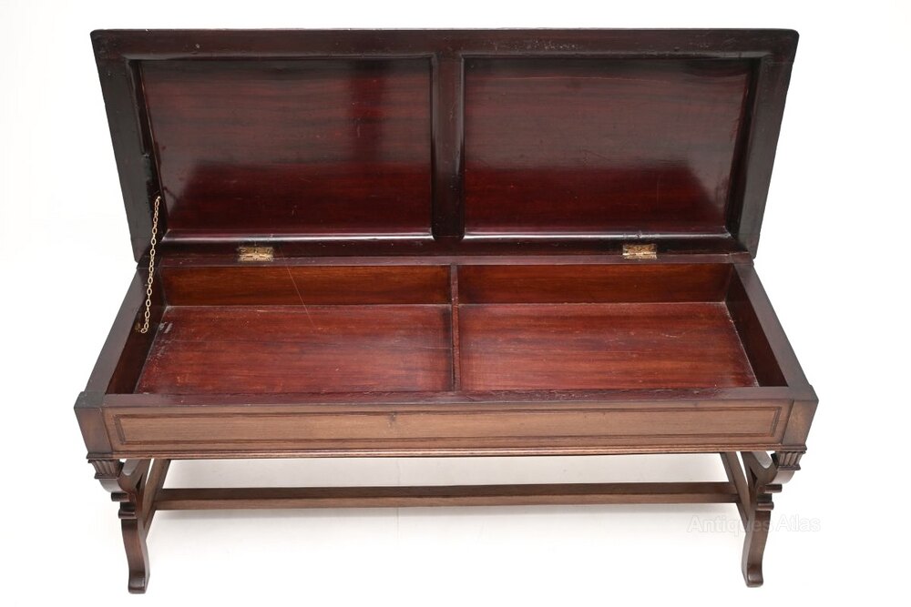 A beautiful and very well made antique Victorian mahogany piano duet stool / bench. This was made in England, it dates from the 1880-1900 period.The quality is excellent this has a lovely and very useful design. Designed for duets at a piano, this is very useful as a storage bench for an entry way, window seat or even at the foot of a bed. There are beautiful mahogany grain patterns and colour tones all sides, the front and back are finished identically, so it can be used as a free standing item. The upholstered seat lifts up to reveal a useful storage compartment, this has a finely turned stretchered base, a beautiful pierced and carved shape to the sides.