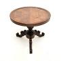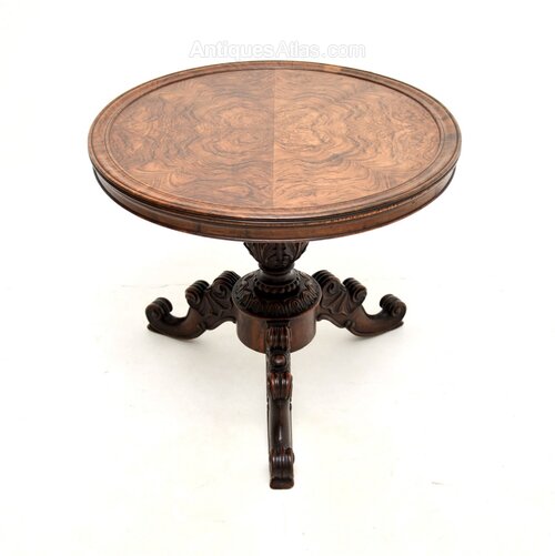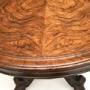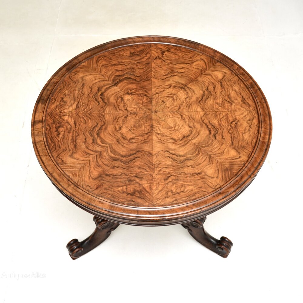 A stunning antique Victorian burr walnut occasional / coffee table. This was made in England, it dates from around the 1840-50’s period.It is of outstanding quality, it is quite unusual to find a table of this design in this size. The circular top has a raised lipped edge and is segmented with incredible burr walnut grain patterns forming an impressive pattern. This sits on a beautifully carved solid walnut tripod base with exquisite details.