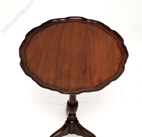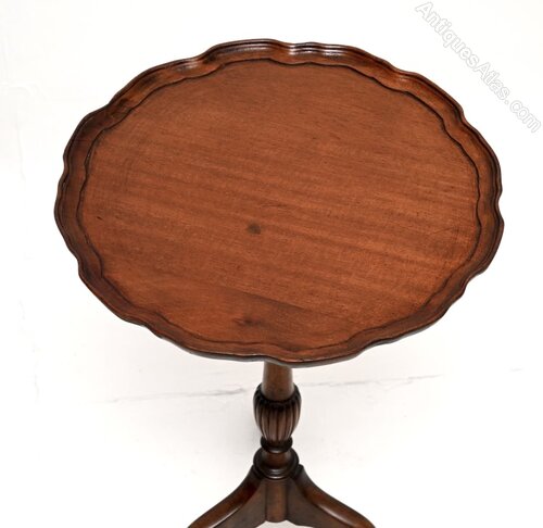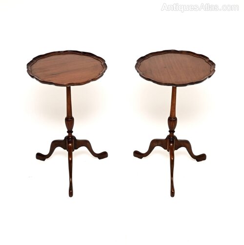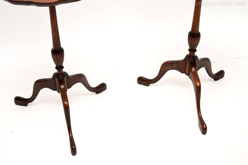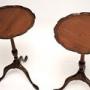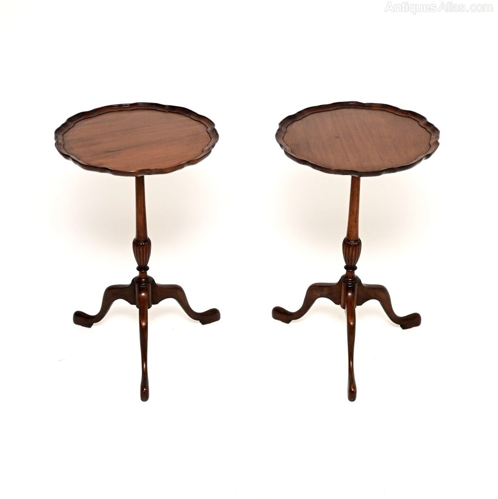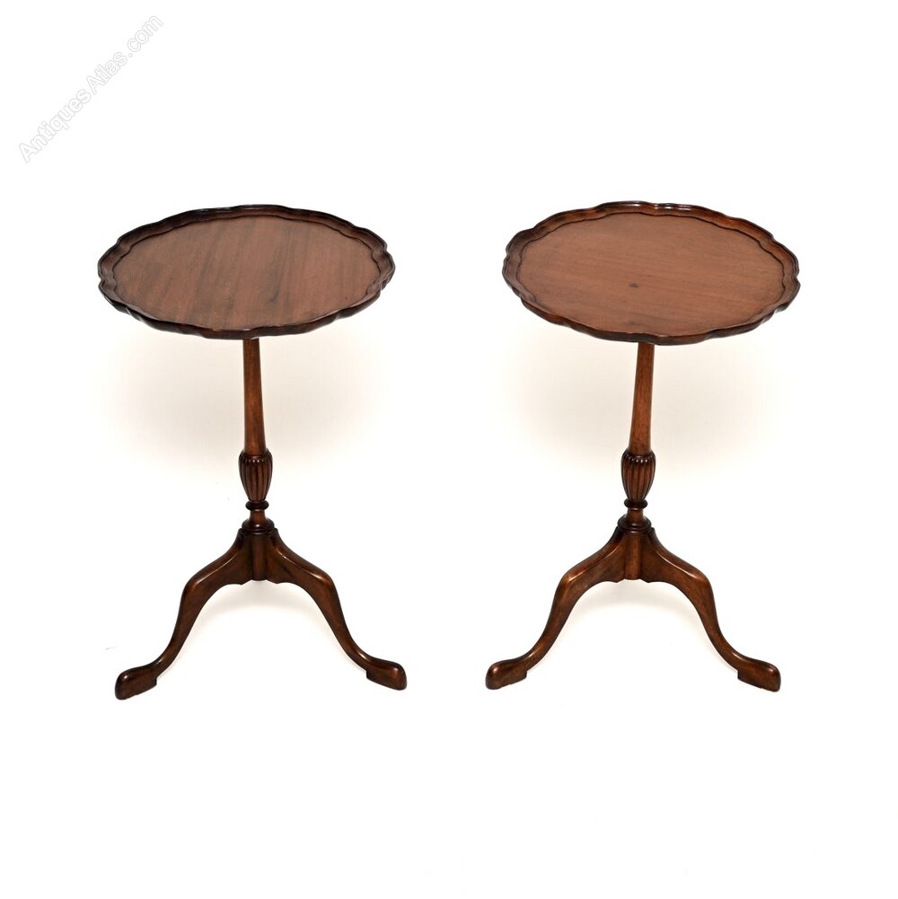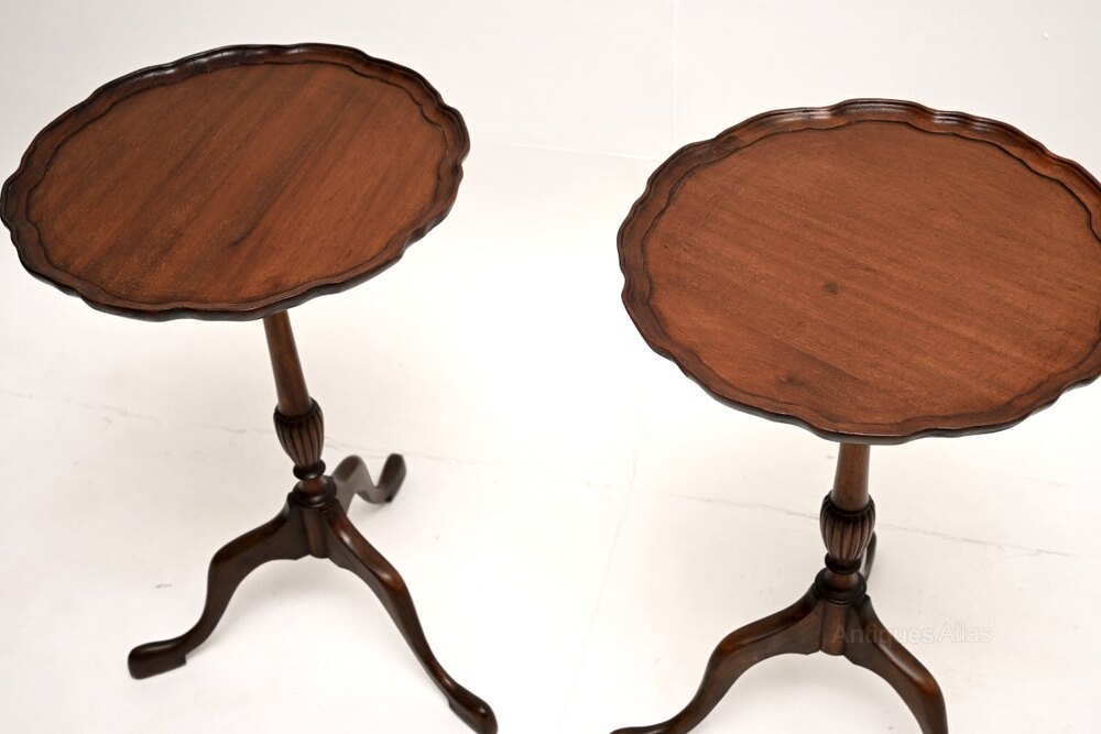 A smart and extremely well made pair of antique mahogany wine tables. They were made in England, they date from around the 1900-1910 period.They are of superb quality and are a very useful size. They are perfect for resting drinks and objects, they are petite and easy to move around. The tops have raised pie crust edges and stand on tripod bases, they are sturdy and sound.