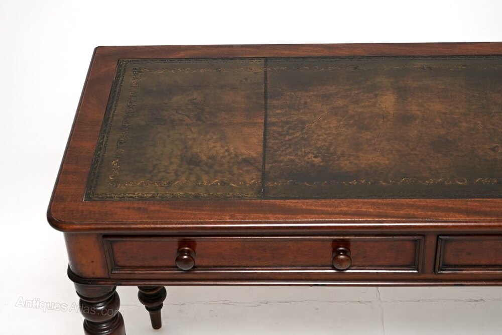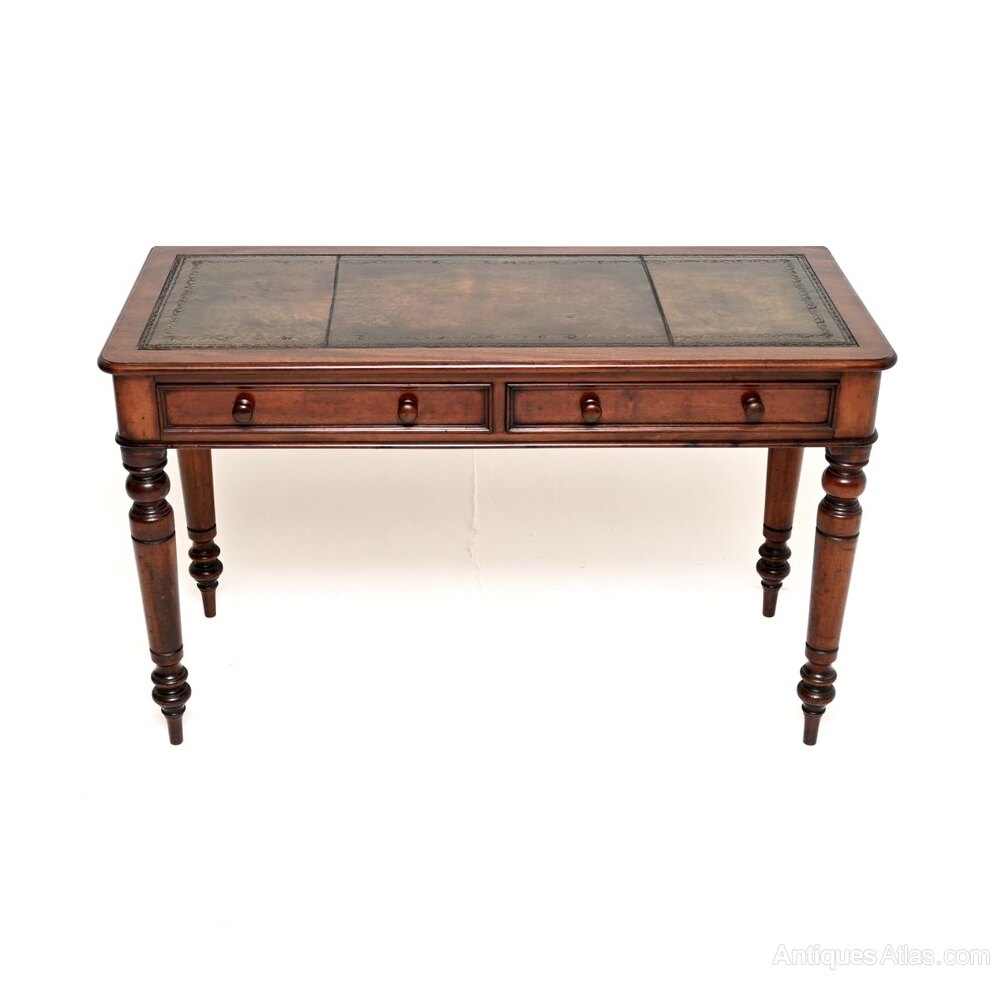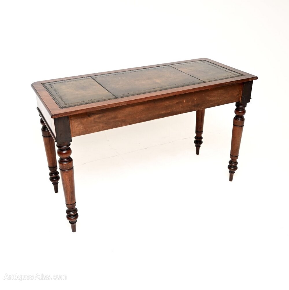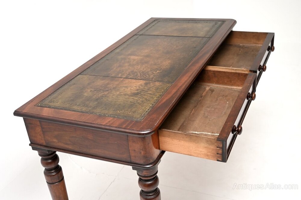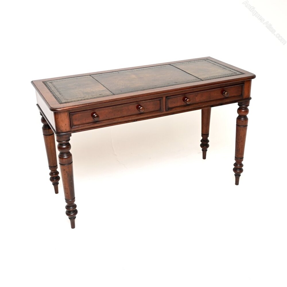 A wonderful antique Early Victorian mahogany writing table / desk. This was made in England, it dates from around the 1840-1860 period.This is of outstanding quality and is a very useful size, with lovely proportions. It stands on beautifully turned and very sturdy baluster legs. There are two drawers with nicely turned handles and fine, hand cut dovetailed joints. There is an inset leather top with gold tooled edges, the leather has a beautiful colour which compliments the mahogany nicely.