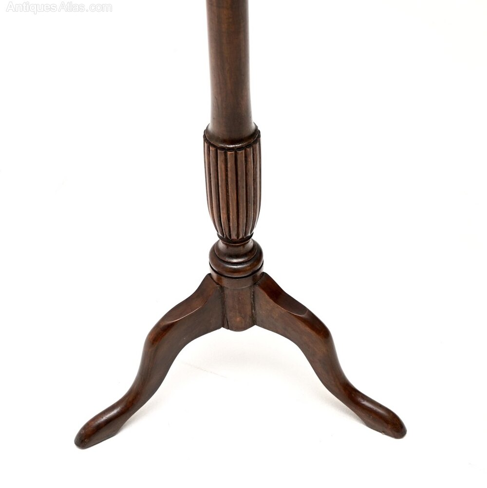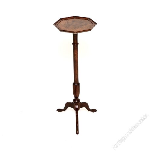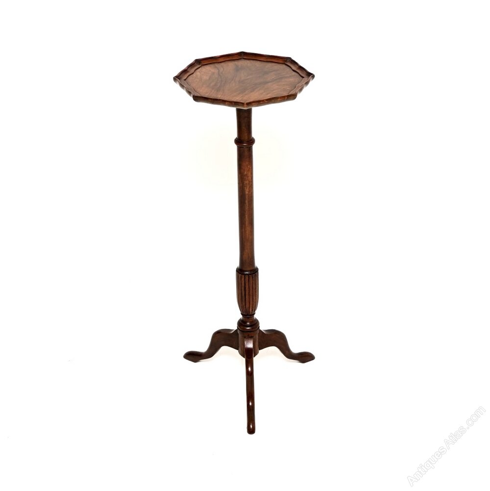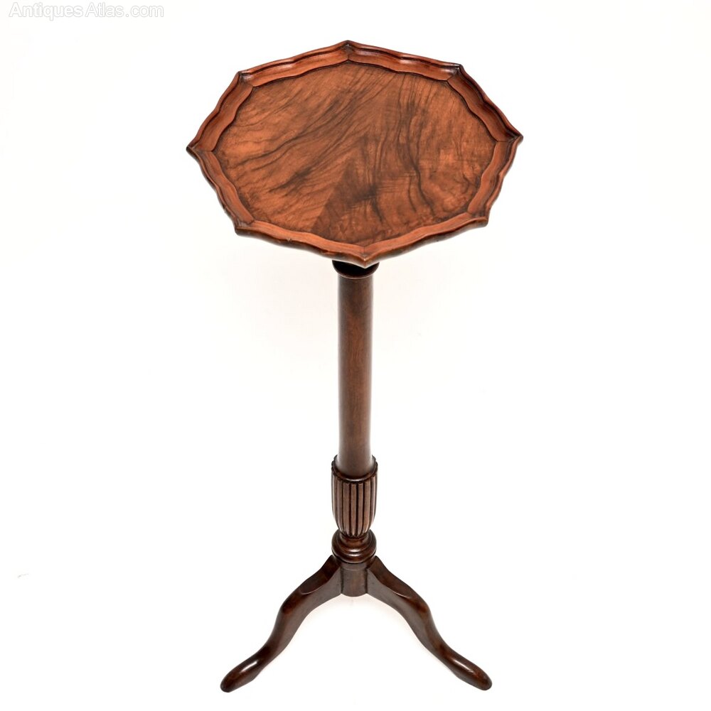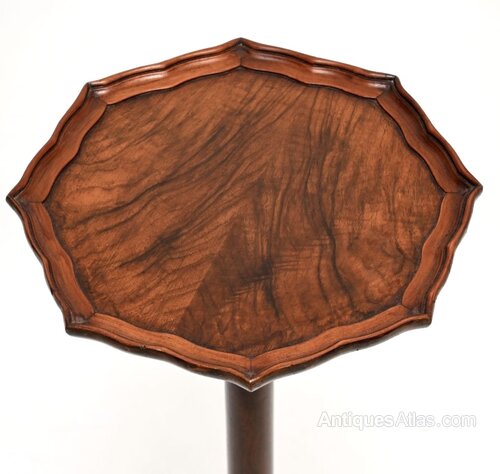 A beautiful antique Georgian style figured walnut side table / stand. This was made in England, it dates from around the 1930’s.It is of lovely quality and is a very useful item, perfect for placing a plant or a decorative object on. It stands on a tripod base, the top has a raised pie crust edge and lovely walnut grain patterns.