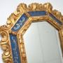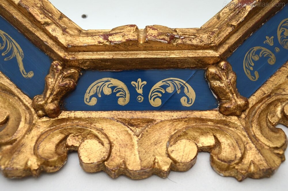 A stunning pair of antique Italian decorative gilt wood mirrors. They are in the classical Rococo style, they were made in Italy in around the 1950’s.The quality is superb, with gorgeous carving all over and decorative blue glass borders.