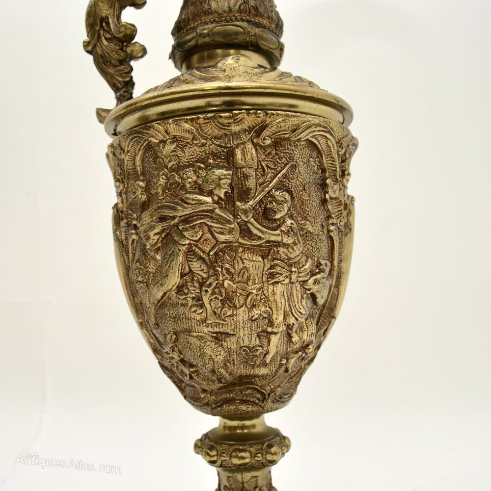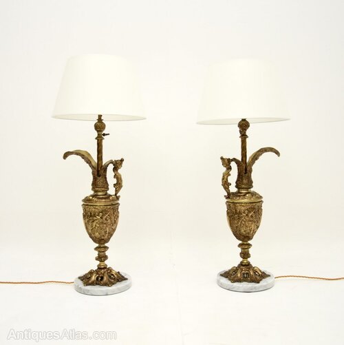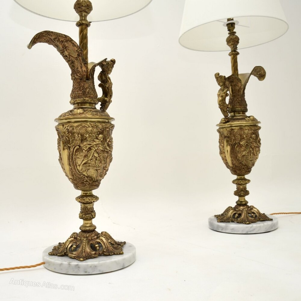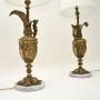 They are in excellent condition for their age, with just some minor wear here and there. The marble bases have been newly made, so they are perfect, the lamps have been re-wired and are in good working order. There have been a couple of small repairs to the handles, which should not actually be used for carrying anyway, but extra care should be taken and they should not be moved by the handles.