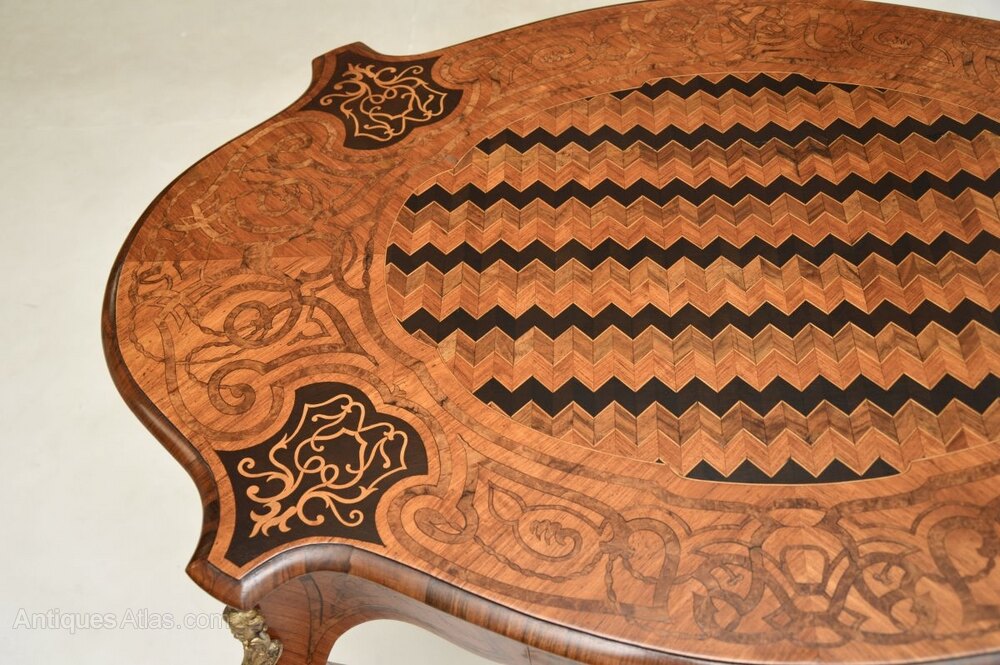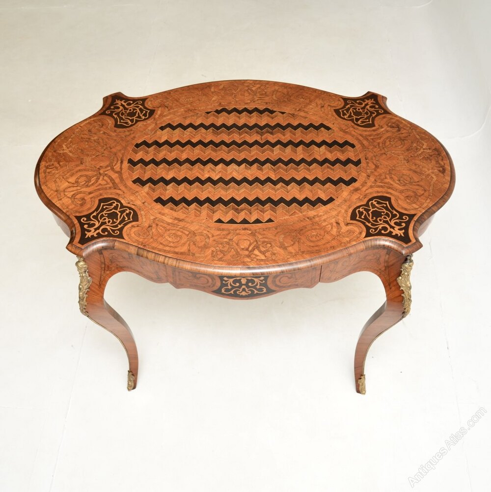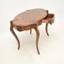 An absolutely exquisite antique French inlaid bureau plat desk. This was made in France, it dates from around the 1880-1890 period.It is one of the finest examples we’ve ever come across, it has an elegant and stylish design with some of the most fantastic inlaid patterns. The top is profusely inlaid with various woods, there is marquetry around the edges and parquetry in the centre. There is further beautiful inlaid marquetry work around the edges, and extremely high quality ormolu mounts. There is a single drawer on the front, the back is also nicely finished and appears identical, only without a drawer.