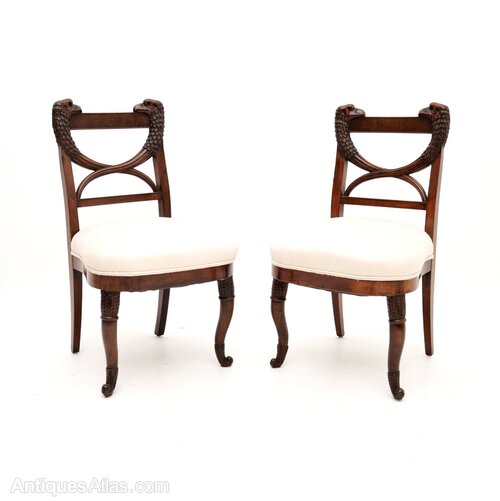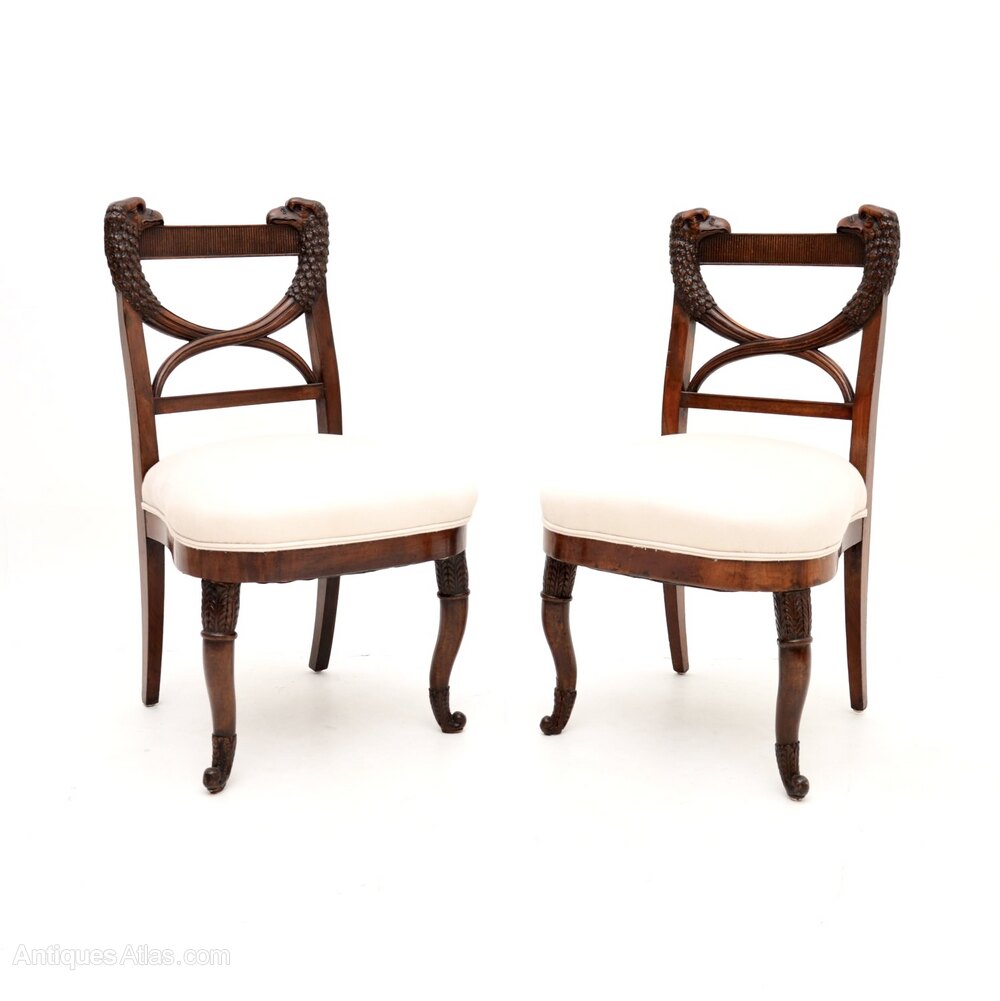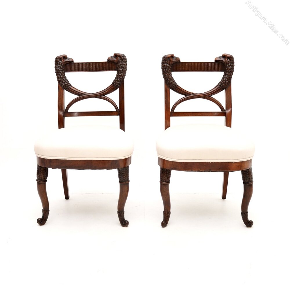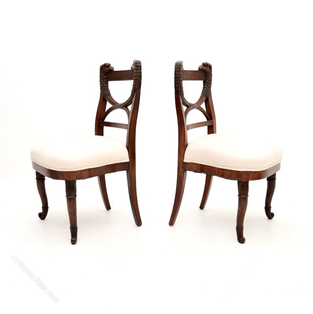 A fantastic pair of antique Biedermeier mahogany side chairs. They were made in continental Europe, possibly Denmark, or somewhere close and they are quite early, dating from around the 1790-1820 period, or even earlier.The quality is outstanding, they have gorgeous and intricate carving depicting eagles heads on the backs, the legs are also beautifully carved.