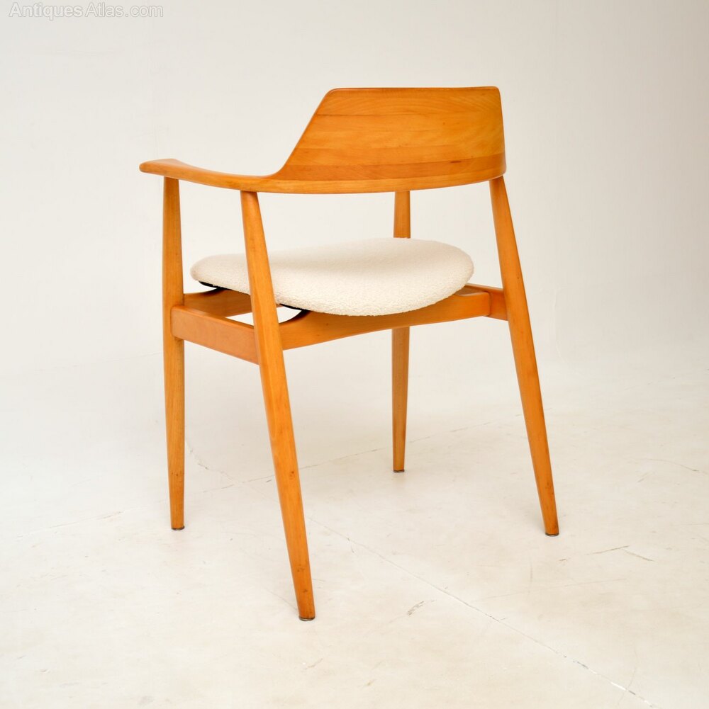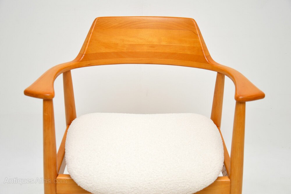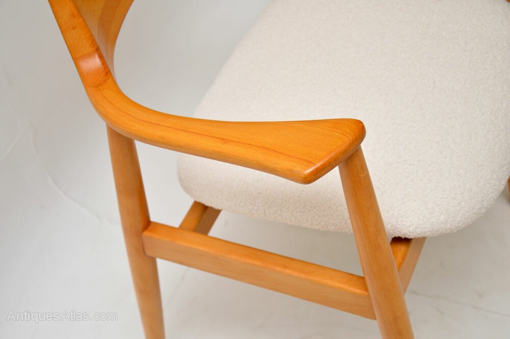 We have had the frame stripped and re-polished to a very high standard, the seat has been newly upholstered in a cream boucle fabric. The condition is superb for their age. There has been a repair to the side rail under the seat, not visible when looking normally at the chair, it is only visible when you look under the frame.