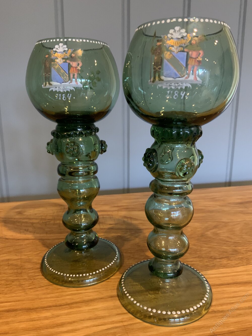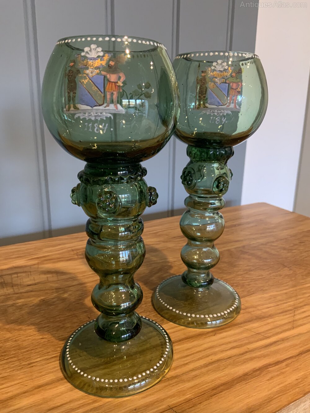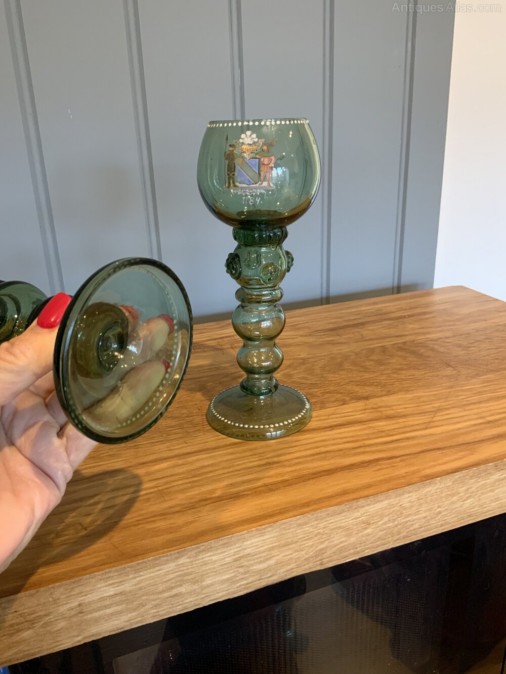Pair of German Armourial Green Glass Roemers/GobletsHeavy thick glass