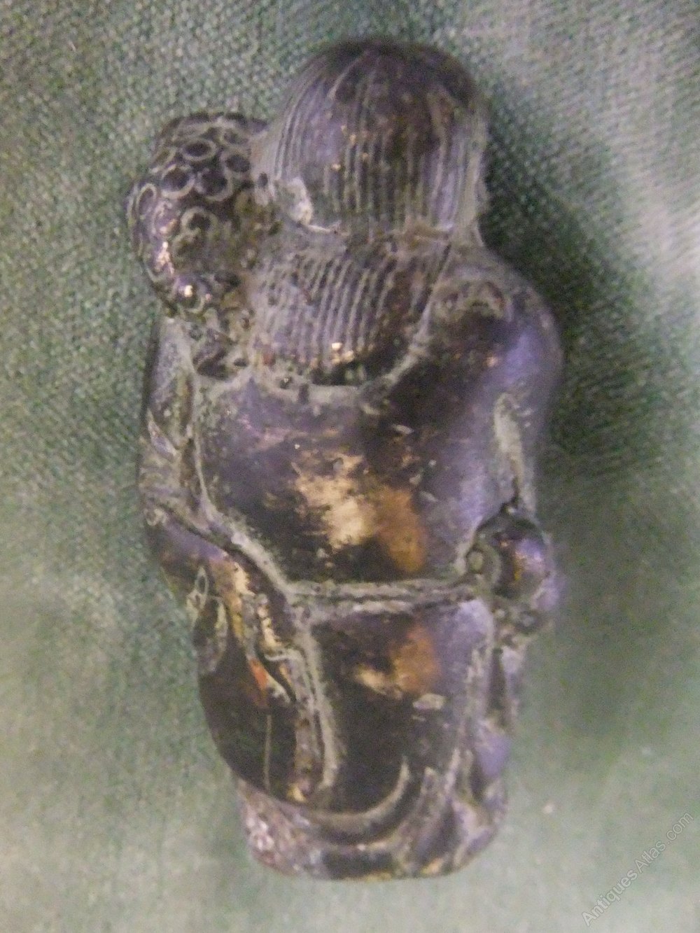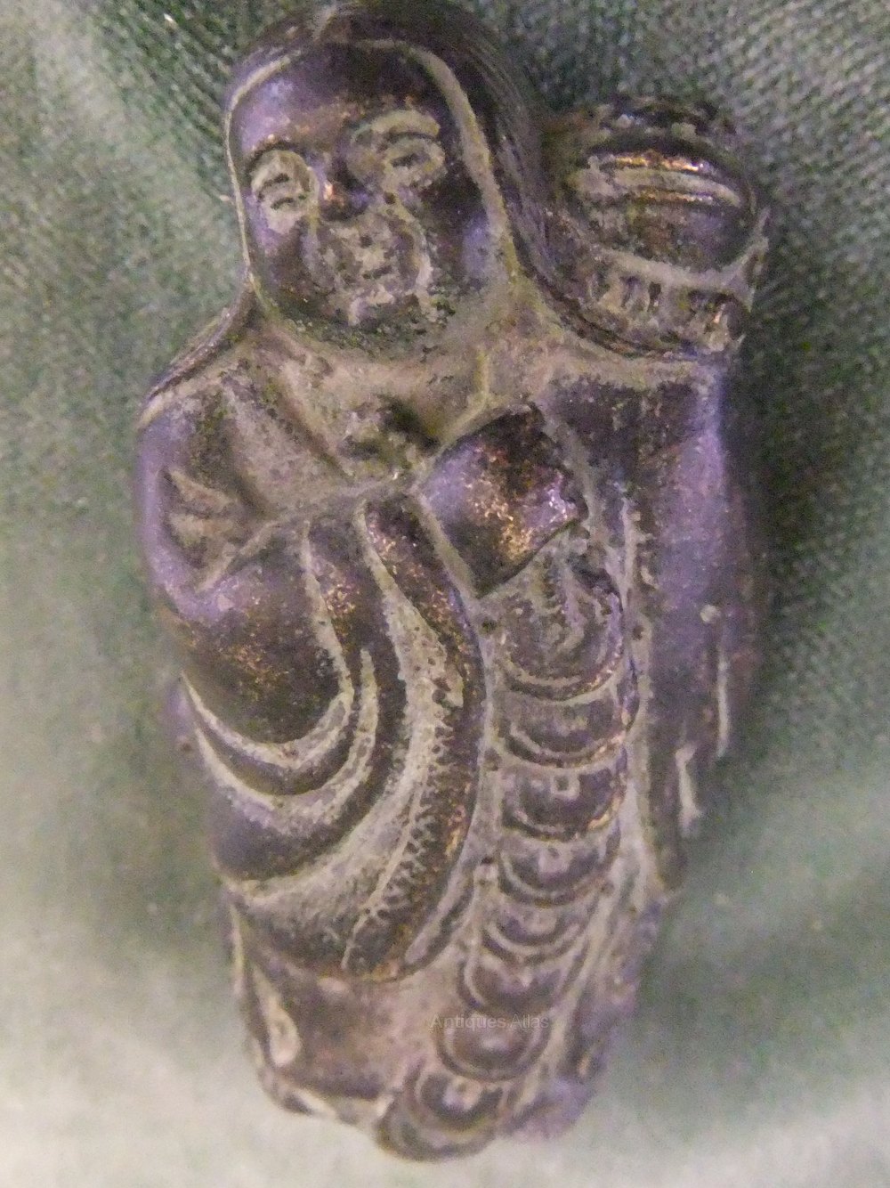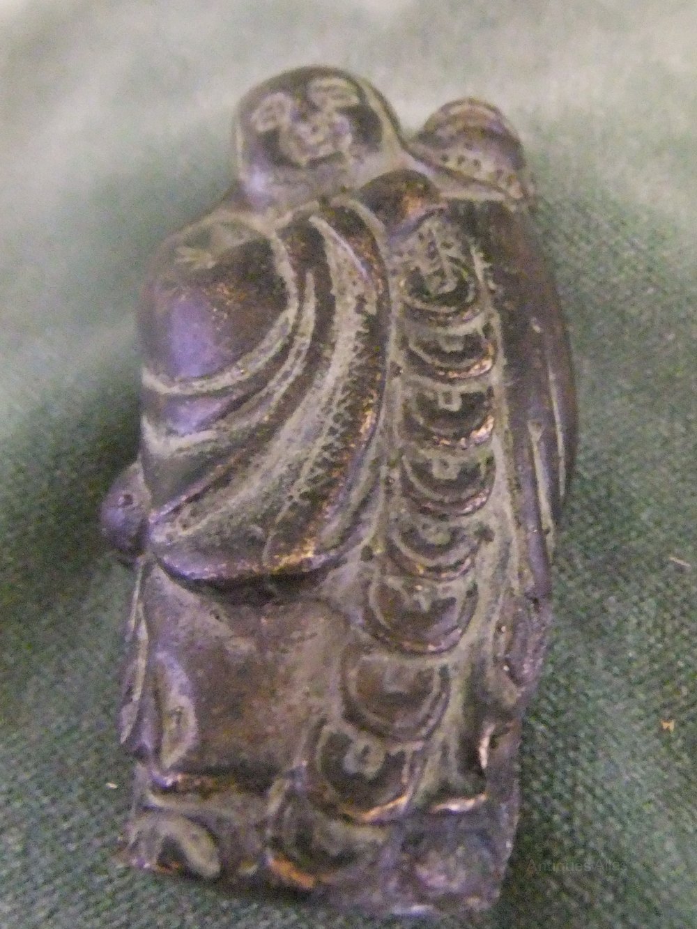 This is a very old bronze figure (c. 17th C.) of Liu Haichan and his 3-legged money toad, probably used as a Feng Shui statue. The odd-looking creature on the man’s shoulder is known as Jin Chan, the Golden Toad, the Money Frog, which is said to bring luck and is a famous Feng Shui charm.This mythical creature is said to appear during the full moon, near houses or businesses that will soon receive good news understood to be wealth-related. According to Feng Shui beliefs, Jin Chan helps attract and protect wealth, and guards against bad luck.Because it symbolizes the flow of money, Feng Shui lore insists that a Jin Chan statue should not be positioned facing the main door ie. “outward”. It also “should never be kept in the bathroom, bedroom, dining room or kitchen”.