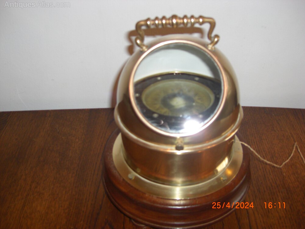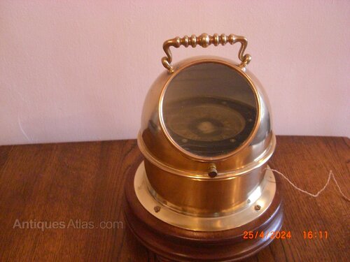 SAURA KEISHKI MARINE COMPASSSAURA KEISHKI SAISHAKUSHO gimballed ship’s compass in binnacle, mounted on a Mahogany base – the first hand-bearing marine compass for the domestic market.