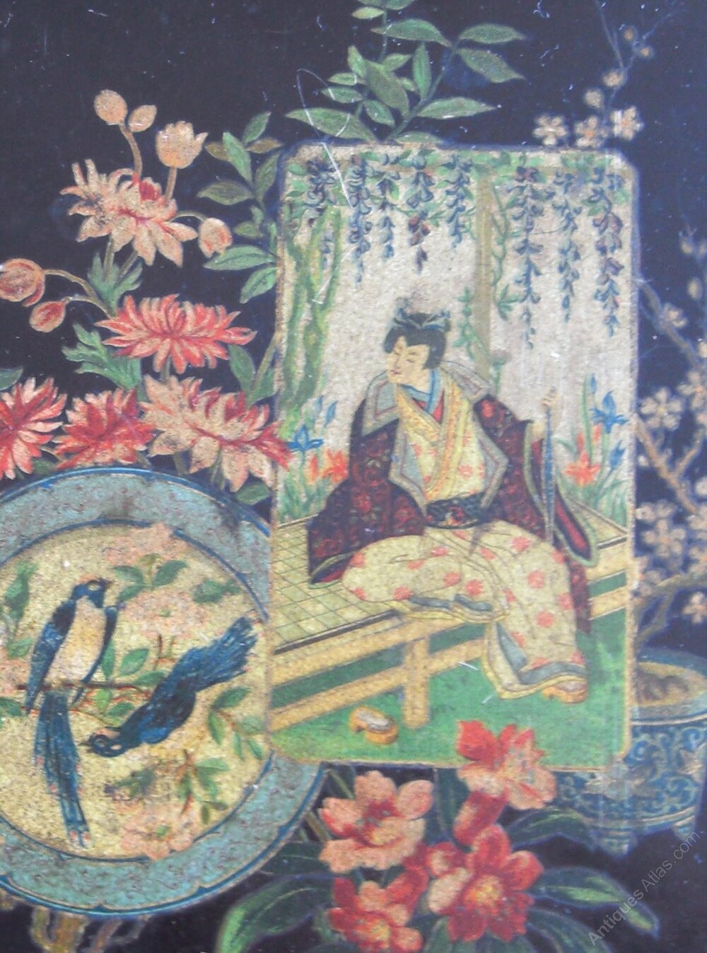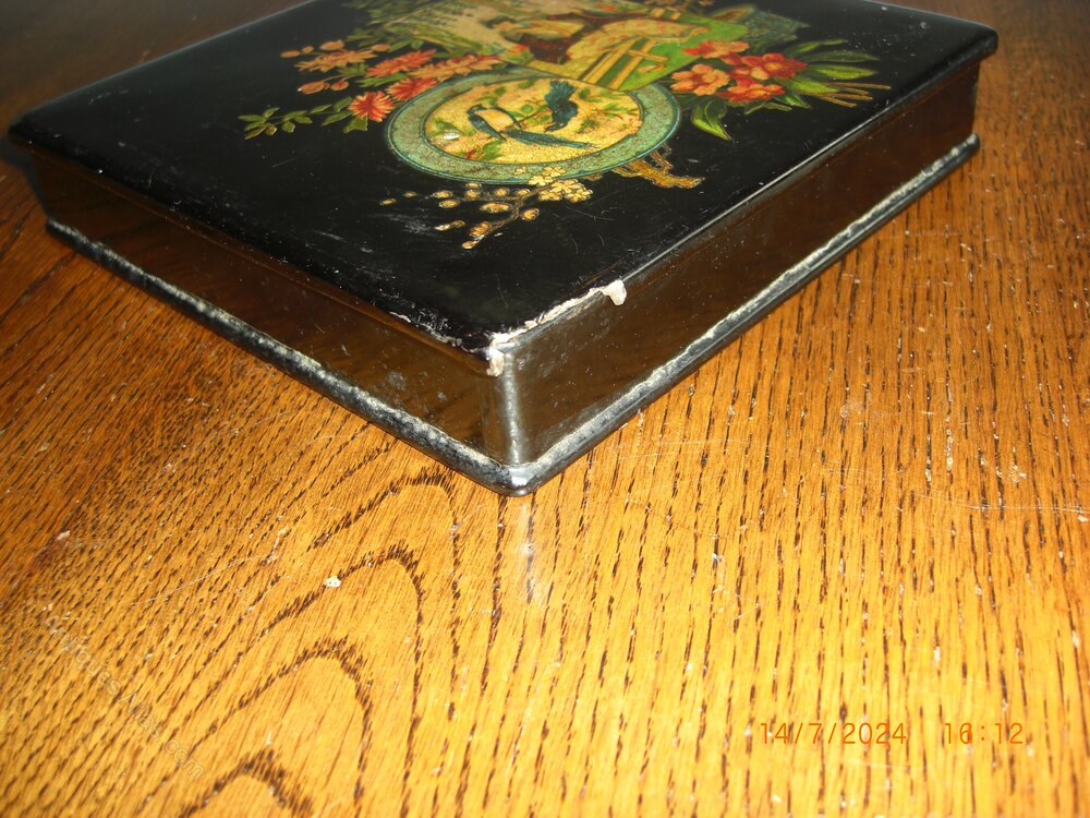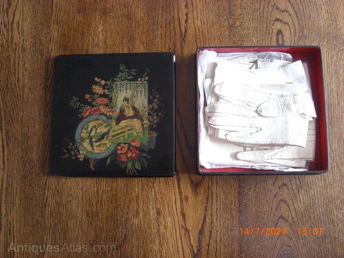 19th C. Ladies Opera Gloves.The gloves come in a papier-mâché box with a hand painted beautifully decorated Japanese motif, measuring 7 ½” x 7 ½”. Slight damage to the lip of the box.