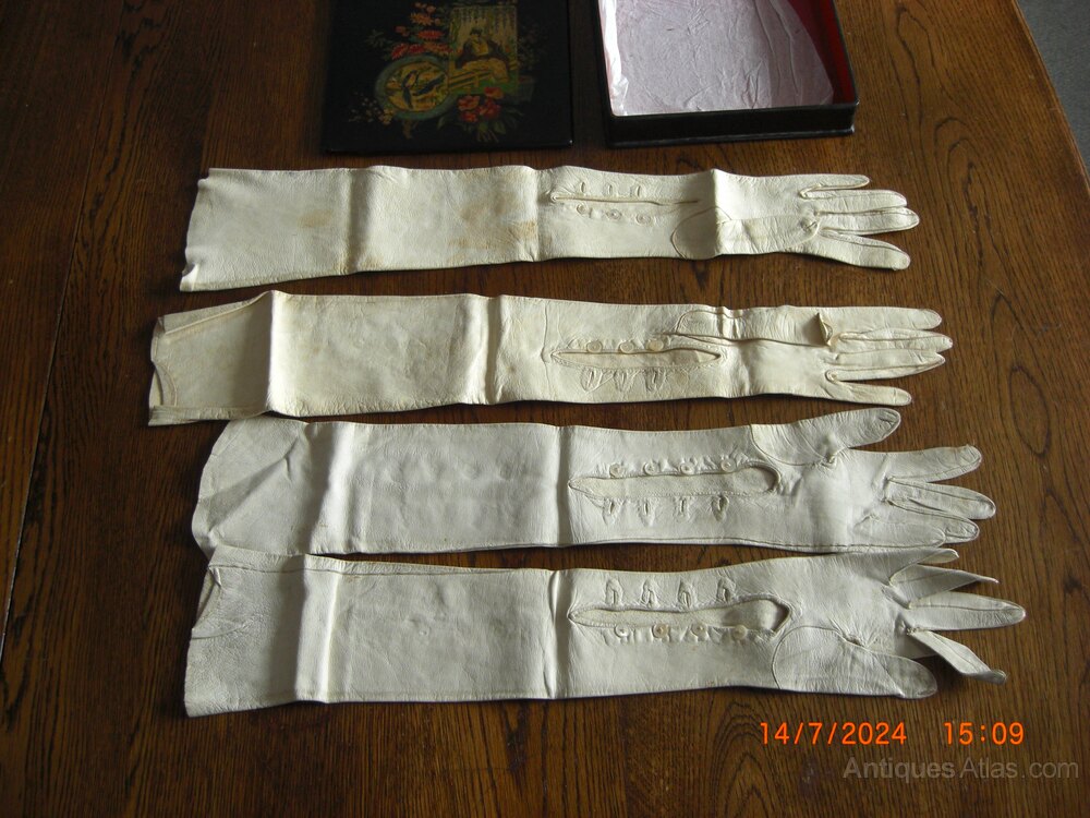 The gloves are for a small hand, 1 pair 20” long, the other 21” long, made from hair sheep leather. There is slight damage and age staining to both pairs, but at well over 100 years old , they are in remarkable condition.
