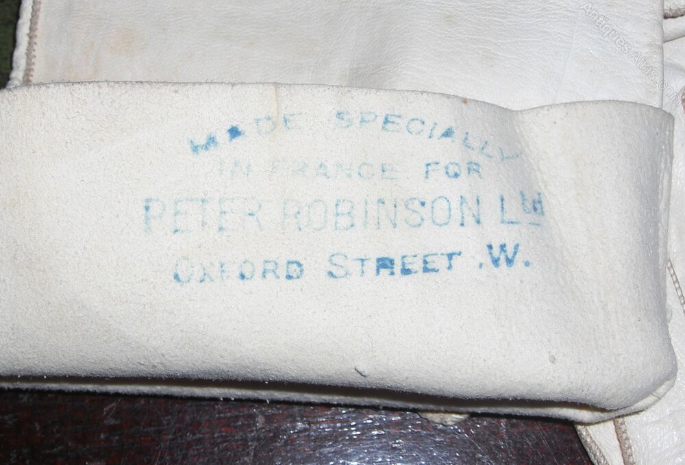 The box contains 2 x pairs of Ladies kid opera gloves, labelled “made specially in France for Peter Robinson Ltd, Oxford Street, W”.