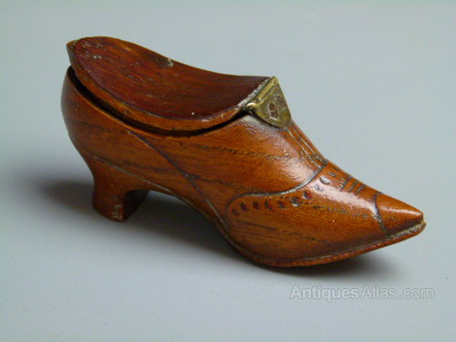 A delightful elm snuff box, in the form of an elegant ladies shoe.Having a brass hinged cover, with pretty carved decoration.