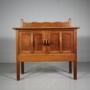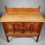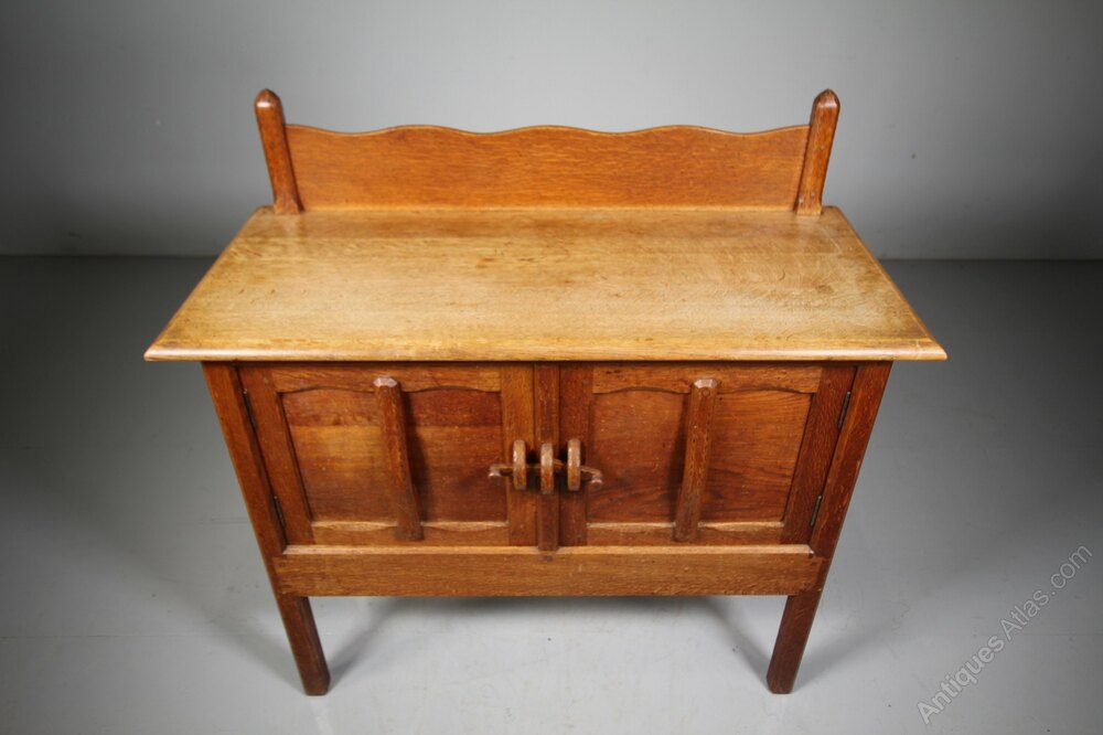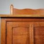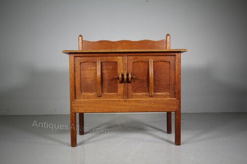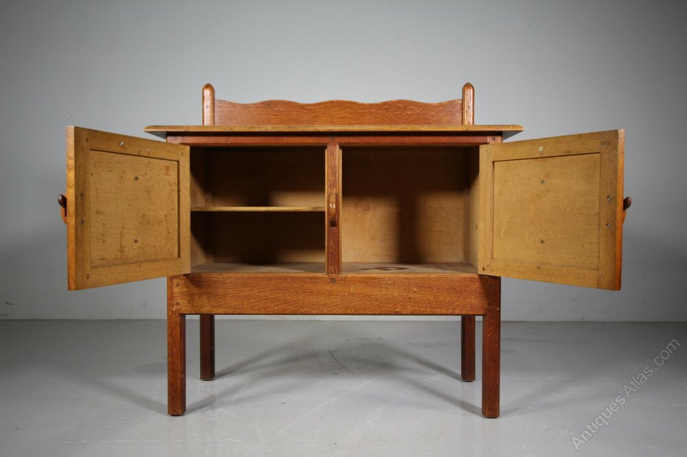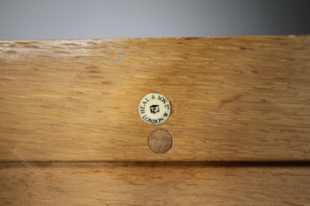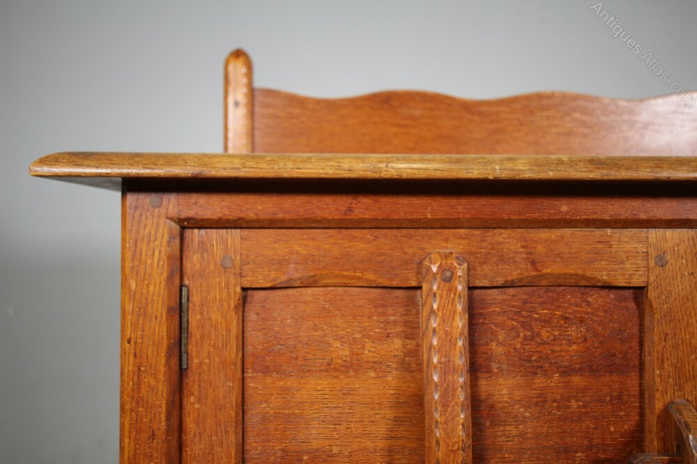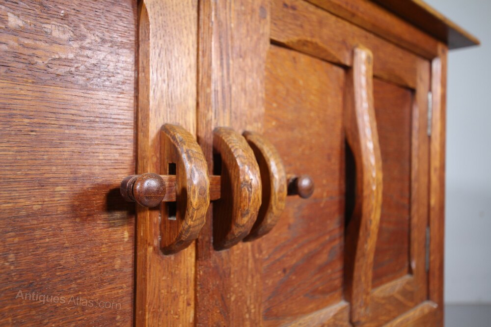 A wonderful, very rare model of a Heals antique oak dresser in the Cotswold manner, beautifully made in solid oak with a light chip carved decoration to the uprights along with the wavy up stand back. In superb condition and all a very good original colour. This rare Heals model dates to 1920 and has the Heals makers label inset into a door. The two panelled dresser doors have an ingenious oak latch and handles. Inside has the original oak single shelf to one side. A top quality, traditionally hand made Heals antique oak dresser by Heals, a very rare model, only ever had one other.