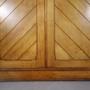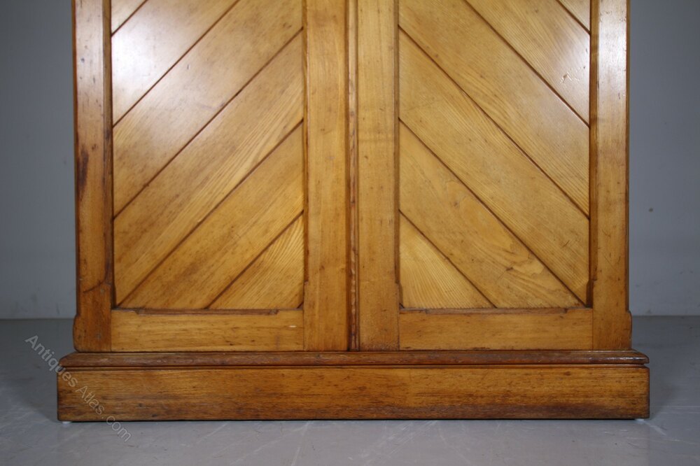 A superb quality English 19th century antique double wardrobe by the well known London makers Howard & Sons. In such good, original colour and all a wonderful original colour, this antique wardrobe is made in solid ash woods with the two moulded wardrobe doors having a decorative herringbone patterns. Inside are the original hanging rails and brass hooks. To the lower part of this Howard & Sons antique wardrobe is a single, long drawer that run well and has the original brass swan neck handles. This antique wardrobe is stamped by the maker Howard & Sons and there is also a lovely original paper makers label. For transporting, the cornice lifts off, as does the plinth. English and dating to 1860.