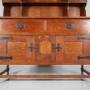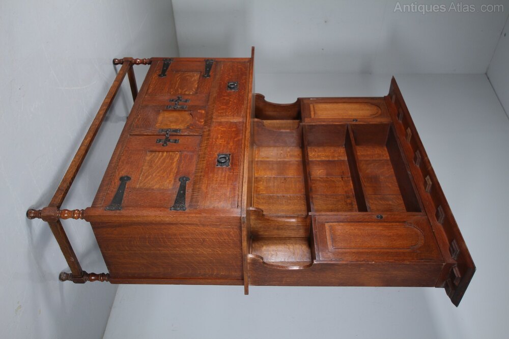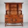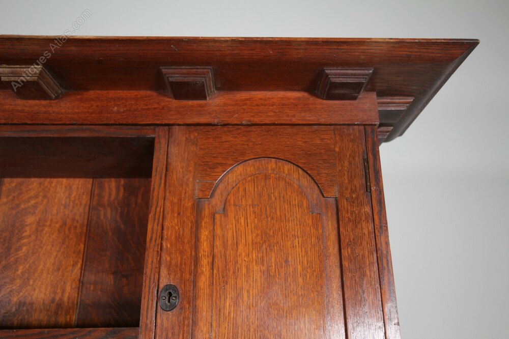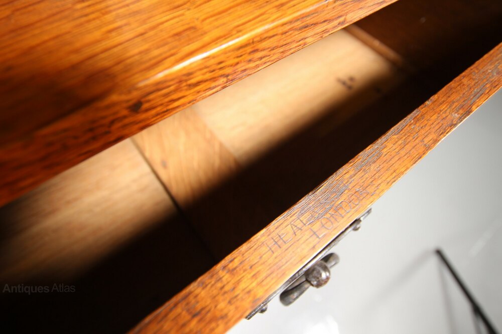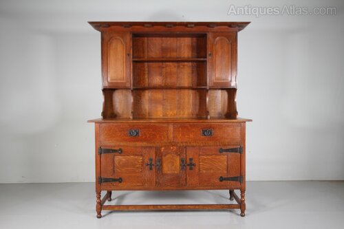 Dating from around 1890, this is an early piece of Heals solid antique oak furniture, a large scale dresser that splits into three sections, the architectural lift off cornice, the open rack with panelled door cupboards to each side, and then the dresser base that stands on a stretchered base with turned legs and having two drawers over two cupboards. In superb condition throughout, stamped twice with the makers label and by the maker into a drawer. Complete with all the original iron work and all a very good original colour. Only a handful of these dressers where ever made, this is one of Ambrose Heals earliest designs.