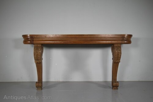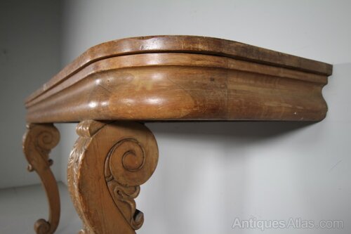 A well proportions large William IV country house antique console table that dates to 1830. Lovely original condition, featuring a moulded frieze below the table top on a pair of shapely, corbel style table legs. Designed with no back legs so would fit neatly over skirtings and radiators. A wonderful, pale and even colour. Comes with interesting provenance.