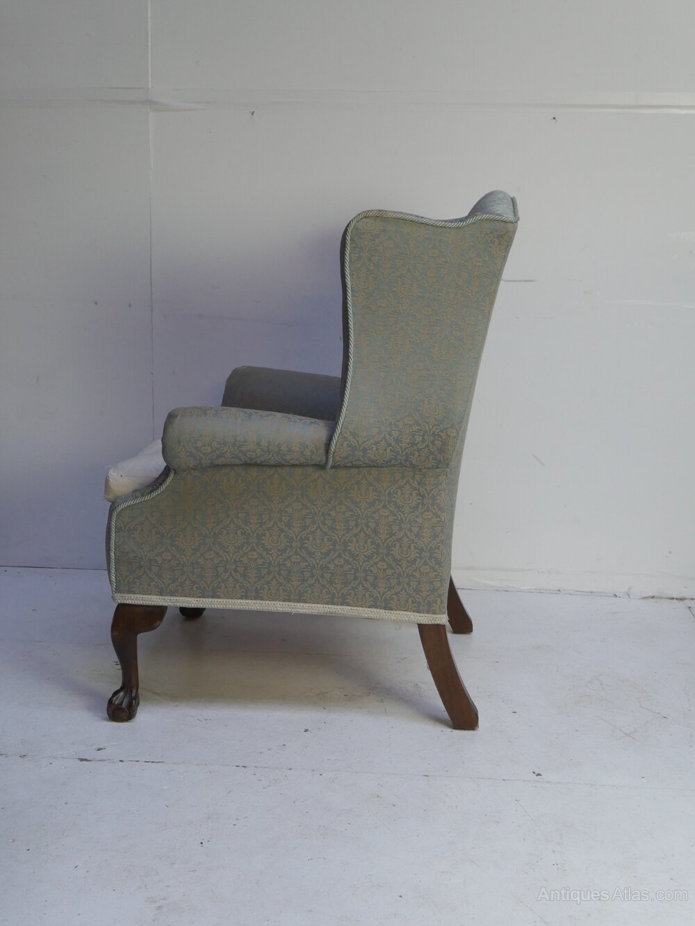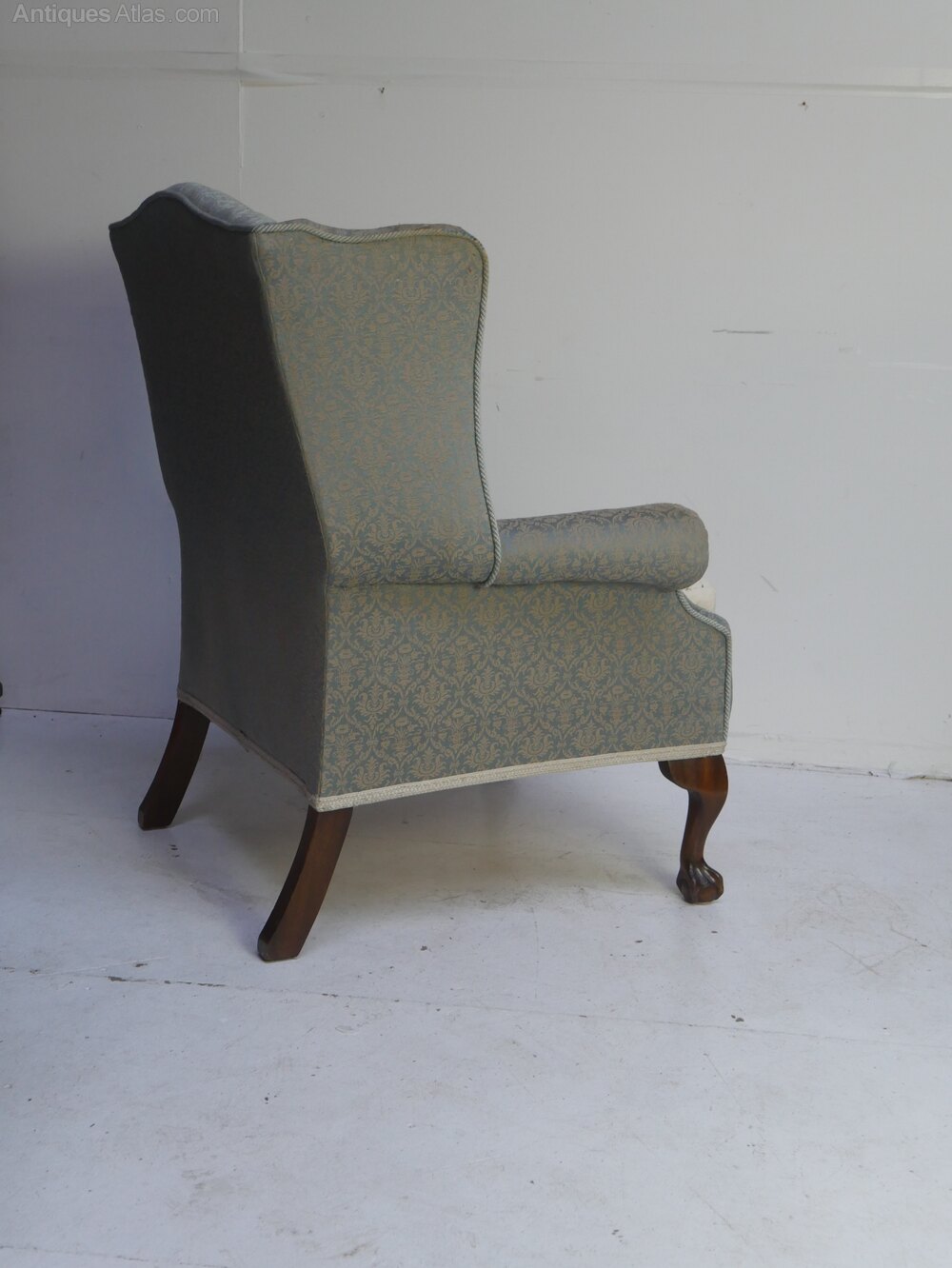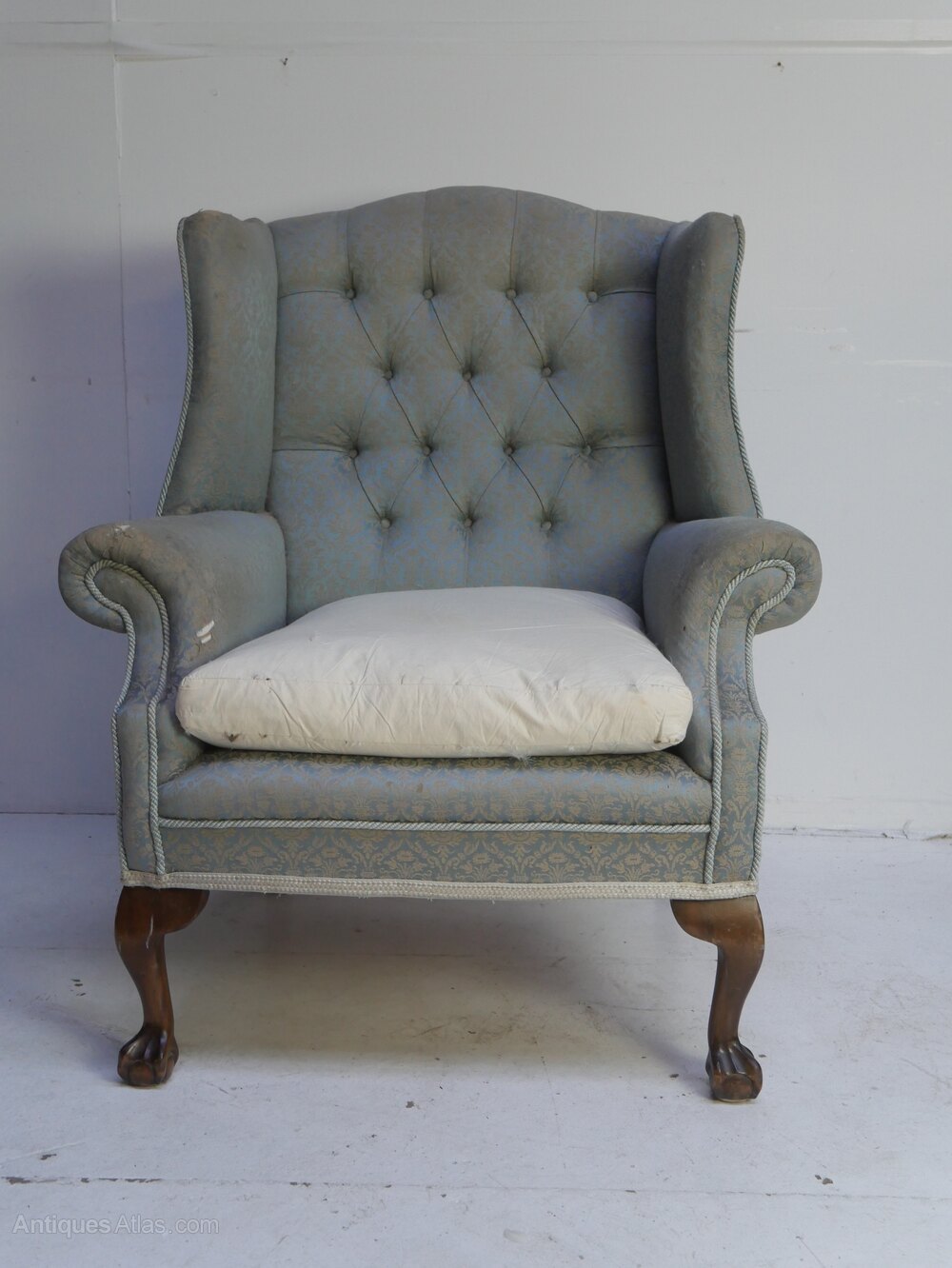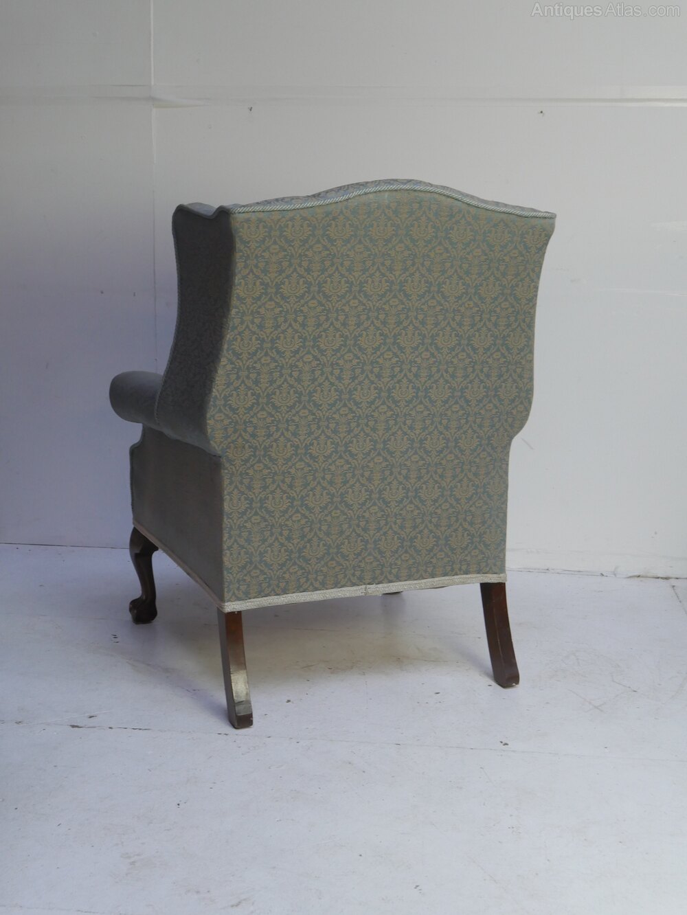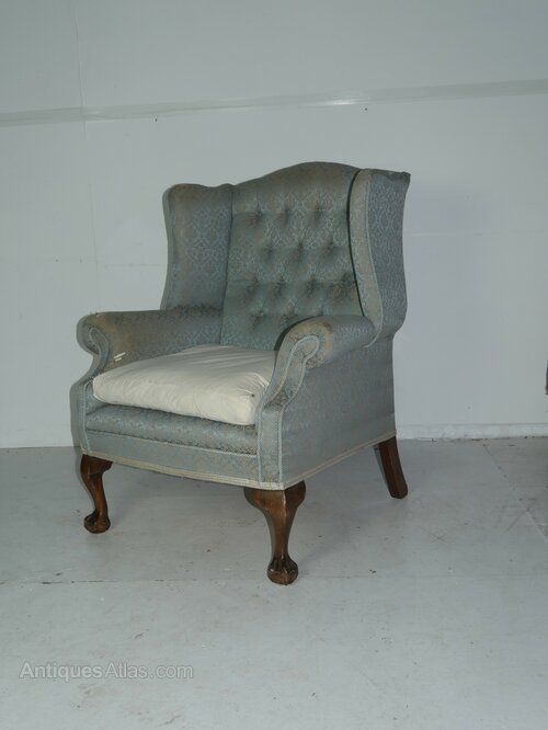 A good quality wing armchair for upholstery, with walnut claw and ball front legs and a nice kick to the back legs. A comfortable sitting chair, in strong condition, loose feather cushion, made around 1910-1920 with a seating height of 52cm with cushion.UK mainland delivery available.