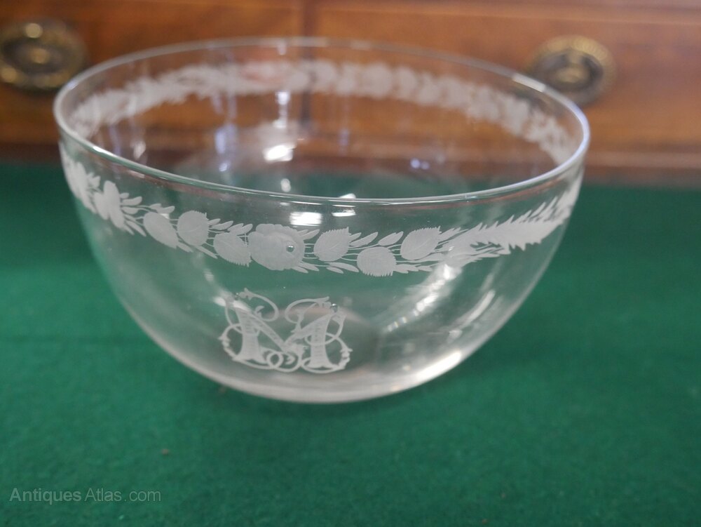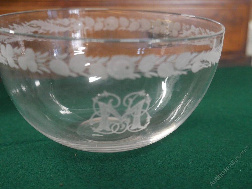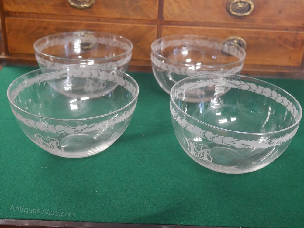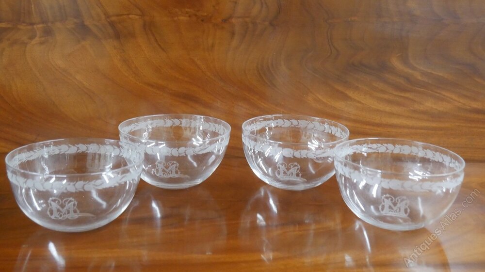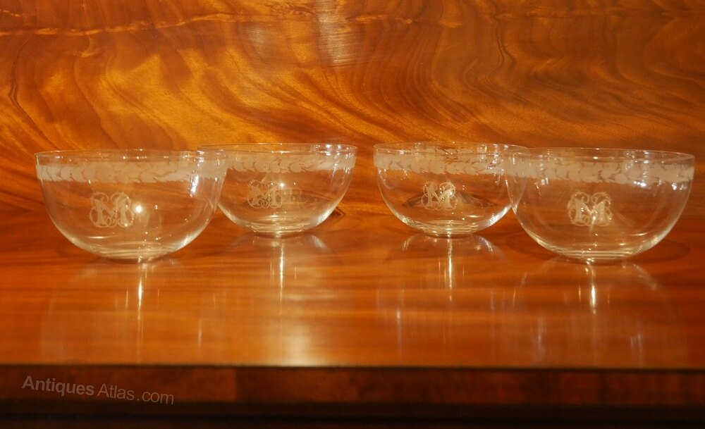 A very good quality set of four fine glass finger bowls, beautifully engraved with the initial M, finely decorated engraving circled above. The top diameter is 13cm, all in excellent condition.Currently free UK delivery available.
