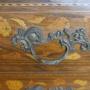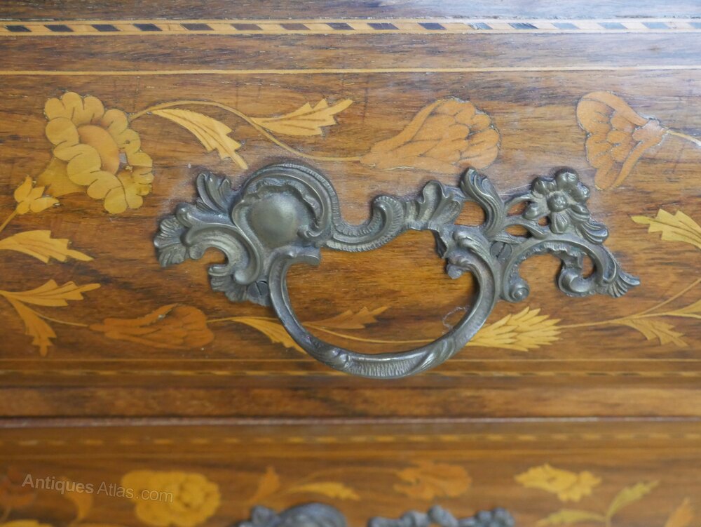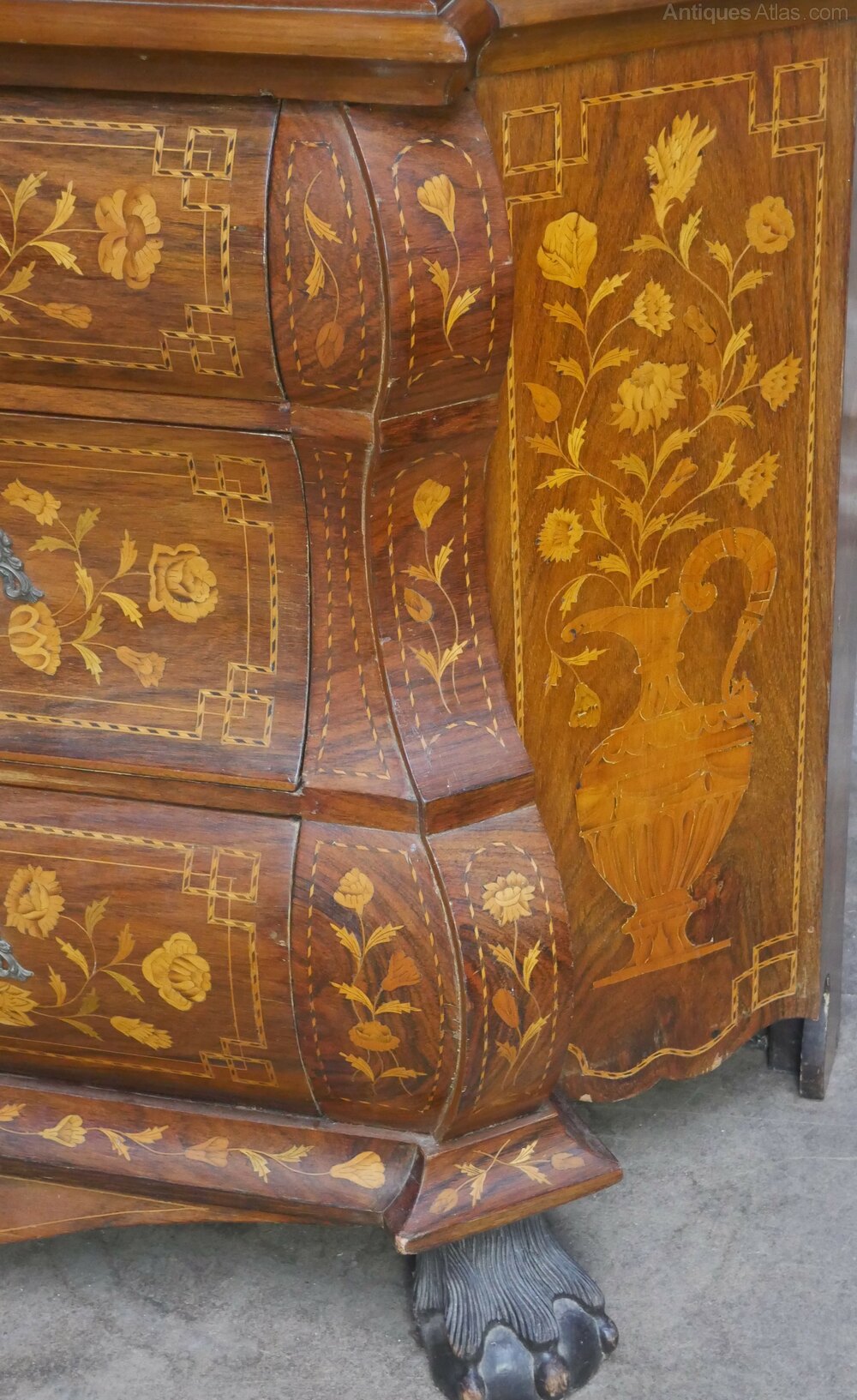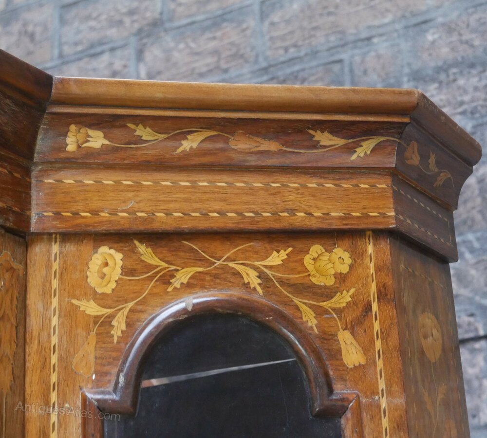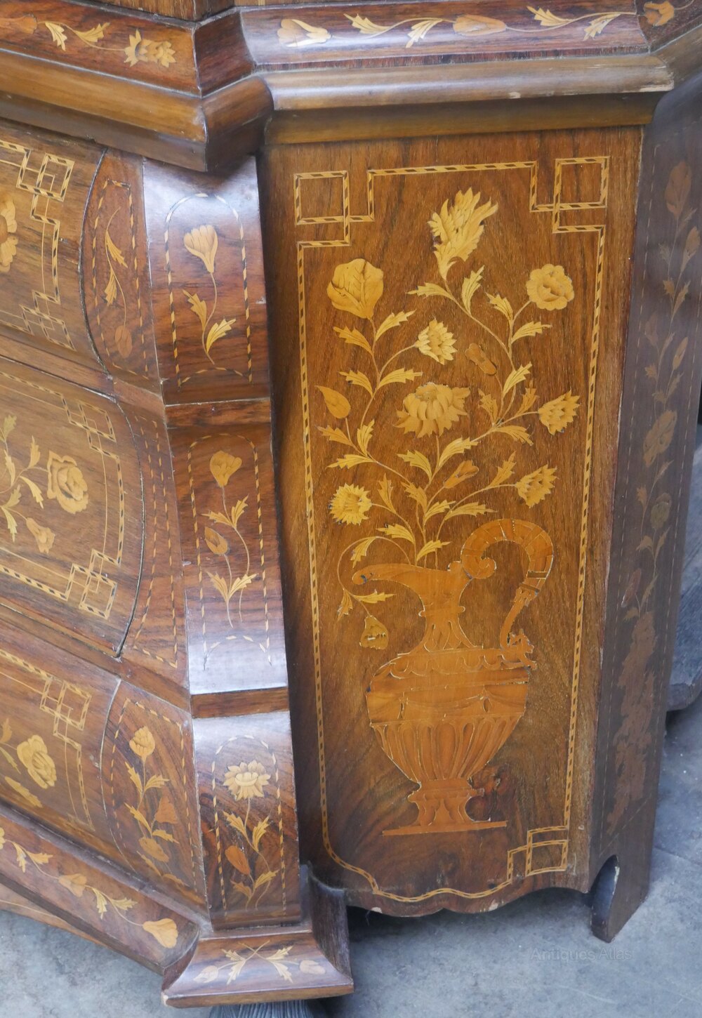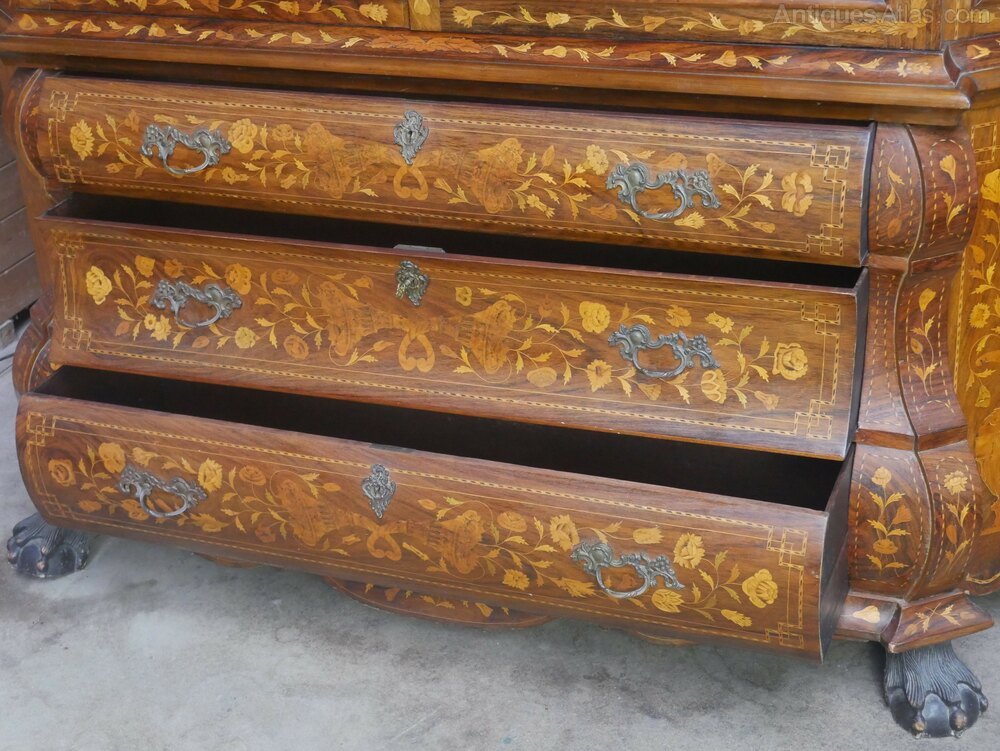 A good 19th century Dutch marquetry display cabinet with three shelves to the top, a well shaped pair of glazed doors with further marquetry side panels. The base has three graduated drawers profusely inlaid with marquetry decoration to the front and the sides. The cupboard splits into multiple parts and the base is one piece, a excellent example constructed in very good quality walnut, made around 1850, all ready to enjoy.UK Mainland delivery quote available.