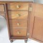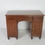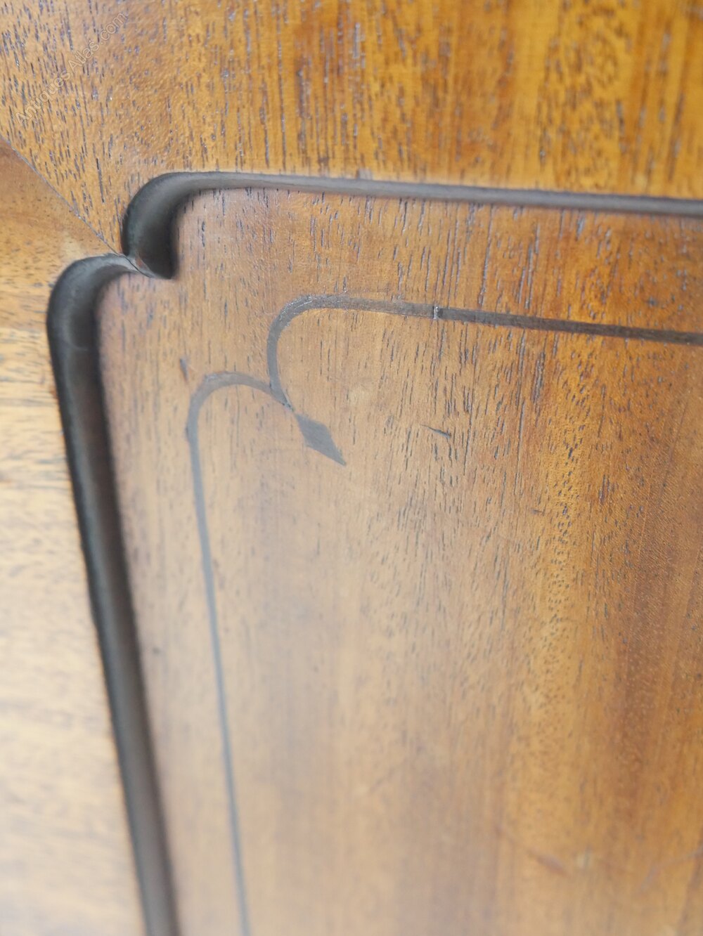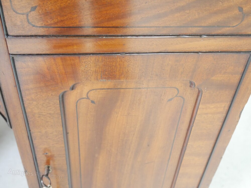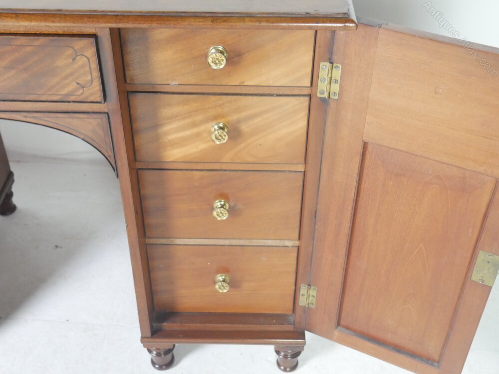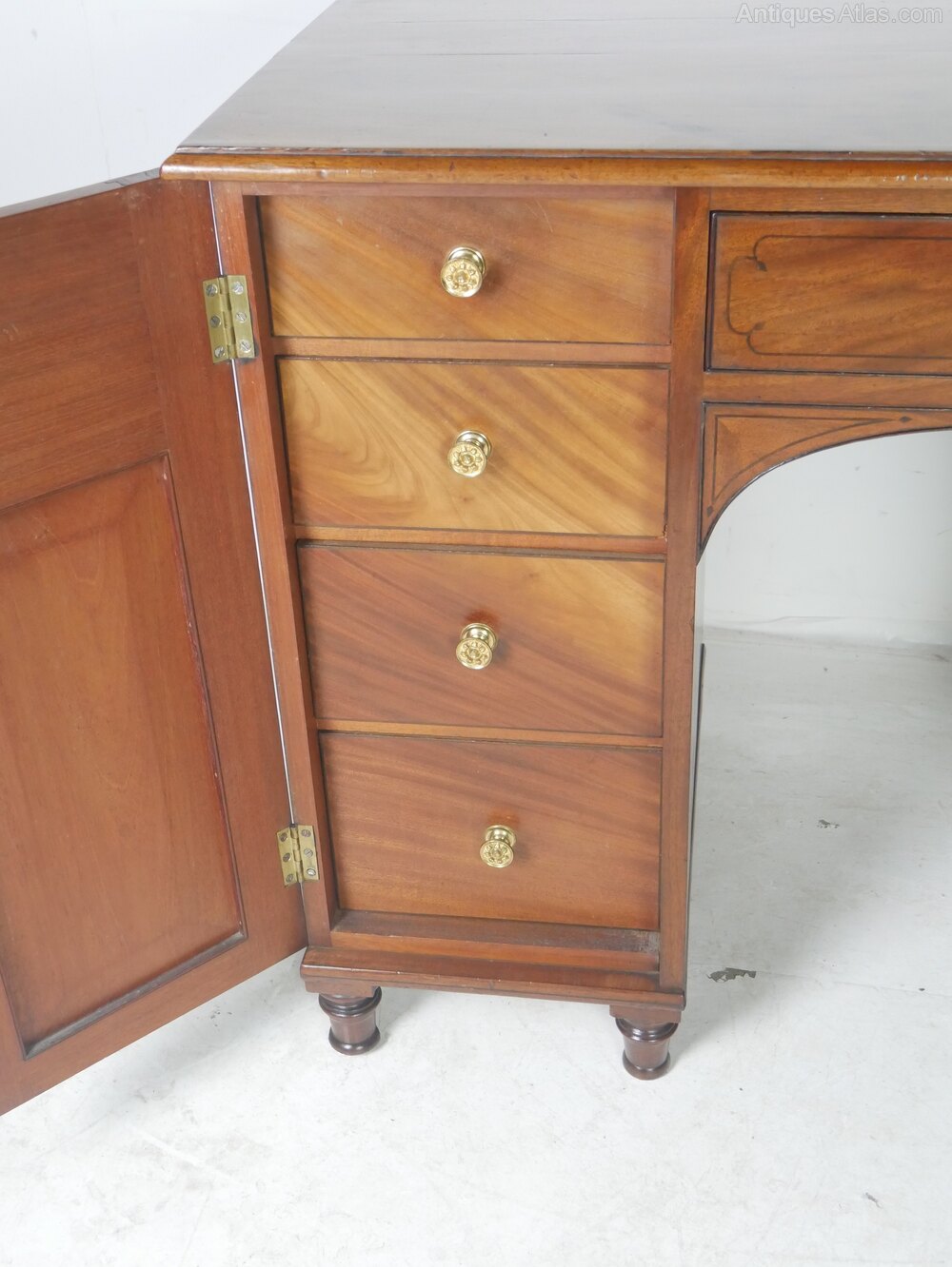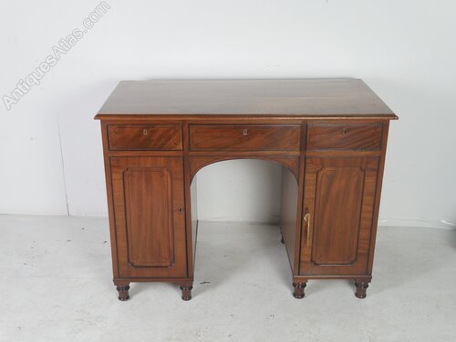 A fine Regency period mahogany cabinet, suitable as a desk, dressing table or side cabinet. Excellent mahogany timbers, beautifully crafted with ebony inlaid decoration. the cupboards opening to four graduated drawers to either side, a middle drawer with sliding felted cover which is adjustable, a single drawees to either side.Kneehole height 60.5cm all in excellent ready to use condition, with lovely running drawers, made around 1815-1820.