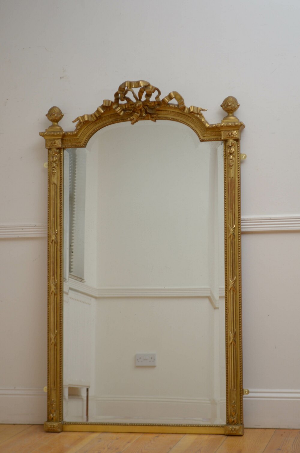 Sn5542 Very elegant turn of the century gilded wall mirror or console table mirror, having original bevelled edge glass with some foxing in arched and beaded with bow crest to the centre flanked by acorn finials, reeded half columns and decorative floral motifs to the base. This antique mirror retains its original glass, original gilt and original backboards, all in home ready condition. c1900H60.5" W36.5" D7"