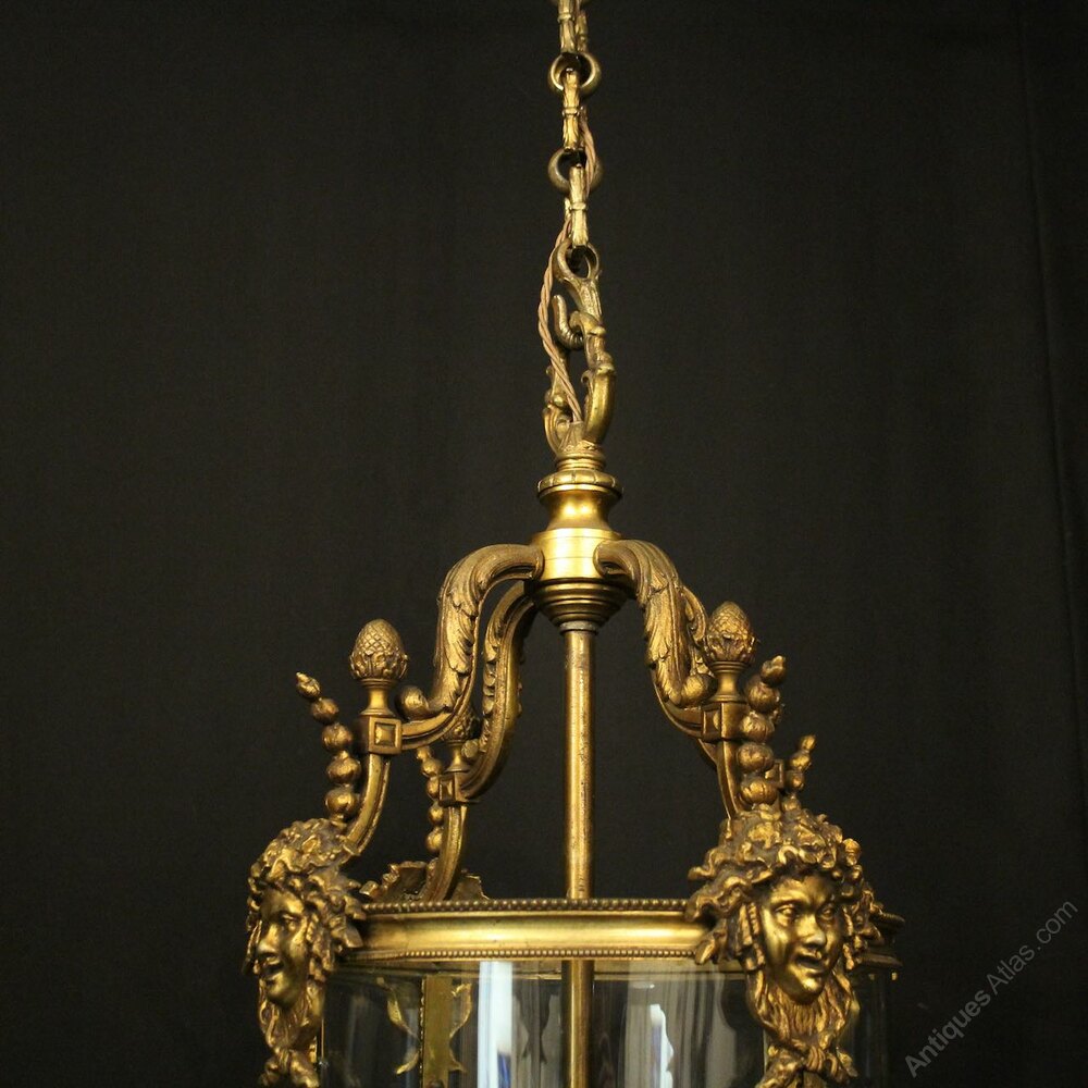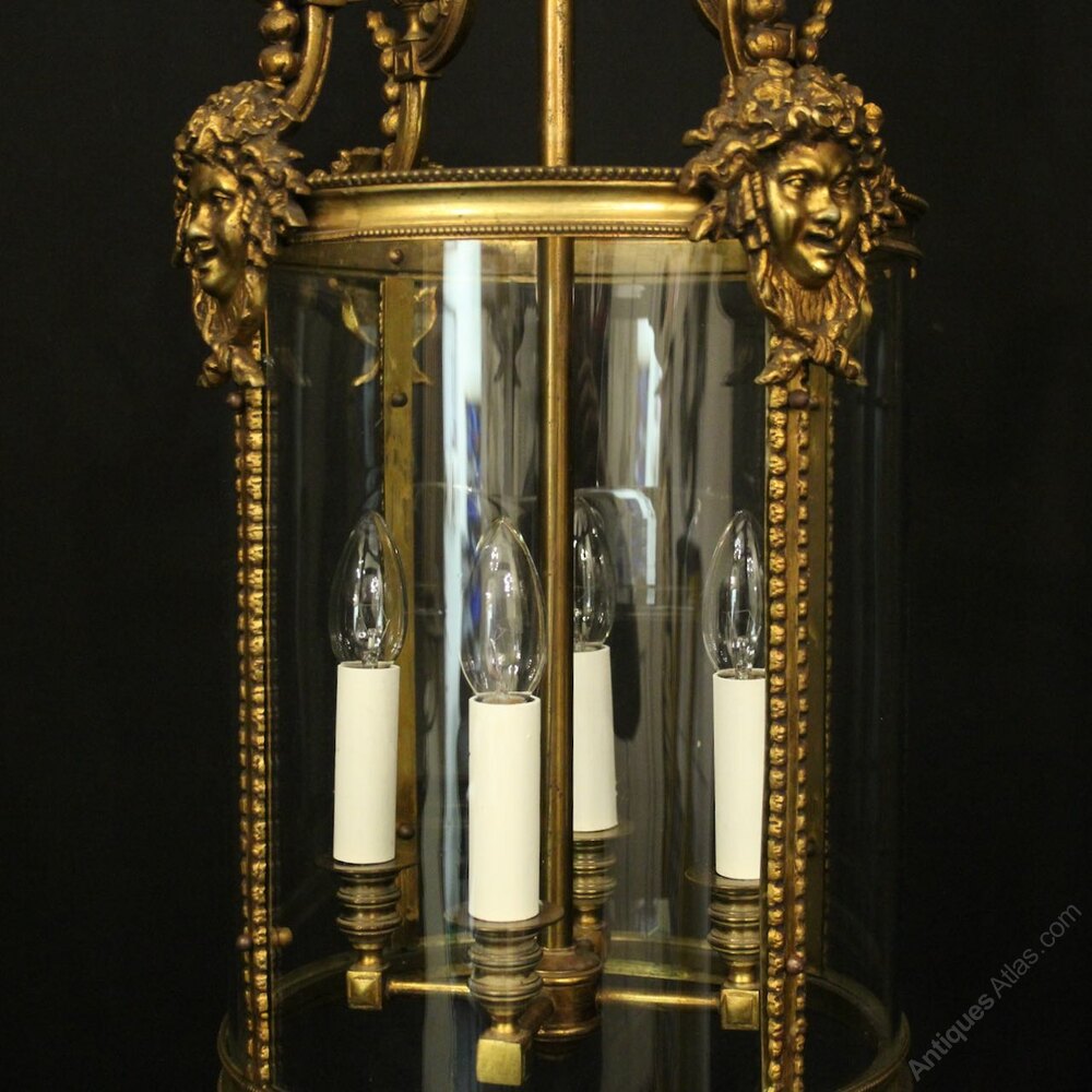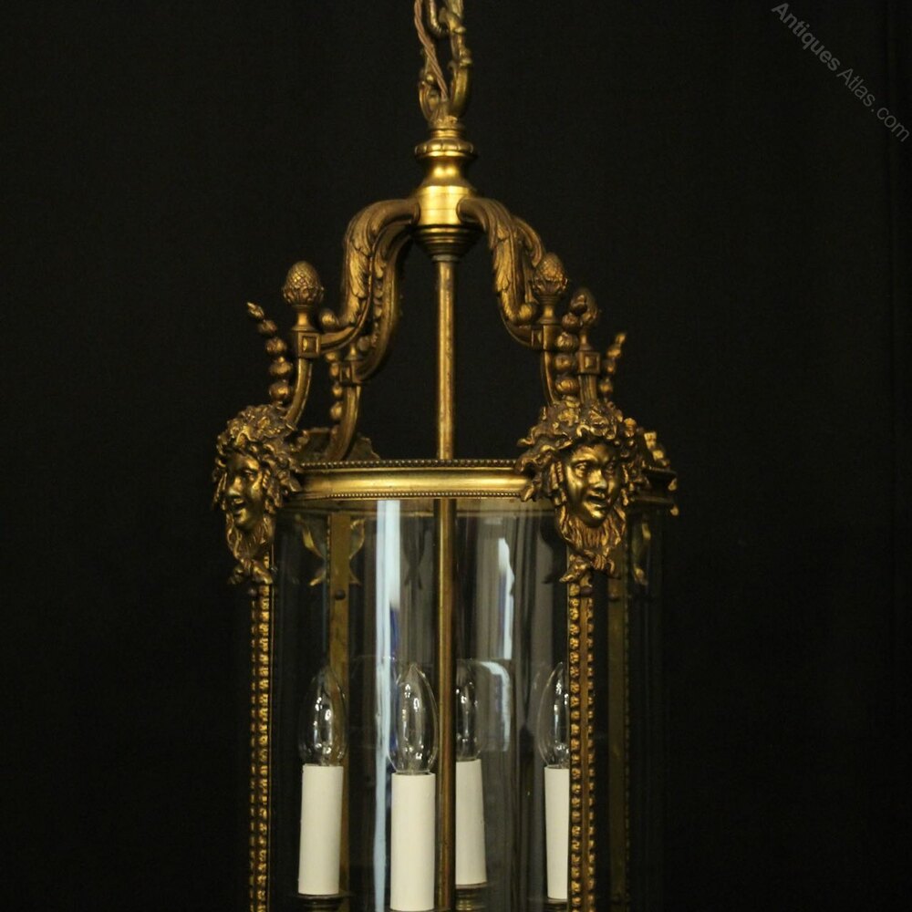 A French late 19th Century gilded bronze four light antique hall lantern, the four bobbin bulbous candle sconces, surrounded by a four sectional circular convex glass panels and held within a decorative scrolling framework with Dionysus mask heads, grained side panels, acorn finials with open scrolling canopy, having the original chain and ceiling rose, very well cast and excellent original patination. Provenance: From the Italian Consulate in Charleroi Belgium. Fully rewired and PAT tested. All our lanterns come with bulbs and ceiling fixings.Dimensions: H: 27"/69cm W: 13"/33cm Excluding Chain & Rose