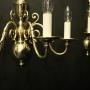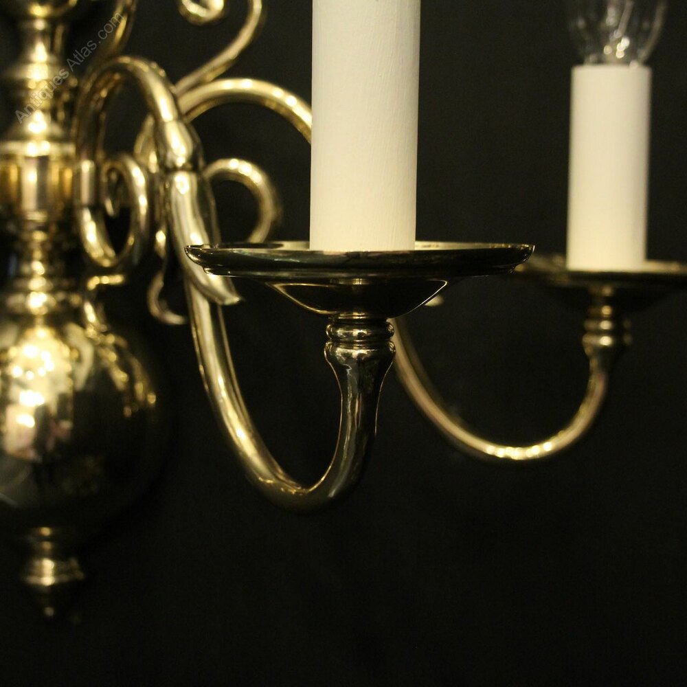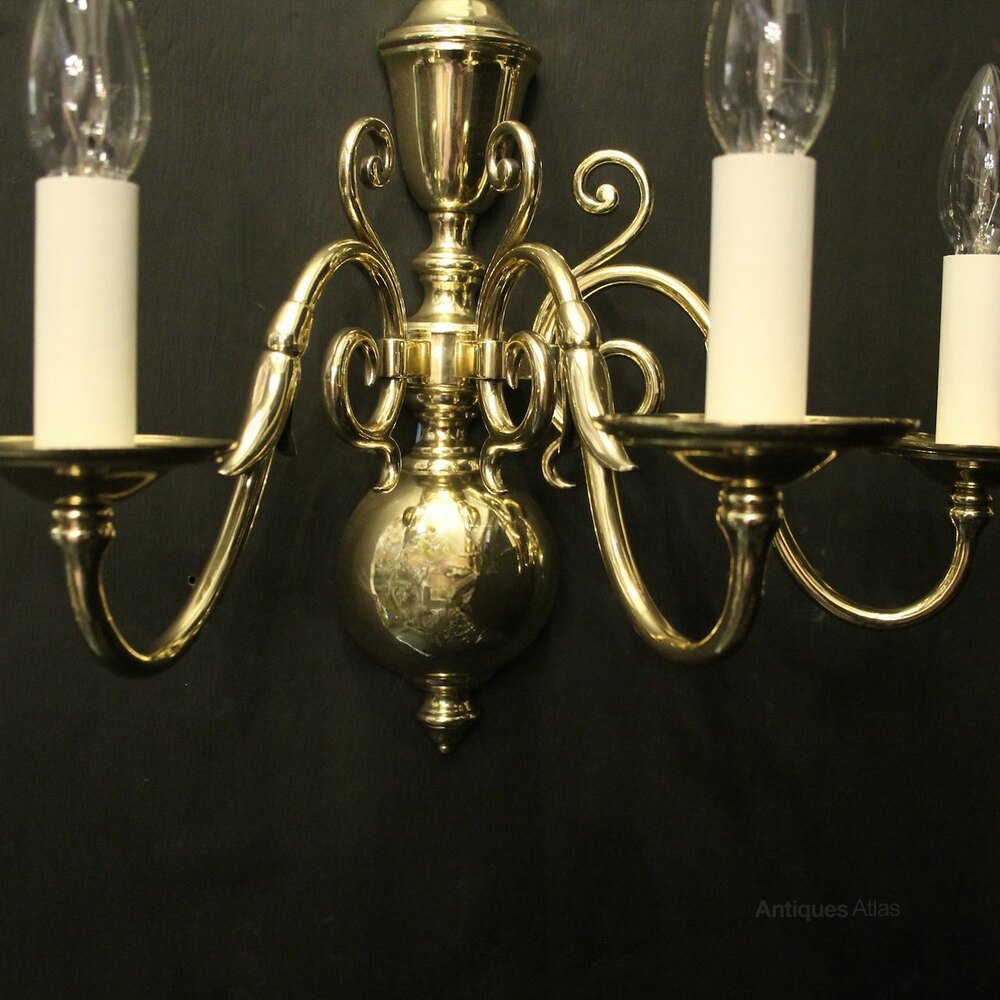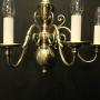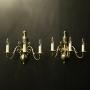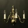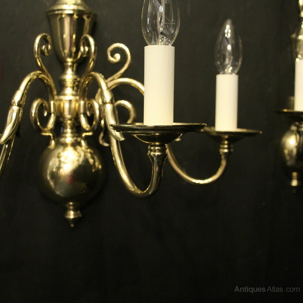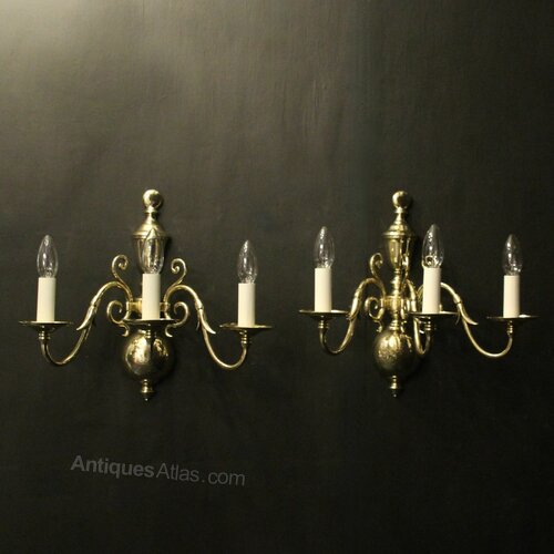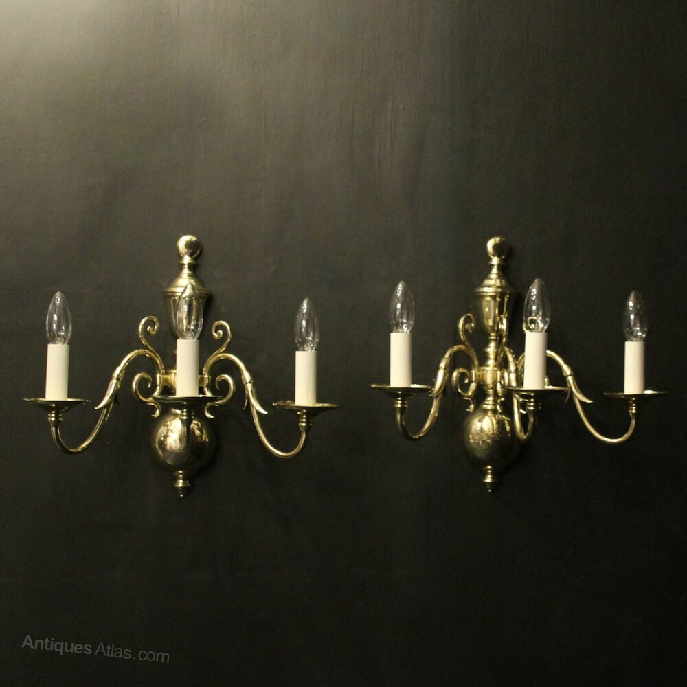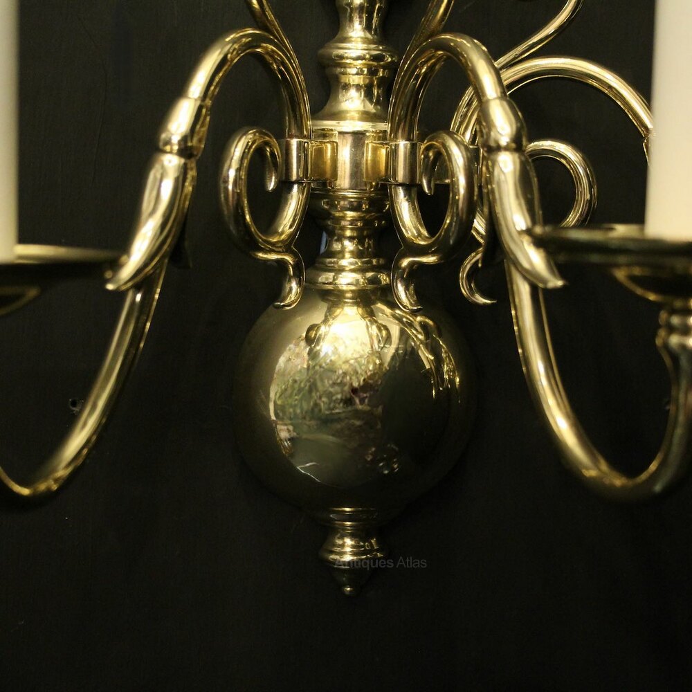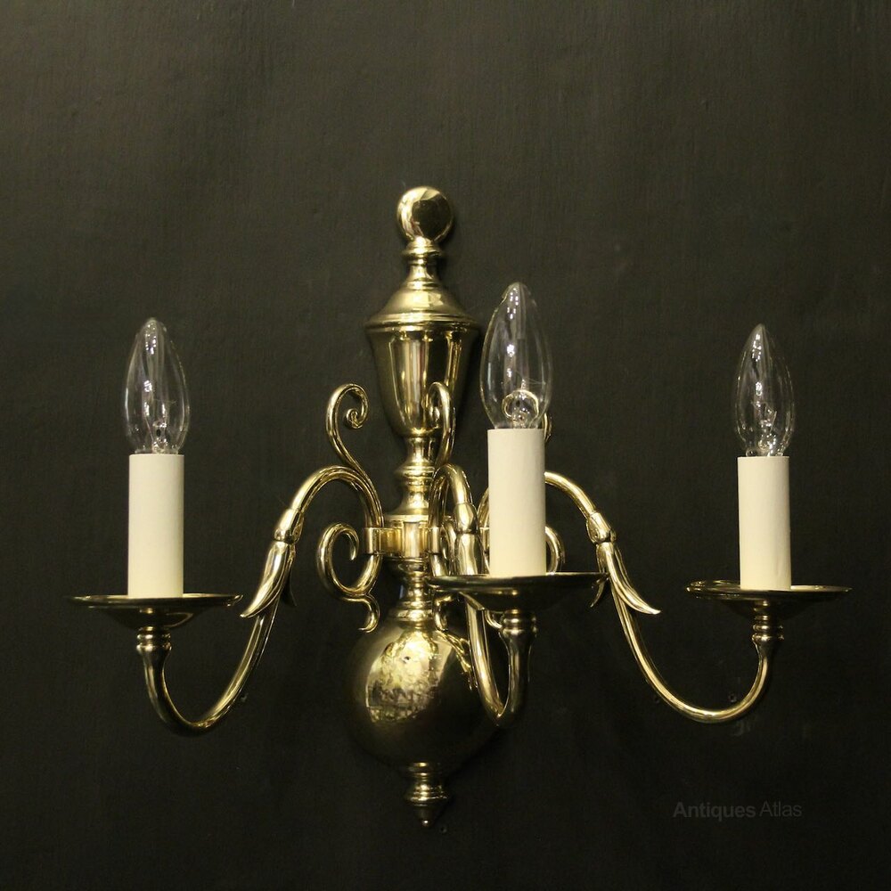 An English pair of repolished brass triple arm antique wall lights, the scrolling arms with circular bobeche drip pans, issuing from a elongated knopped backplate, sympathetically repolished and lacquered. Fully rewired and PAT tested. All our wall lights come with aged brass screws for fixing and spare bulbs.Dimensions: H: 15"/38cm W: 16"/41cm D: 11"/28cm