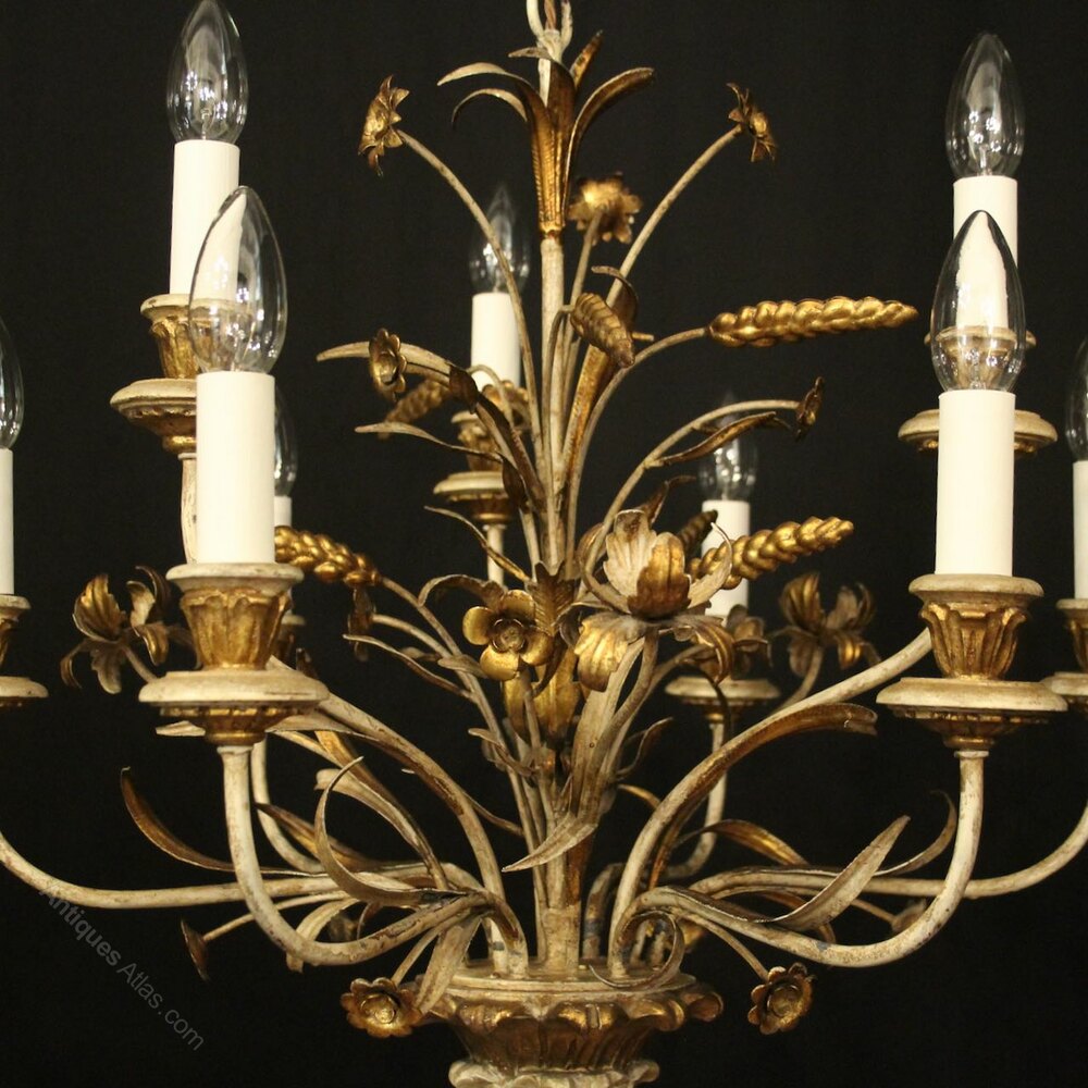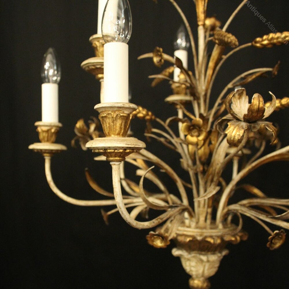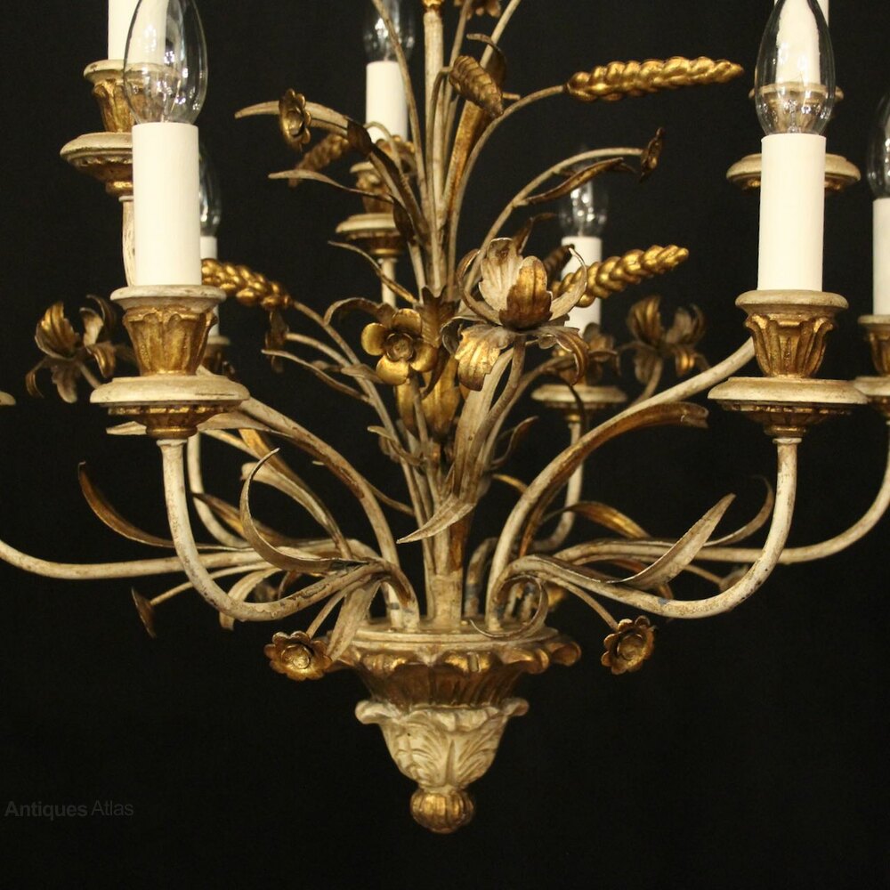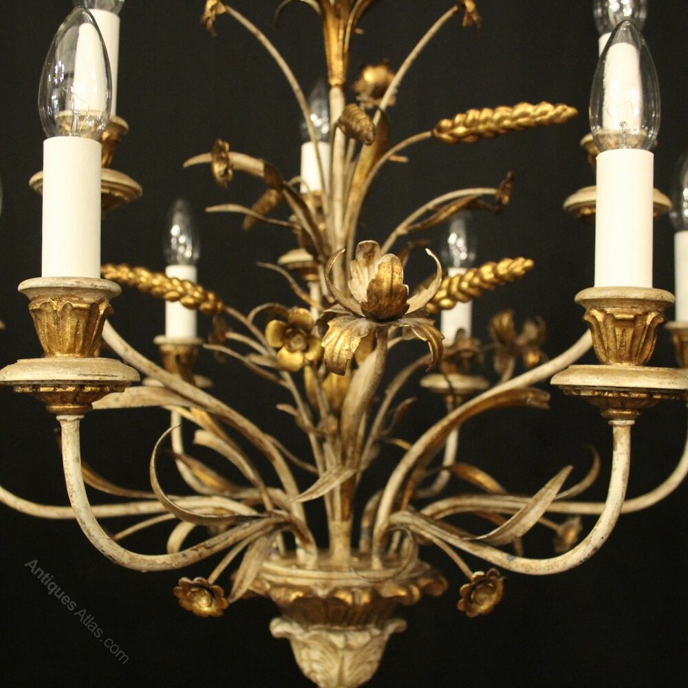 A French carved wooden polychrome 9 light double tiered antique chandelier, the floral toleware leaf scrolling arms with carved wooden bobeche drip pans and bulbous leaf candle sconces, issuing from an elaborate toleware flower, wheatsheaf and leaf centre, having the original chain and ceiling rose, lovely patination with original faded coloration. Fully rewired and PAT tested. All our chandeliers come with ceiling fixings and spare bulbs.Dimensions: H: 24"/61cm W: 24"/61cm Excluding Chain & Rose