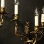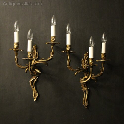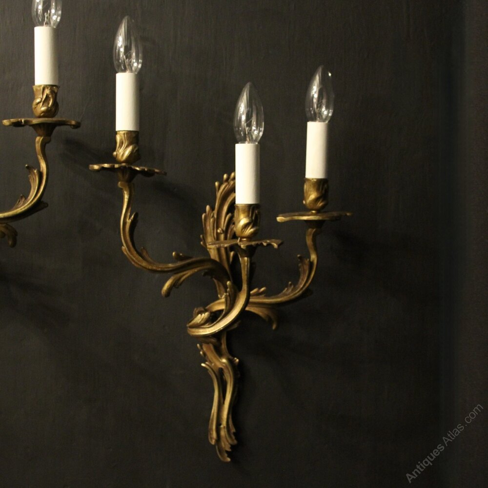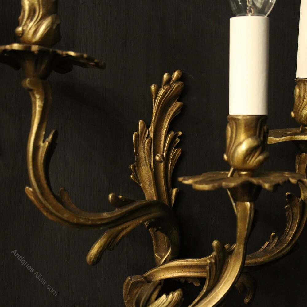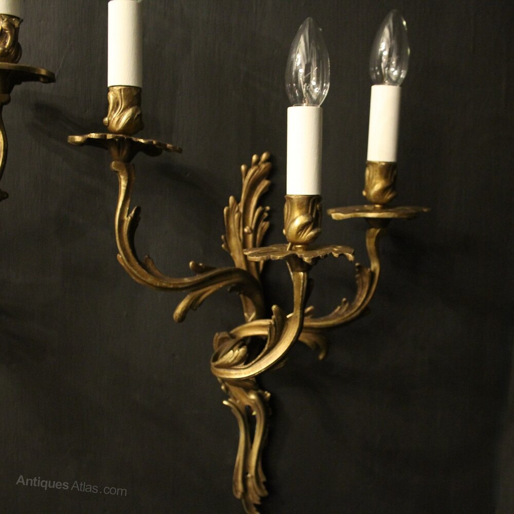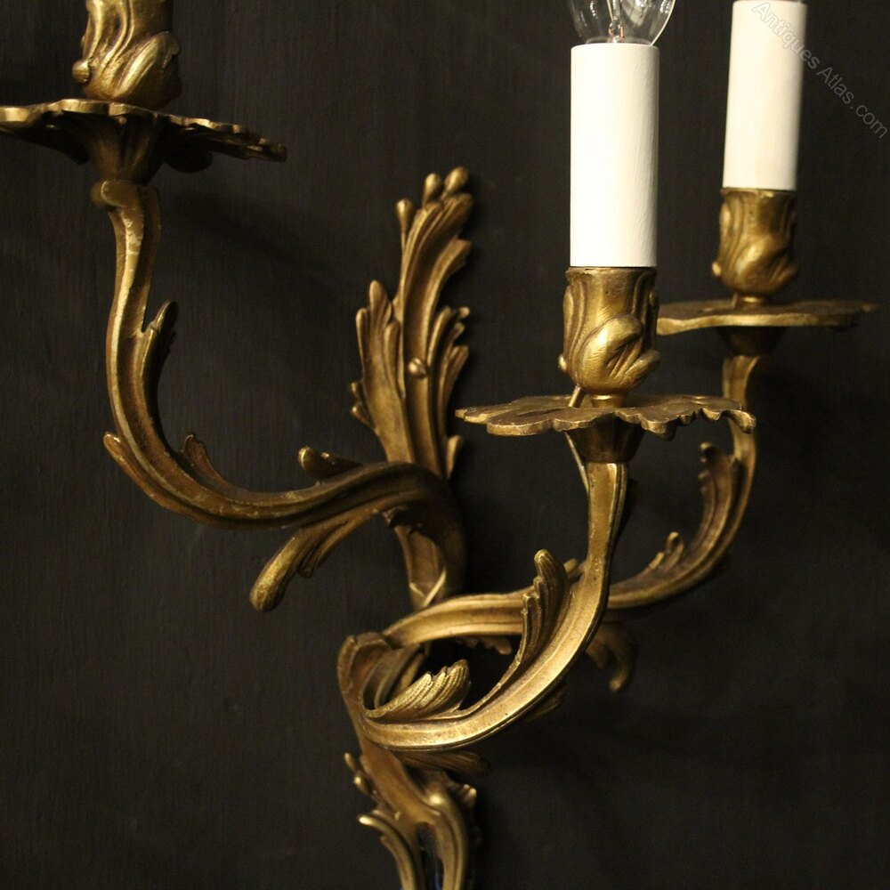 A French pair of gilded bronze triple arm antique wall sconces, the stepped leaf clad scrolling arms with pierced leaf bobeche drip pans and leaf bulbous candle sconces, issuing from an opposing elongated leaf backplate. Fully rewired and PAT tested. All our wall lights come with aged brass screws for fixing and spare bulbs.Dimensions: H: 22"/56cm W: 13"/33cm D: 7"/18cm