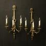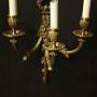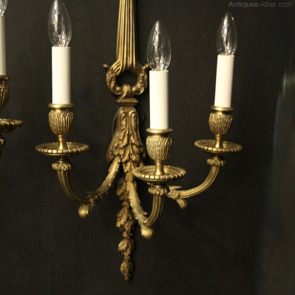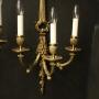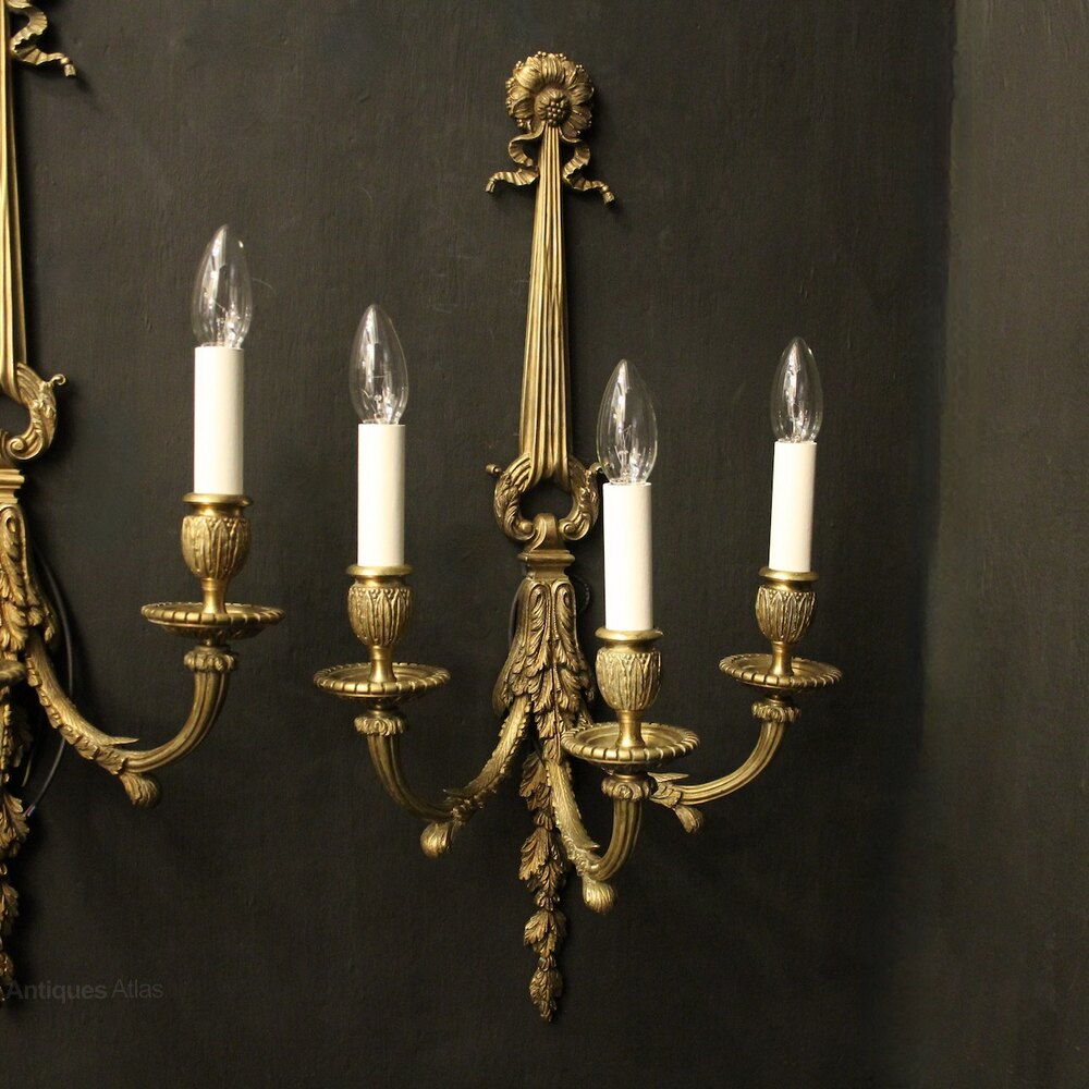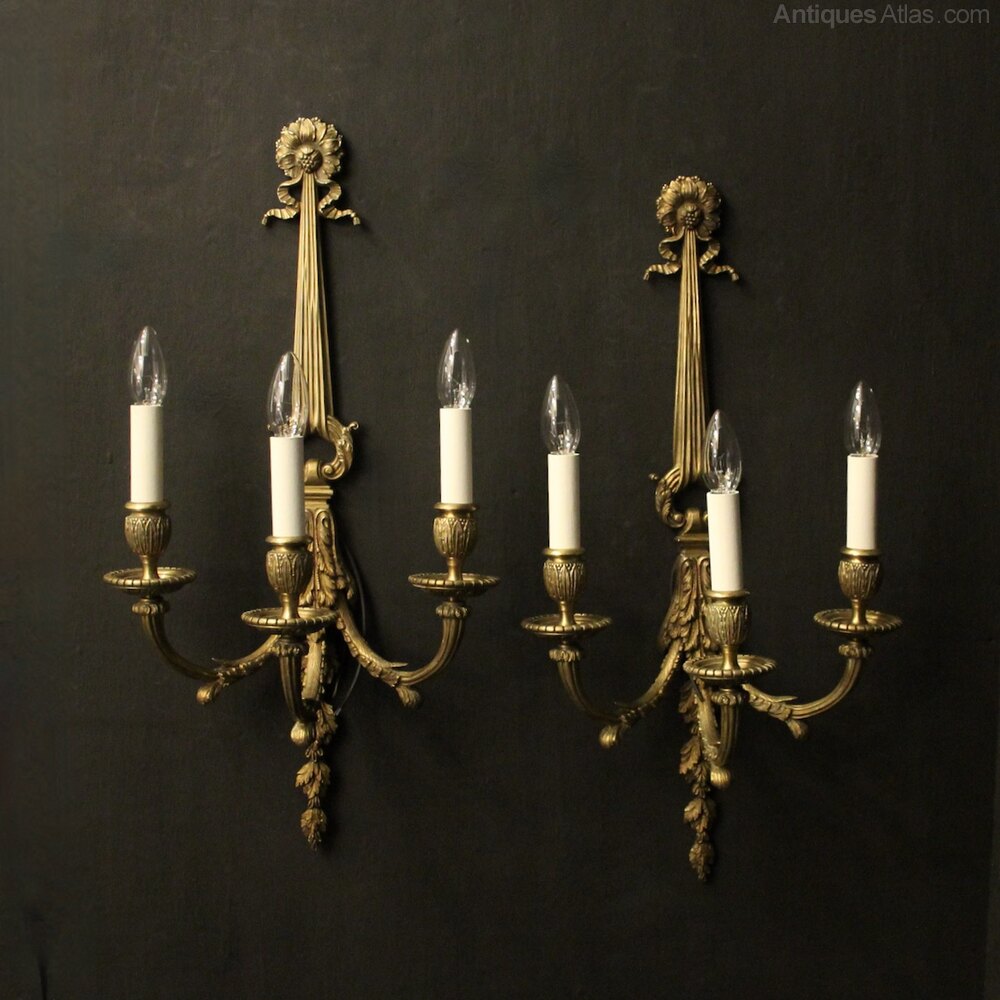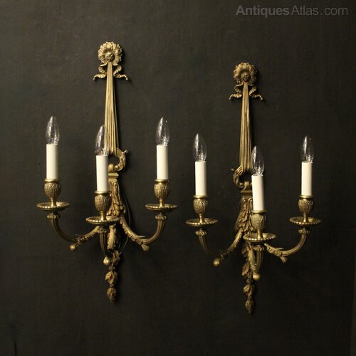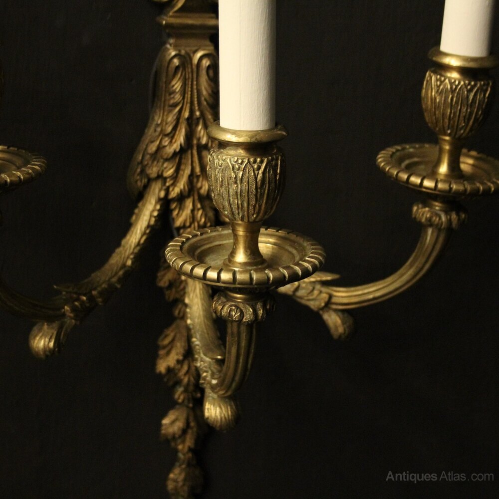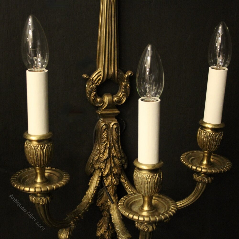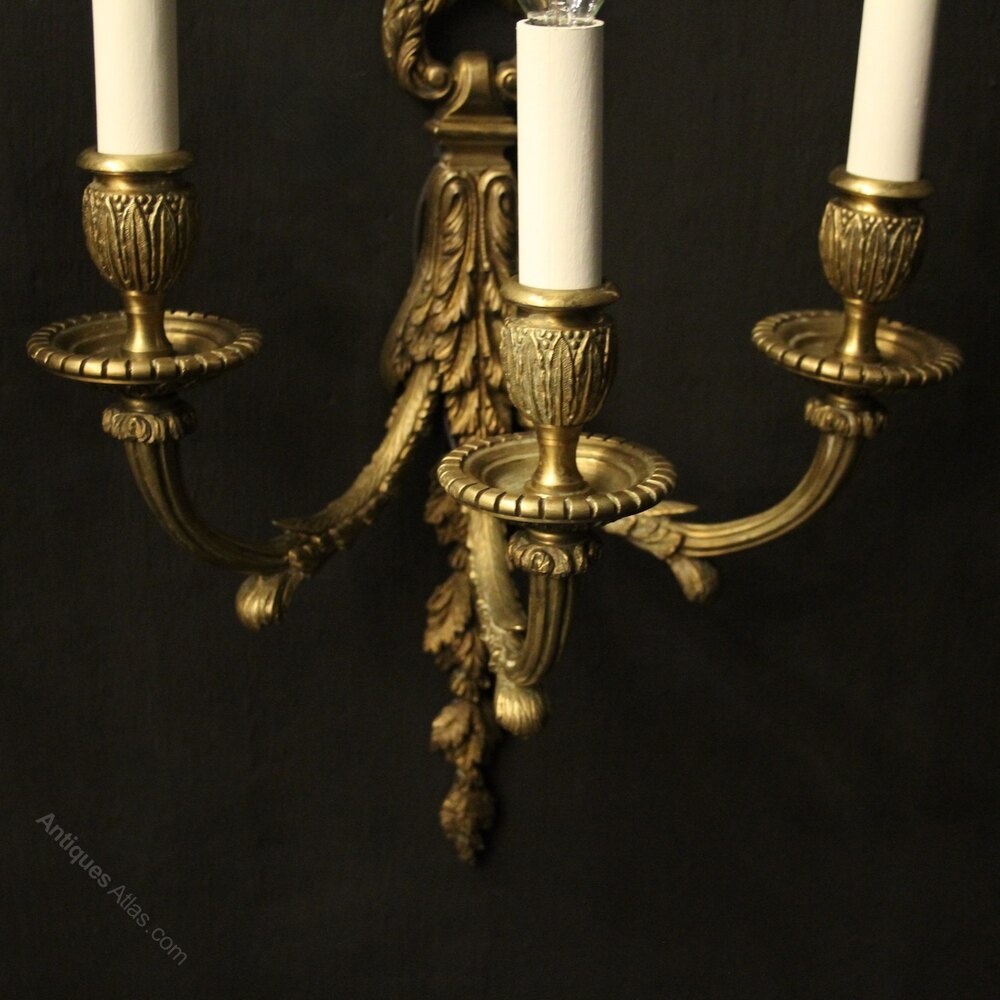 A nice quality French pair of gilded bronze triple arm antique wall sconces, the reeded leaf clad scrolling arms with circular sectional bobeche drip pans and bulbous leaf candle sconces, issuing from an ornate reeded tapering backplate with flower and ribbon finial, lovely original patination and very well cast. Fully rewired and PAT tested. All our wall lights come with aged brass screws for fixing and spare bulbs.Dimensions: H: 27"/69cm W: 14"/36cm D: 8"/20cm
