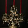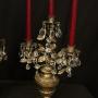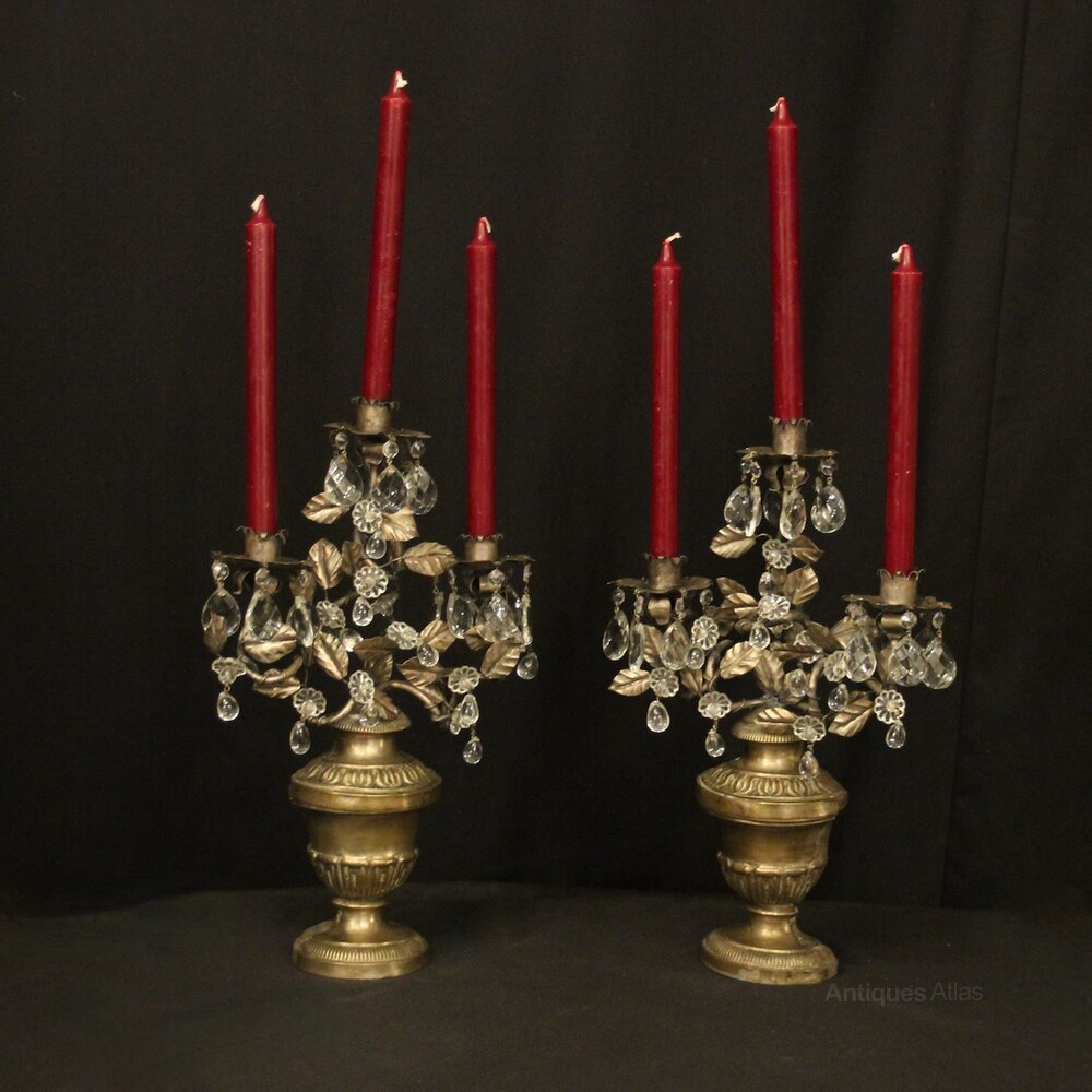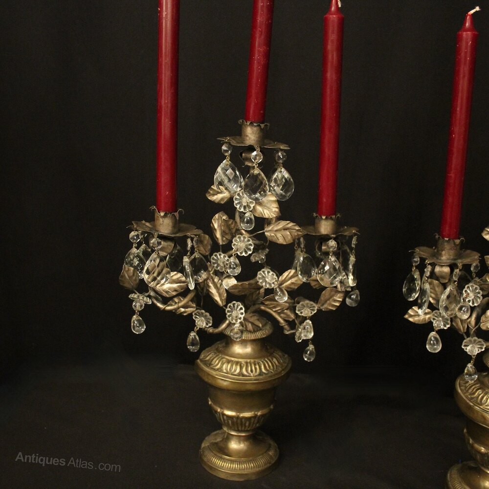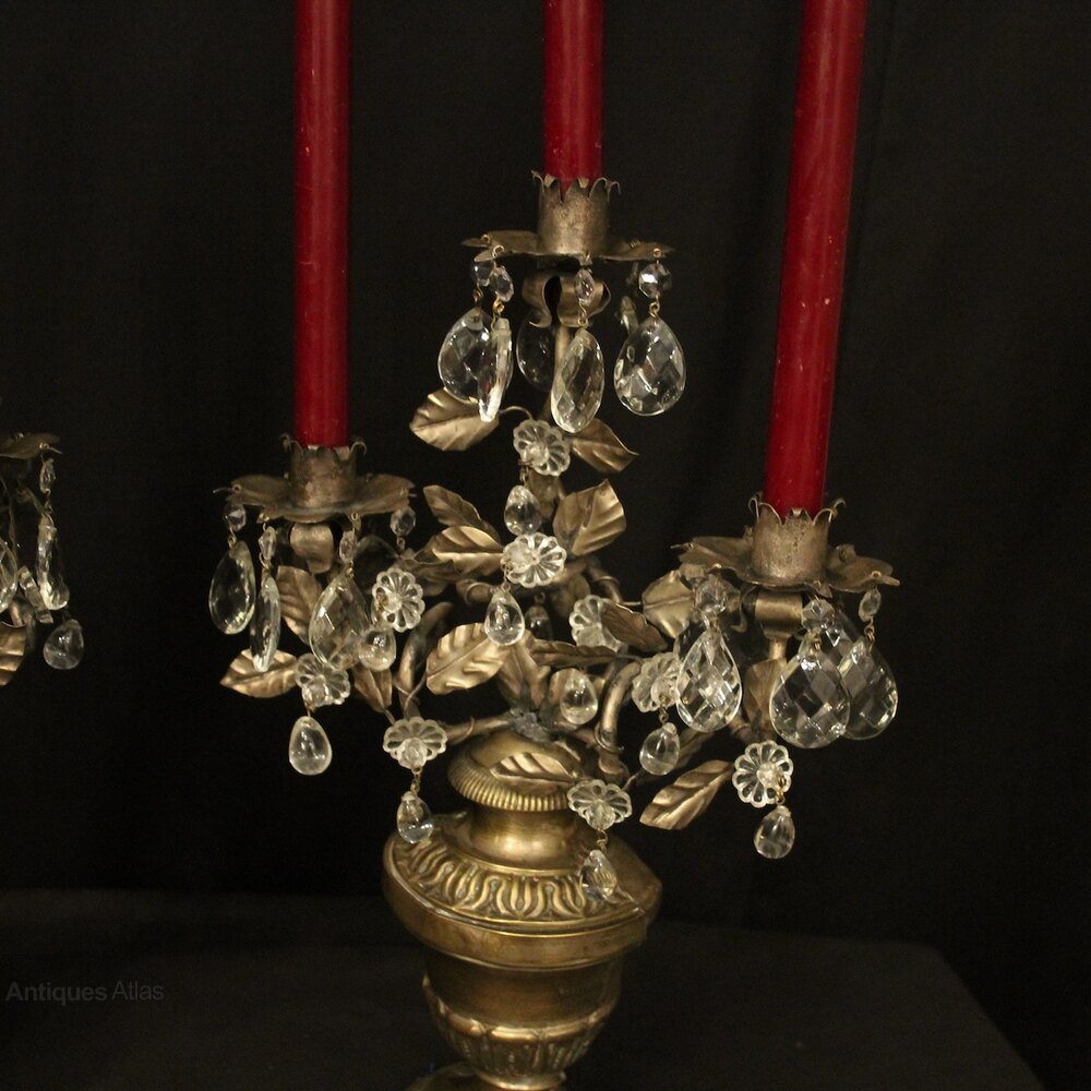 An Italian Genoa silvered and cut glass triple light antique candelabra, the three silvered leaf scrolling arms with leaf bobeche drip pans and candle sconces, issuing from a repousse silver and giltwood column with reeded base, decorated overall with faceted cut glass pendants, nice original patination. They can also sit of the wall as wall lights. For candle use only.Dimensions: H: 17"/43cm W: 11"/28cm D: 4"/10cm