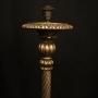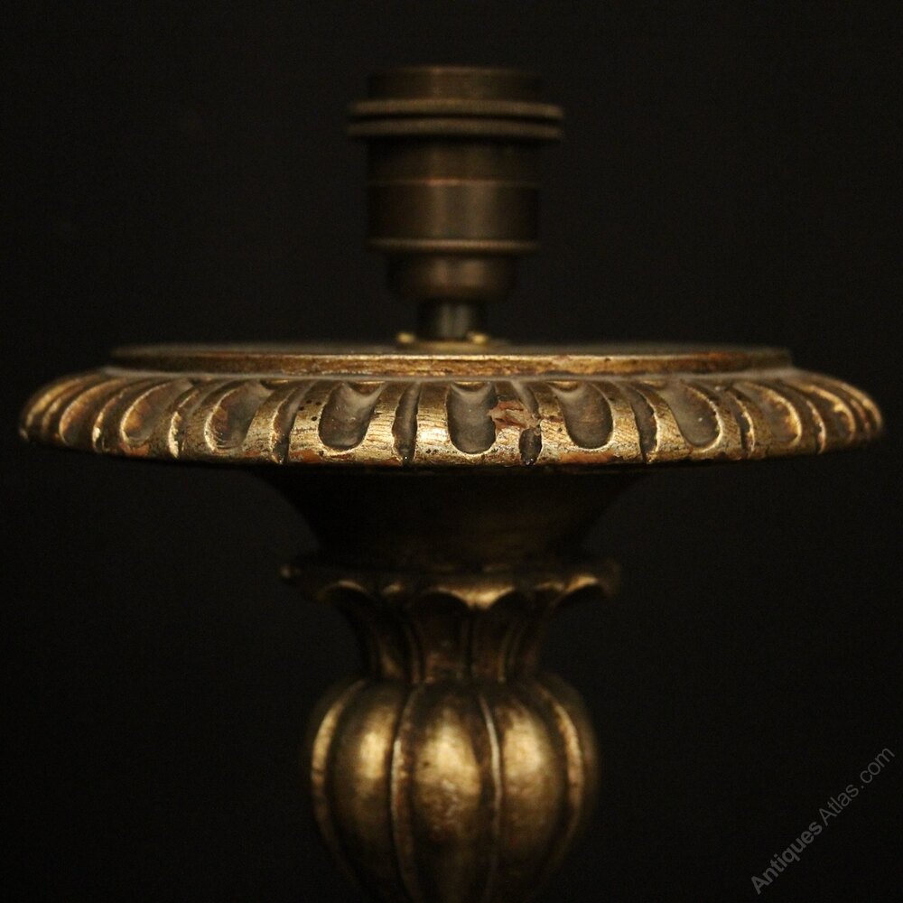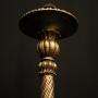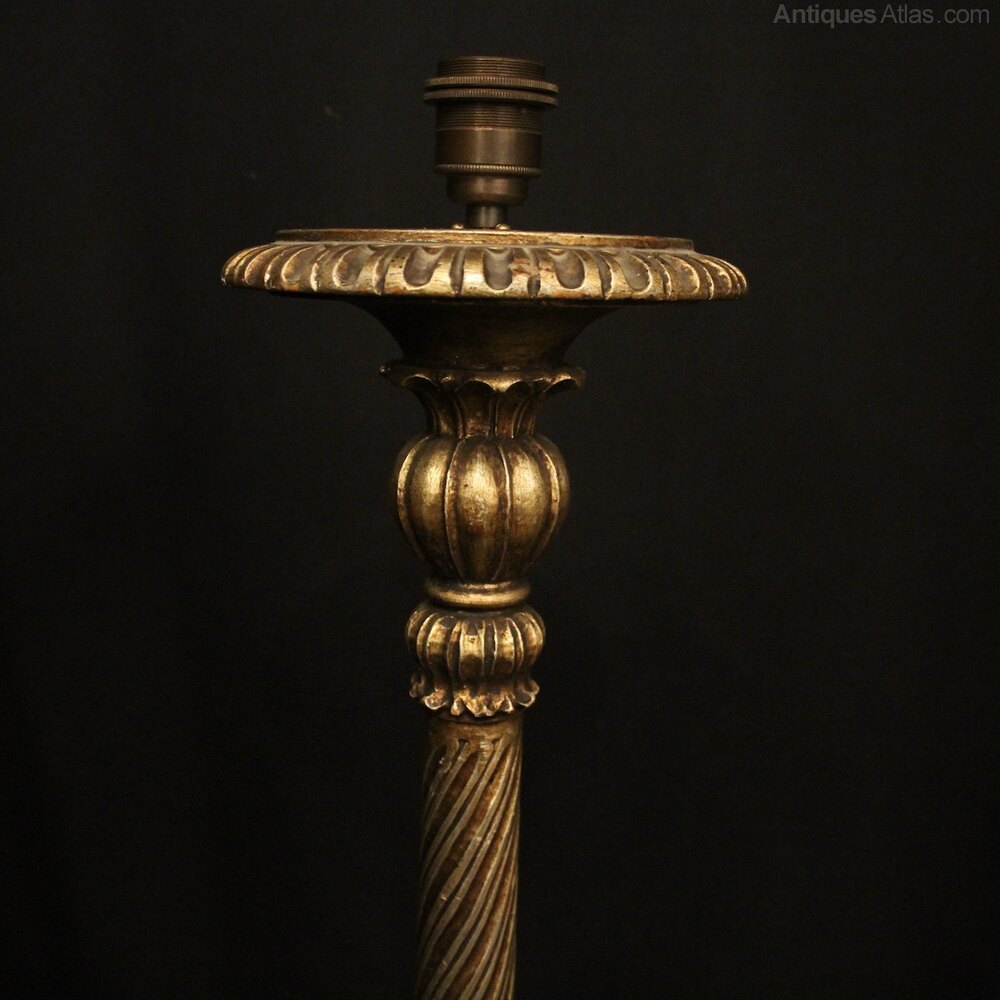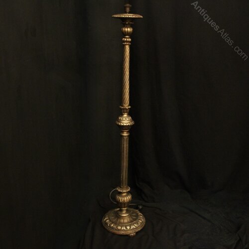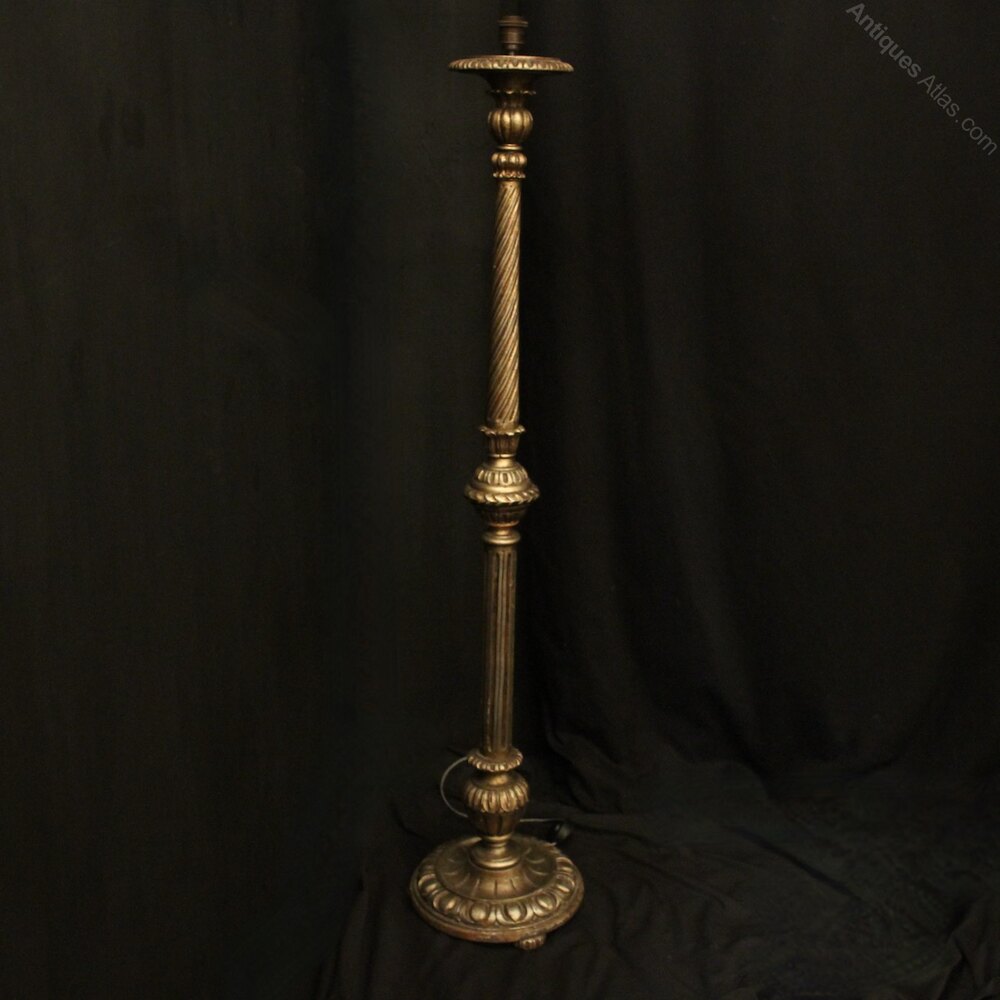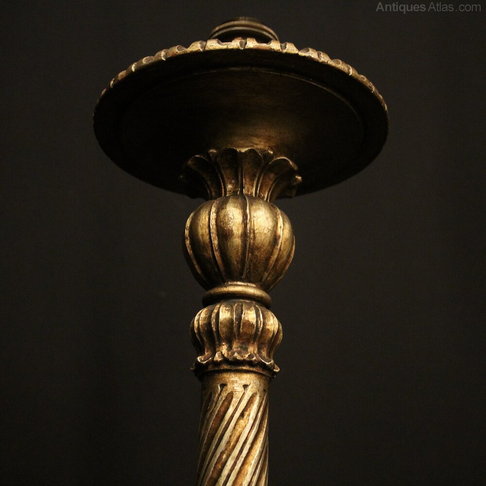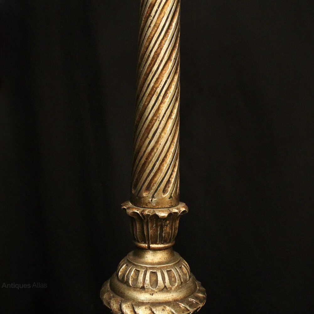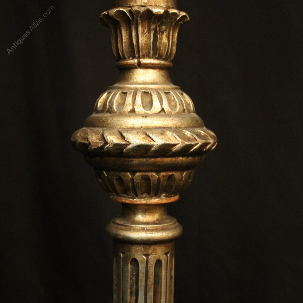 A French silver giltwood antique standard lamp, the bulbous reeded circular top sitting above a barley twisted giltwood column with foliated sectional centre and reeded bottom column with circular ornate scalloped base with three reeded feet. Fully rewired and PAT tested with foot switch.Dimensions: H: 60"/153cm W: 12"/31cm Excluding Chain & Rose