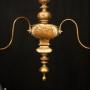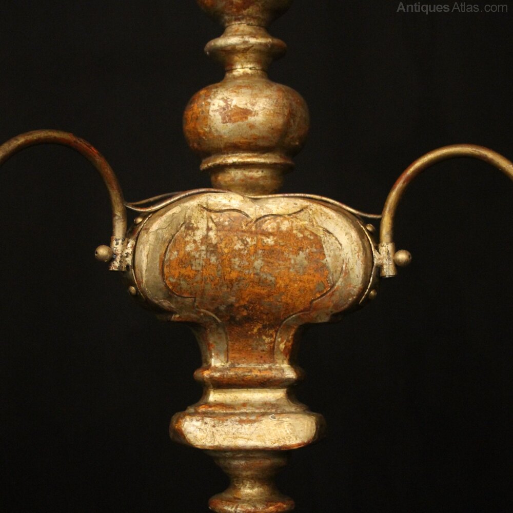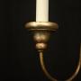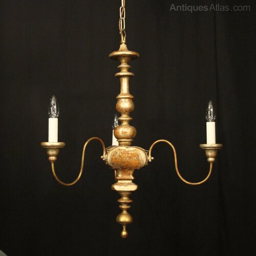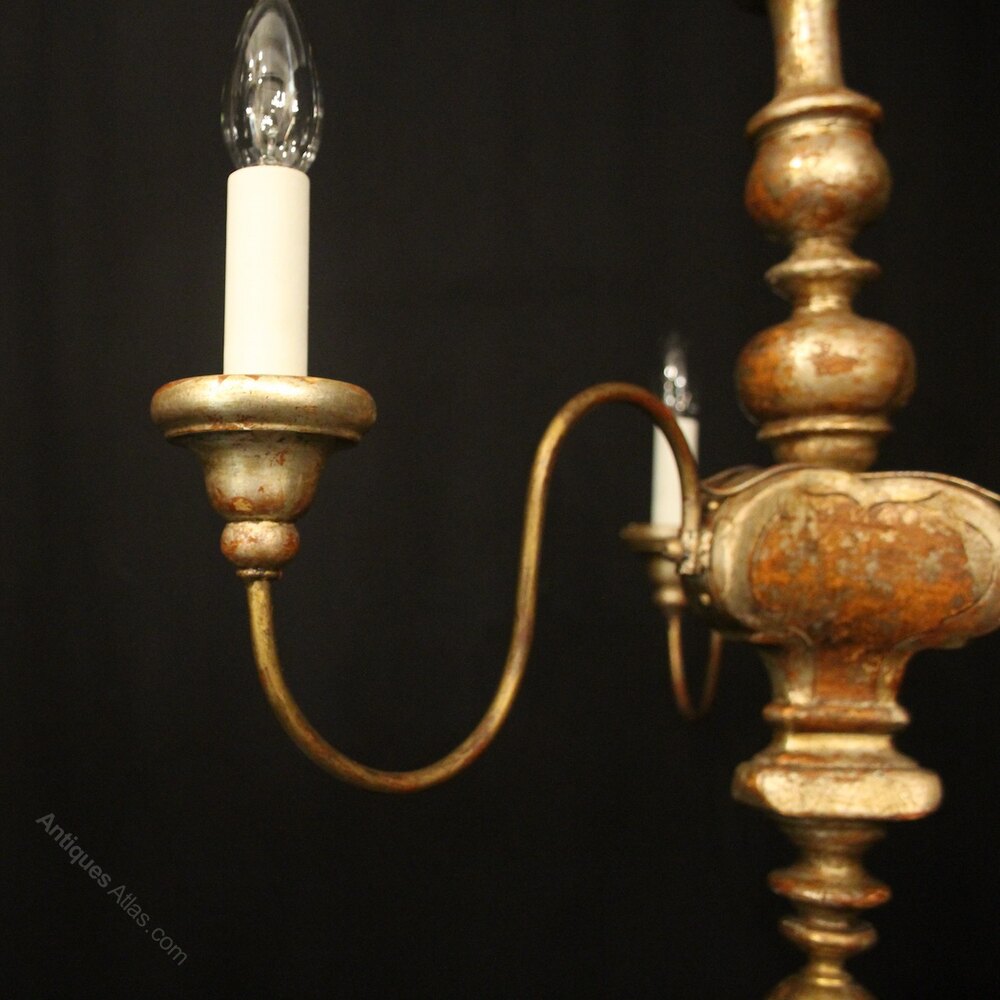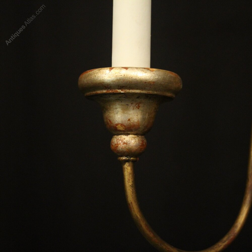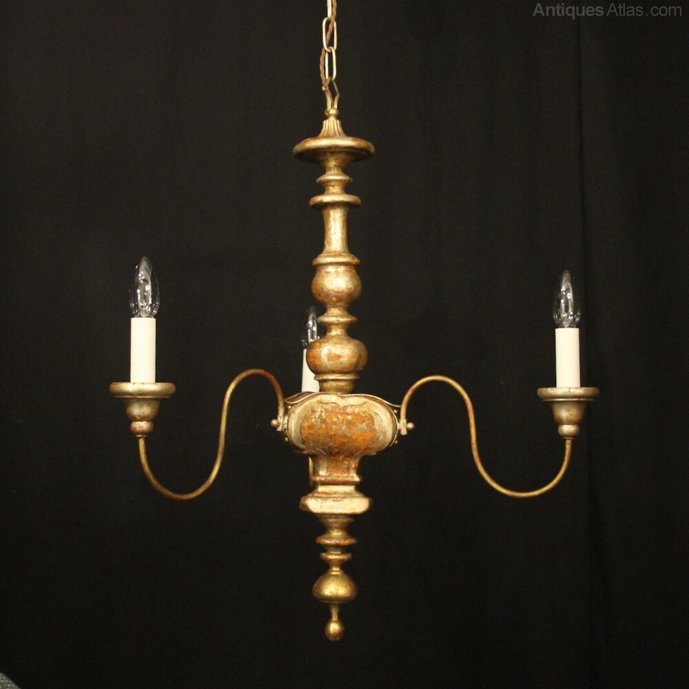 A decorative Italian gilded Florentine carved giltwood triple light antique chandelier, the simple toleware scrolling arms with trumpet silver giltwood bobeche drip pans, issuing from a tapering decorative silver giltwood central column, having the original chain and ceiling rose. Originally candle and converted to electricity. Fully rewired and PAT tested. All our chandeliers come with ceiling fixings and spare bulbs.Dimensions: H: 28"/71cm W: 24"/61cm Excluding Chain & Rose