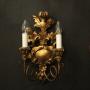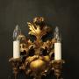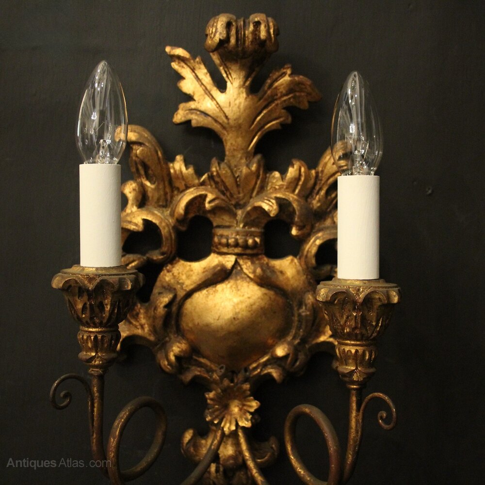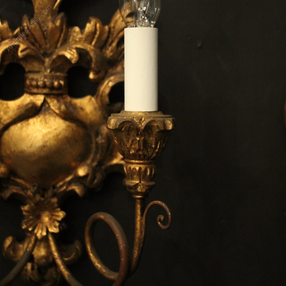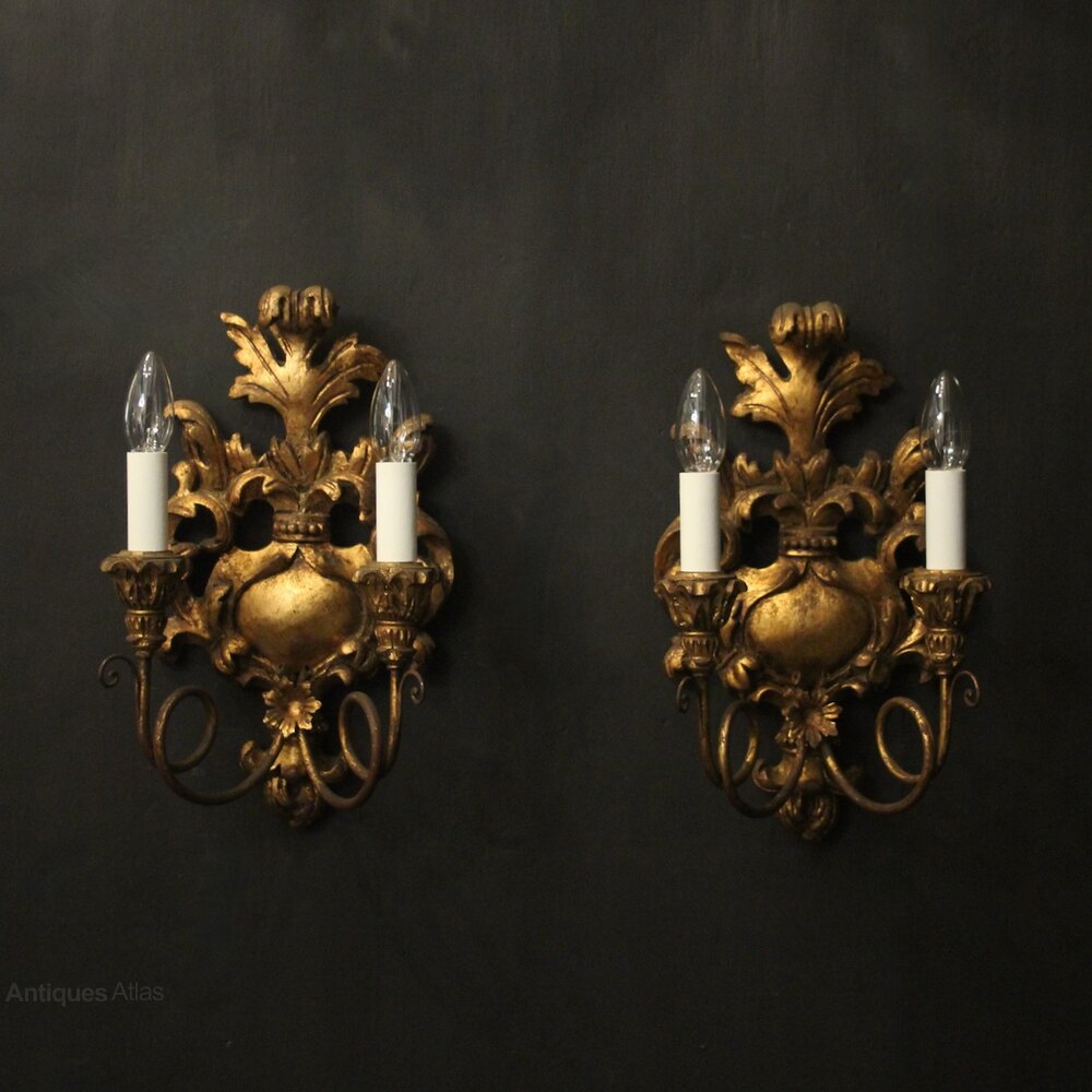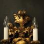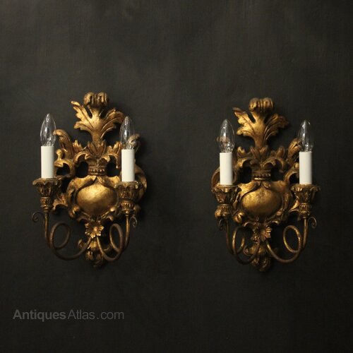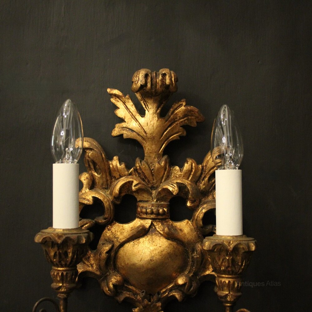 A nice French pair of carved giltwood and Toleware twin arm antique wall lights, the scrolling toleware arms with ornate wooden candle sconces, issuing from a pierced Acanthus leaf gilded wooden backplate, very decorative with lovely original gilded patination. Fully rewired and PAT tested. All our wall lights come with aged brass screws or brackets for fixing and spare bulbs.Dimensions: H: 16"/41cm W: 10"/25cm D: 7"/18cm