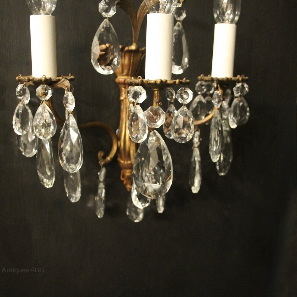 A French pair of gilded brass and crystal triple arm antique wall lights, the reeded scrolling arms with circular leaf bobeche drip pans, issuing from a reeded tapering backplate with leaf finial and decorated overall with crystal faceted pendants. Fully rewired and PAT tested. All our wall lights come with aged brass screws for fixing and spare bulbs.Dimensions: H: 13"/33cm W: 11"/28cm D: 7"/18cm