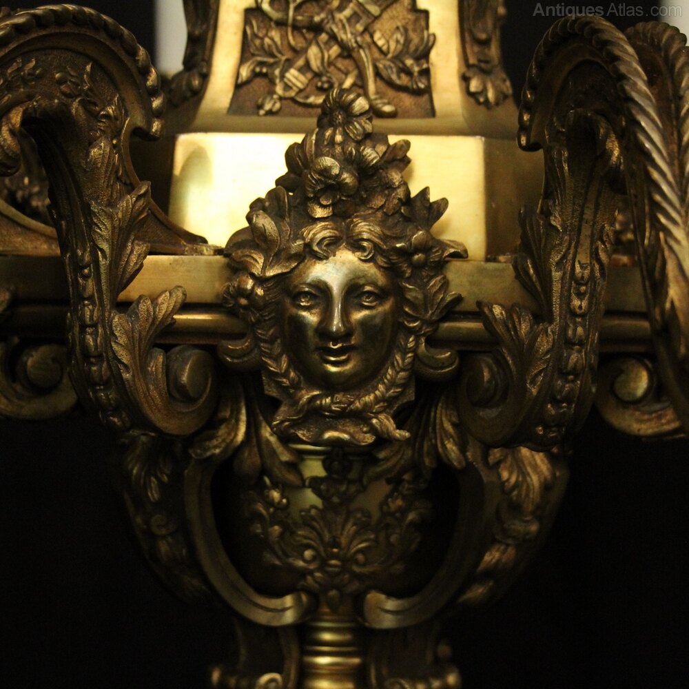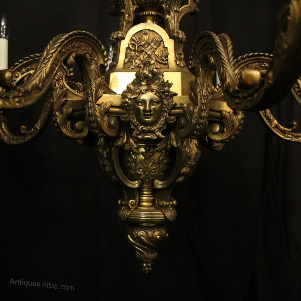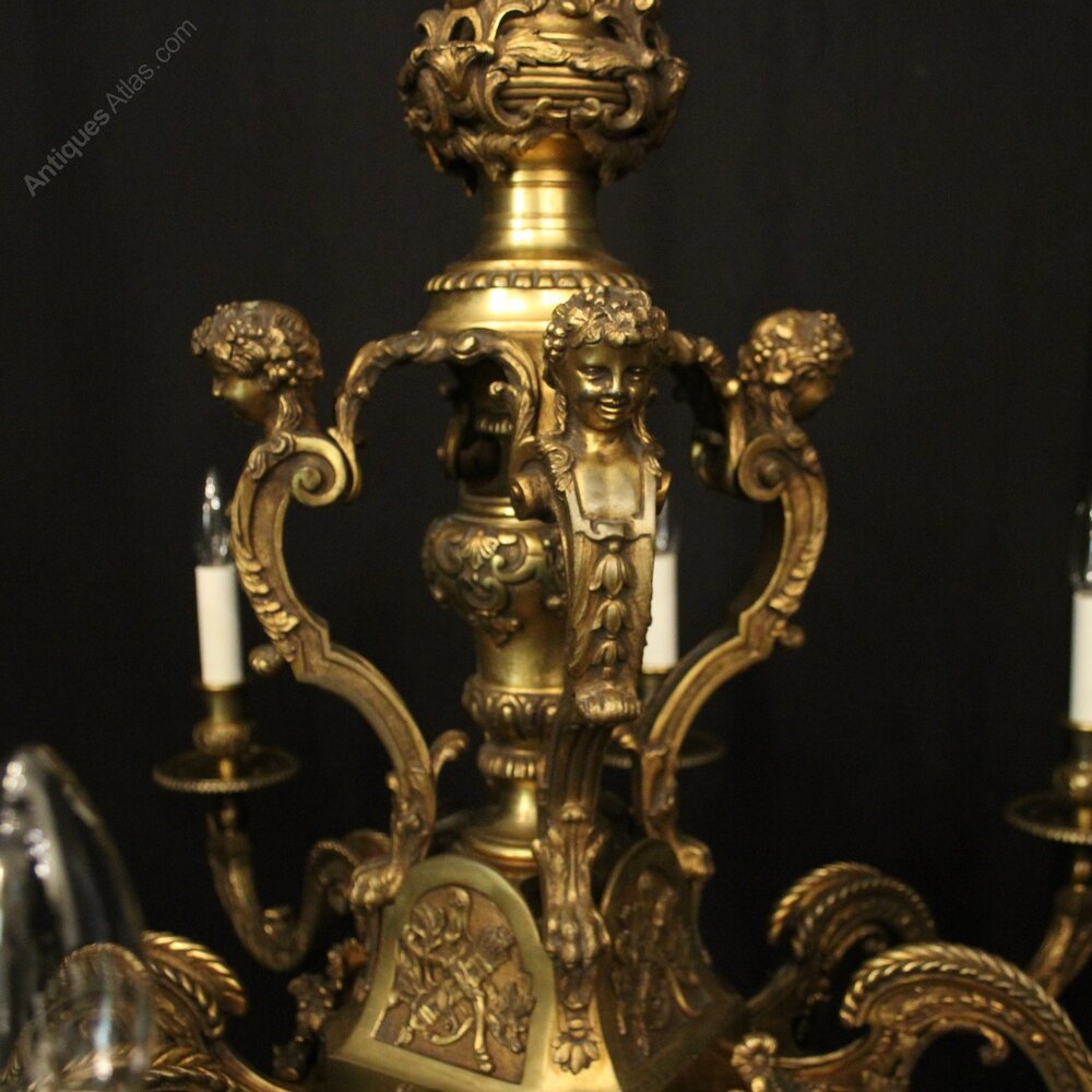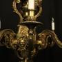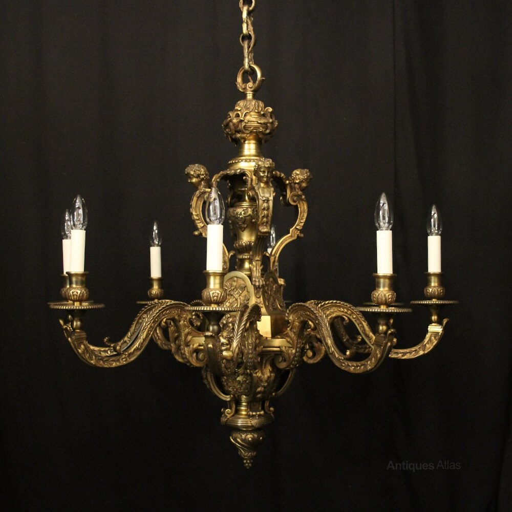 A quality French gilded bronze 8 light antique chandelier in the manner of Andre Charles Boulle, the ornate cast square gauge scrolling arms with millgrain circular bobeche drip pans and bulbous candle sconces, issuing from a pierced central urn baluster stem with four cherubs and set below with decorative female mask heads with scallop base and twisted finial, excellent original faded gilded patination and fantastic casting, one of the best quality chandeliers that we have found. Fully rewired and PAT tested. All our chandeliers come with bulbs and ceiling fixings.Dimensions: H: 36"/92cm W: 36"/92cm Excluding Chain & Rose
