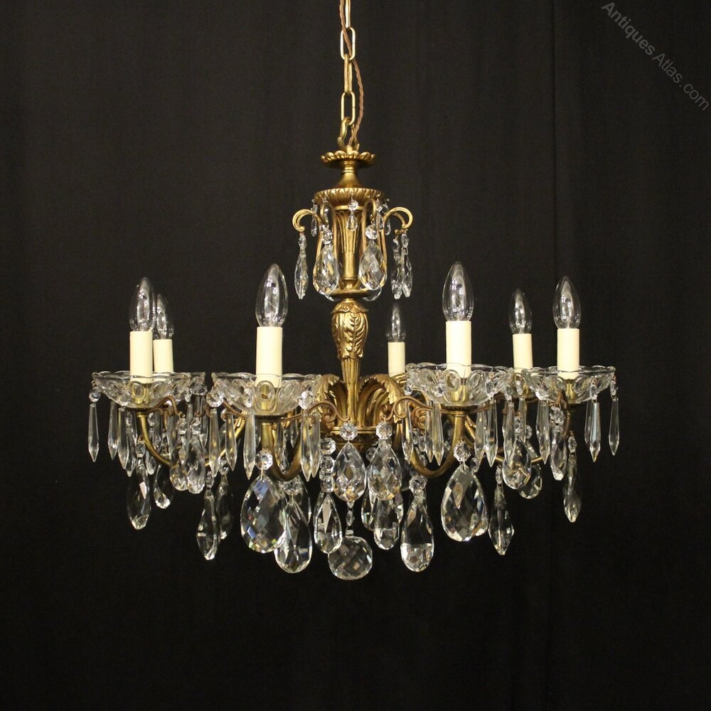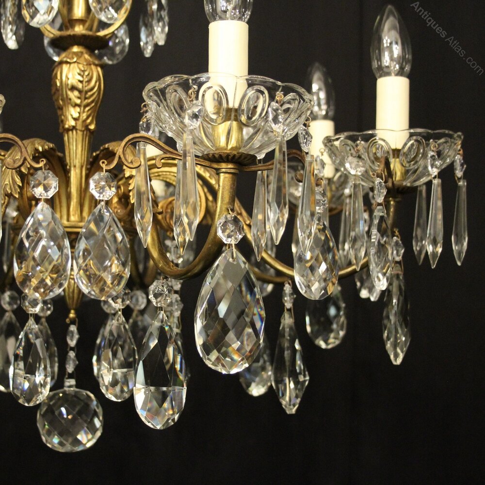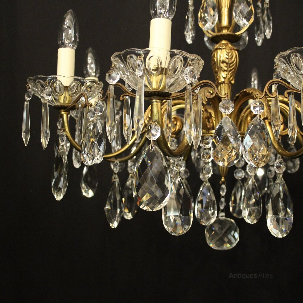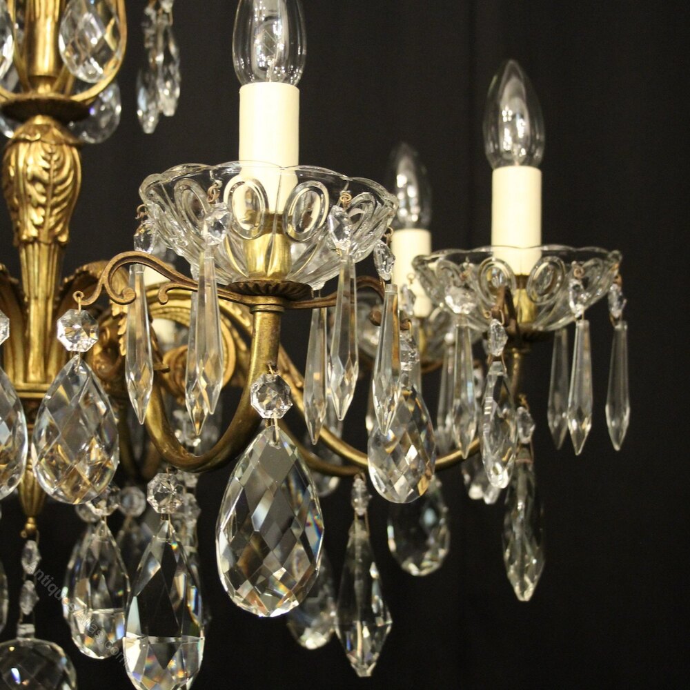 A French gilded bronze and crystal 8 light antique chandelier, the leaf scrolling arms with glass bobeche drip pans and candle sconces, issuing from a foliated leaf tapering central column with scrolling canopy, decorated overall in faceted crystal pendants and having the original chain and ceiling rose. Lovely original crisp gilded patination and good wide proportions. Fully rewired and PAT tested. All our chandeliers come with ceiling fixings and spare bulbs.Dimensions: H: 26"/66cm W: 29"/74cm Excluding Chain & Rose
