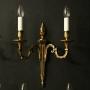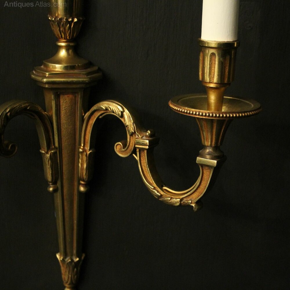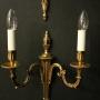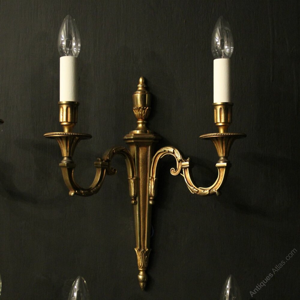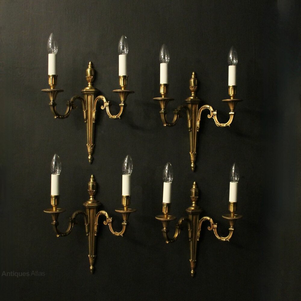 A French set of 4 gilded brass twin arm antique wall lights, the leaf clad square gauge scrolling arms with trumpet reeded millgrain bobeche drip pans and reeded candle sconces, issuing from a leaf tapering backplate with urn finial. All stamped L.G for by Lucian Gau, great quality French lighting company. Fully rewired and PAT tested. All our wall lights come with aged brass screws or brackets for fixing and spare bulbs.Dimensions: H: 18"/46cm W: 12"/31cm D: 5"/13cm