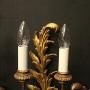 A decorative set of 4 French gilded giltwood twin arm antique wall lights, the toleware metal leaf scrolling arms with wooden bobeche drip pans, issuing from a carved opposing giltwood leaf backplate, lovely original patination. Fully rewired and PAT tested. All our wall lights come with aged brass screws for fixing and spare bulbs.Dimensions: H: 14"/36cm W: 7"/18cm D: 5"/13cm
