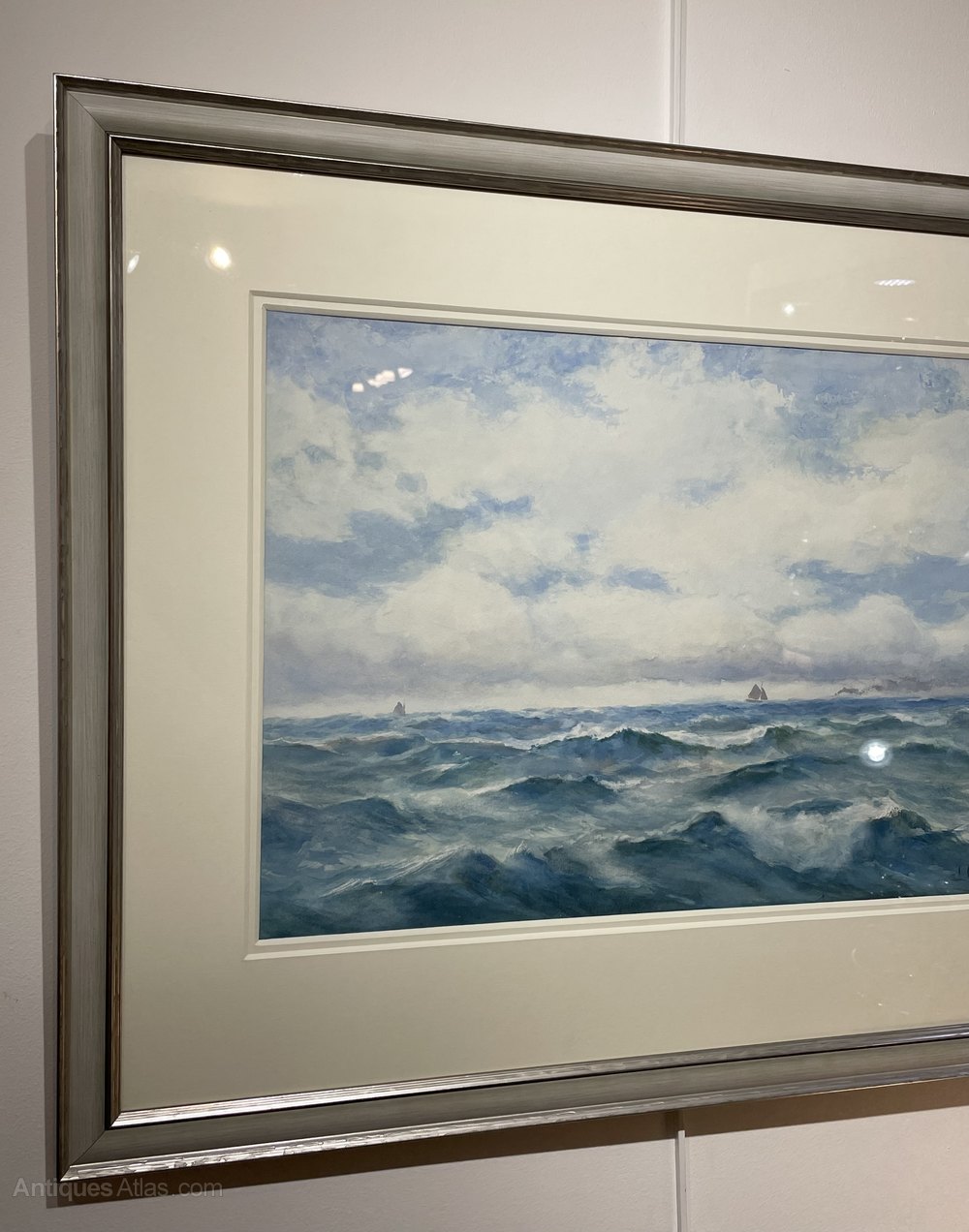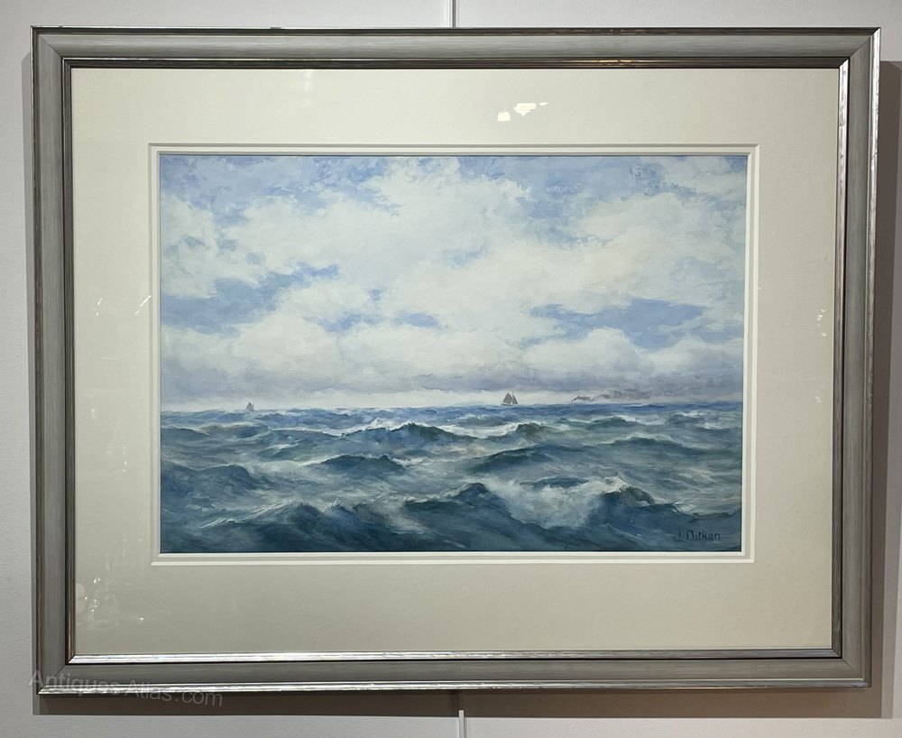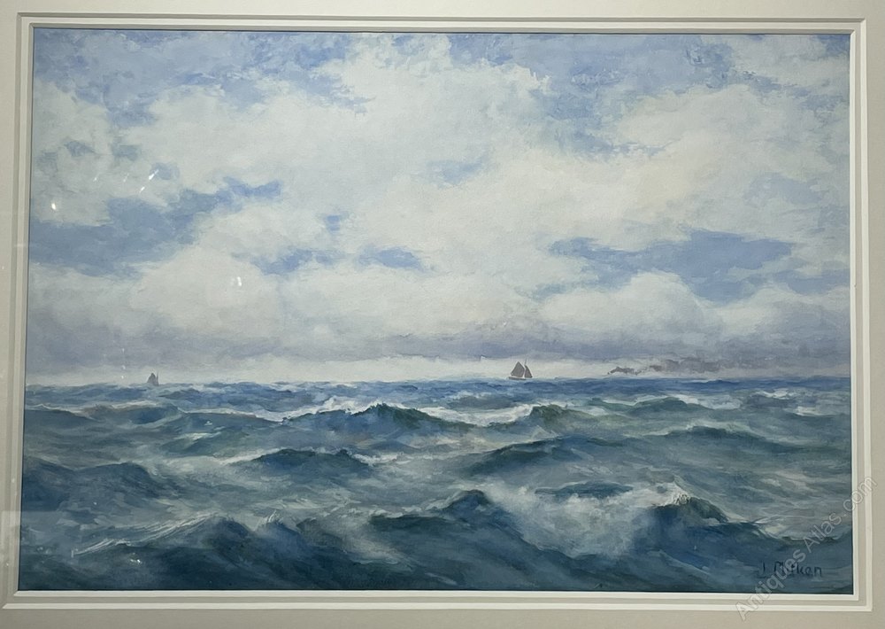 A particularly good marine watercolour by James Aitken (1853 - 1935). A good large and bright example, depicting the rough sea with a paddle steamer and sailing ship on the horizon. Circa 1890This watercolour has been professionally and sensitively cleaned, retaining the vibrant blue colours. It has also been re-framed in a contemporary style frame and mounted to the highest of standards.